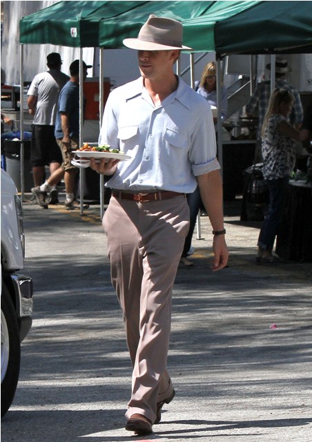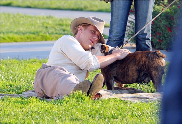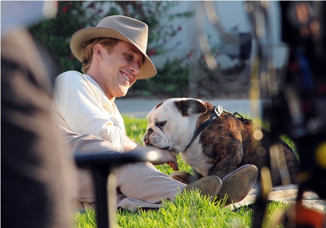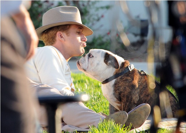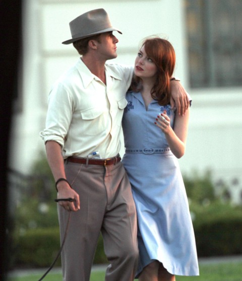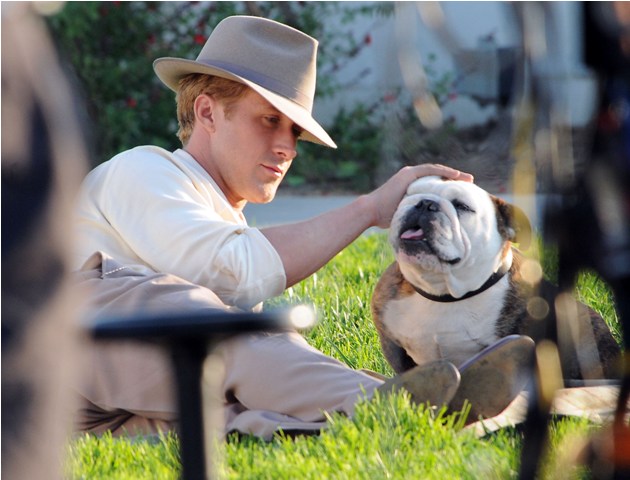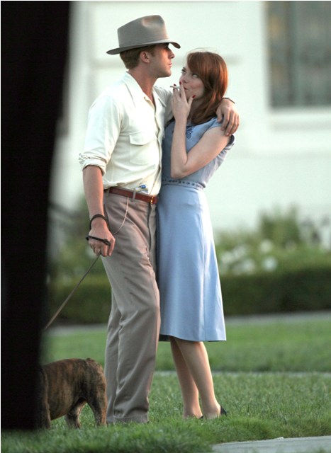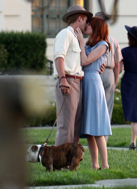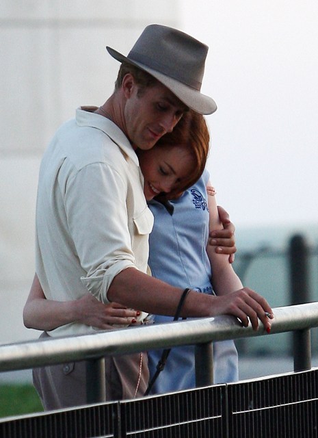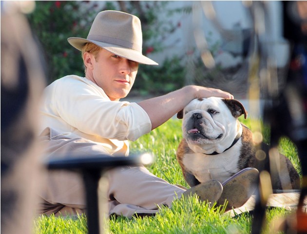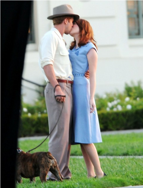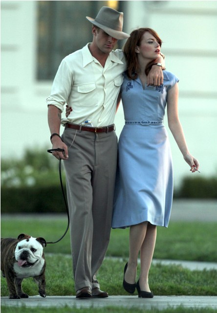 Aside from the bulldog, Ryan was also working on the set of Gangster Squad yesterday with Emma Stone. The way he’s dressed and the way she’s dressed, and her red hair and the era a little bit it reminds me of The Notebook. Acting is sometimes so f-cked up to me. I mean, look at them. They look hot. And they look like they’re really, really in love. The body language, the leaning, the chemistry that’s firing off of them even in a photograph... and this is only pretend.