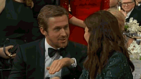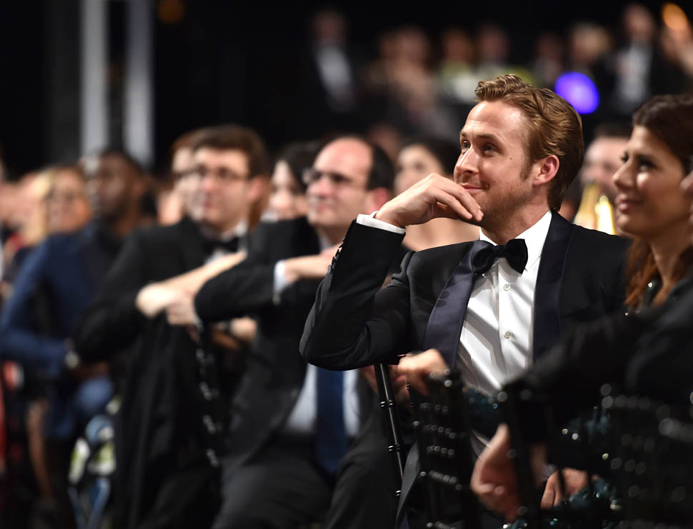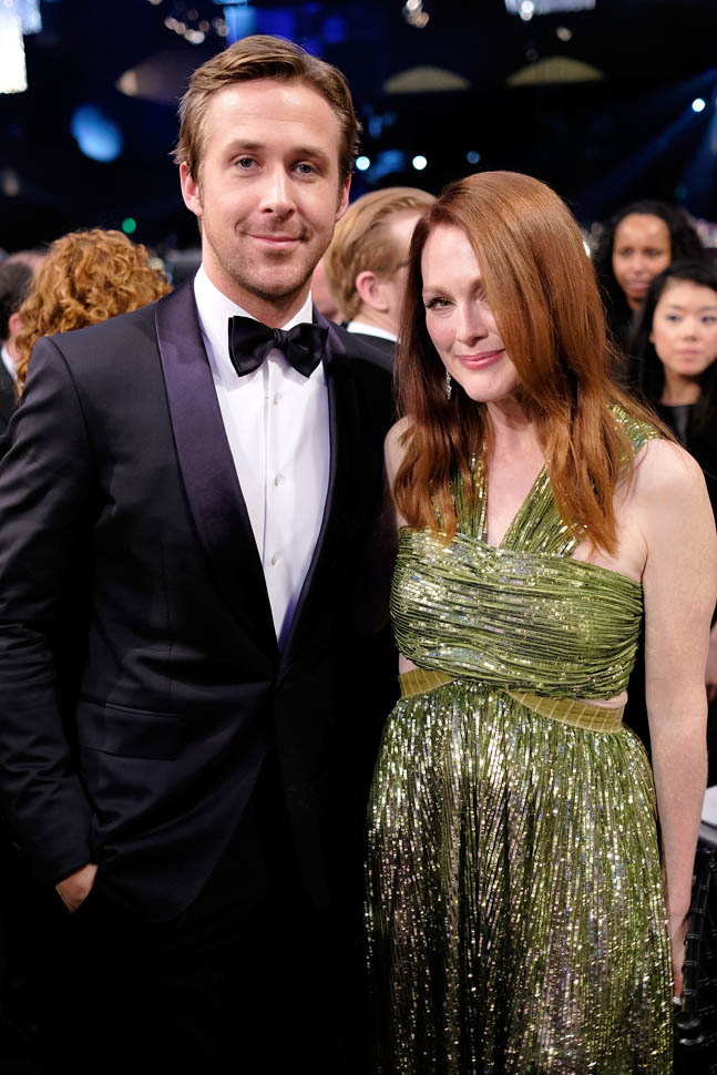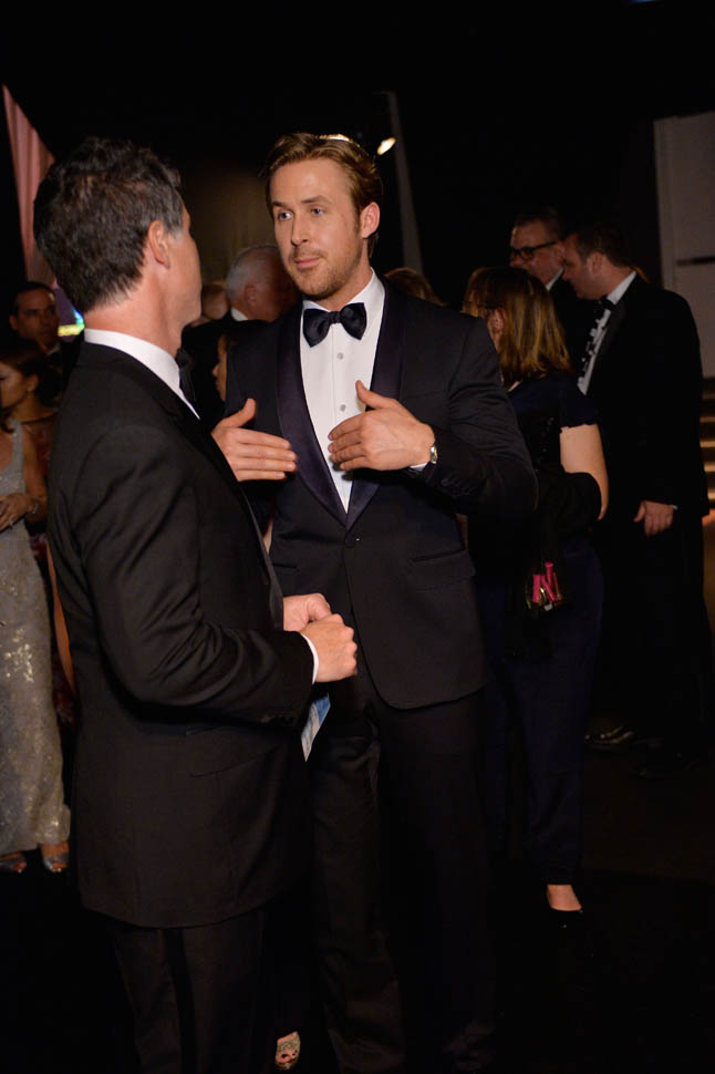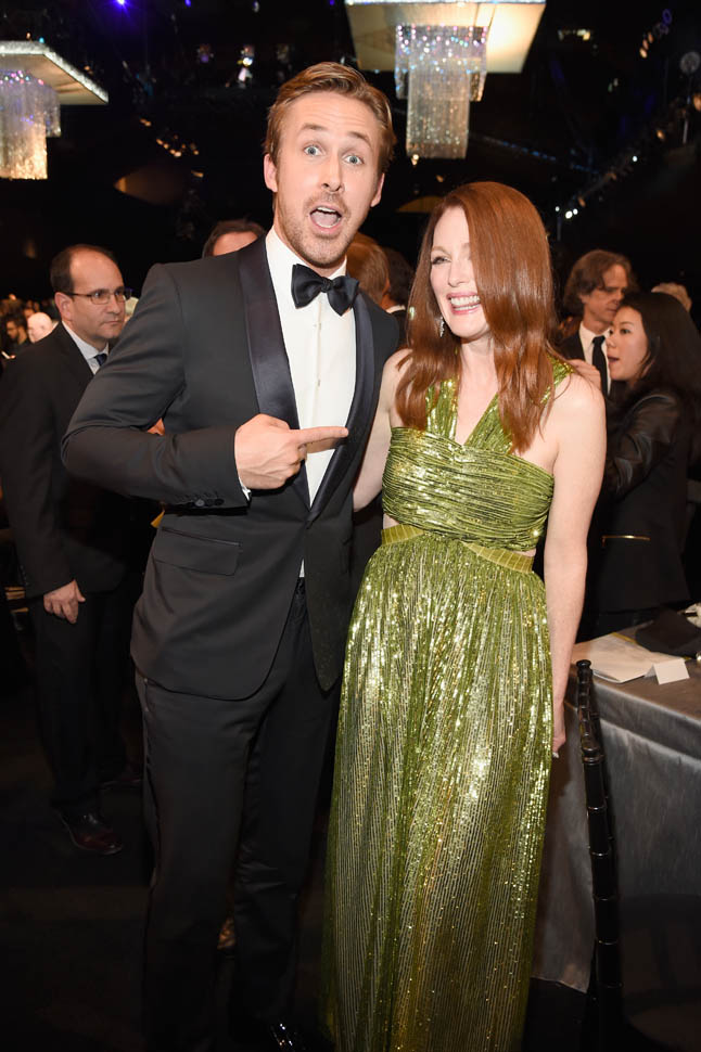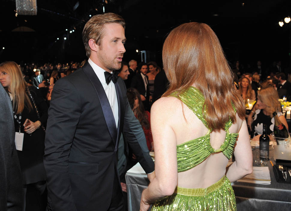They weren’t seated very close to each other at all at the SAGs. Ryan was, however, hanging out with Marisa Tomei. They worked together on The Ides Of March. At one point, the camera cut away to them talked. This is what it looked like: