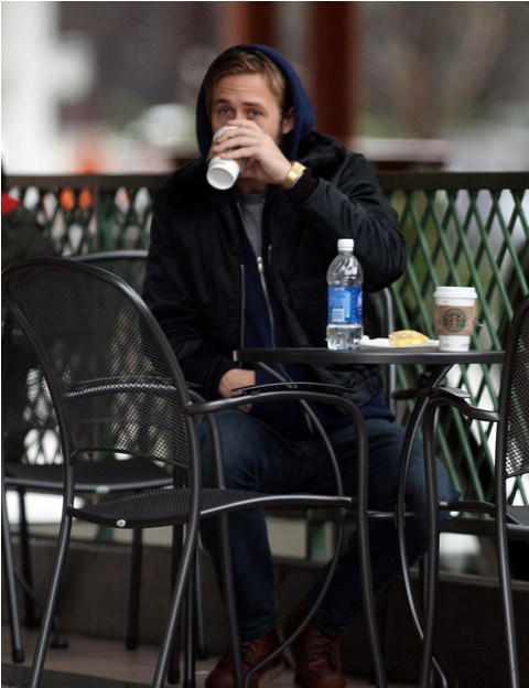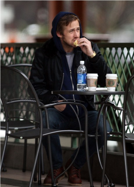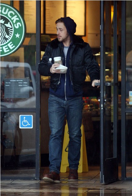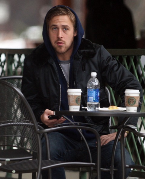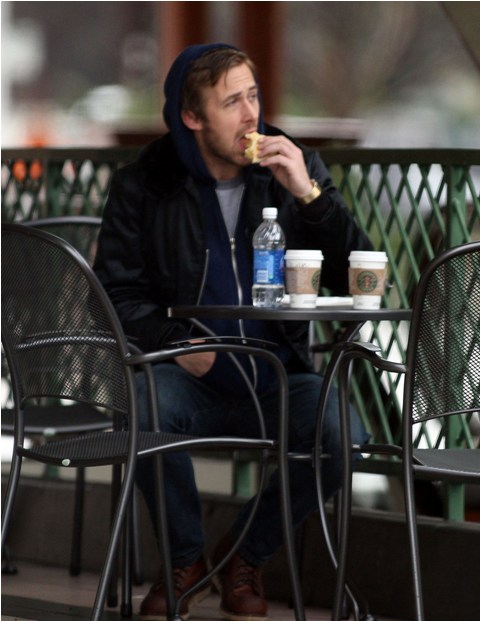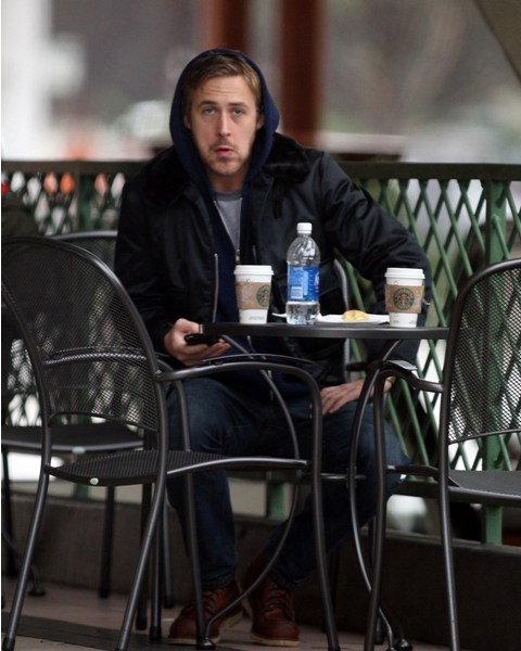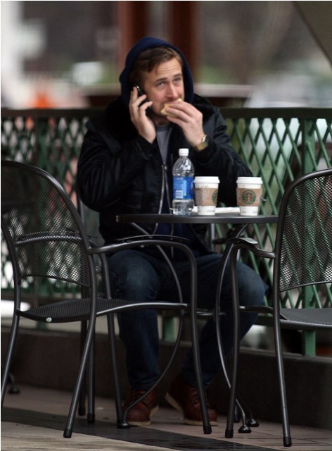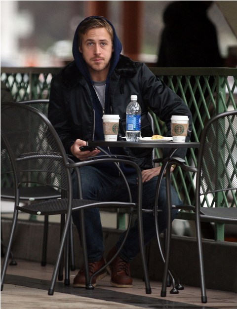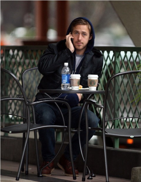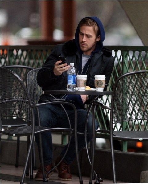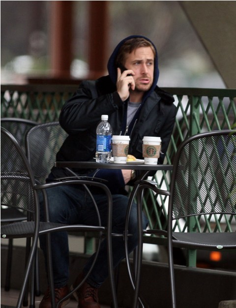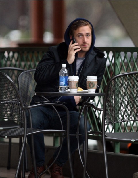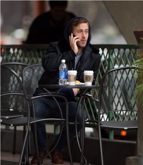 Ryan was in LA before heading to the festival. On his alone time he hit up a Starbucks for what looks like a double shot and a snack, and perhaps a fidgety phone call. When you’re alone and you think people are watching you, do pull out your blackberry and pretend?
