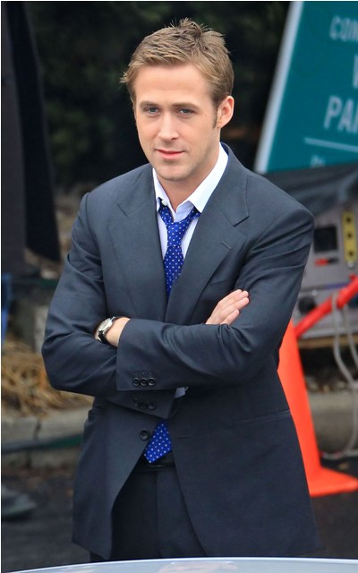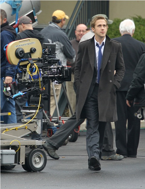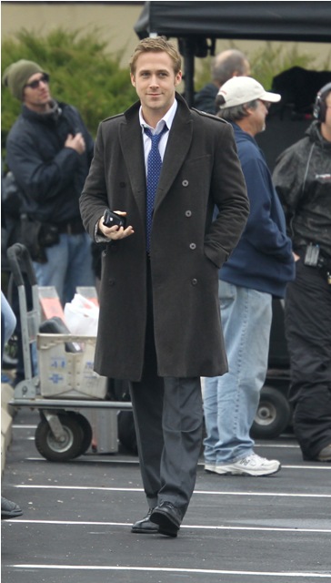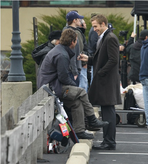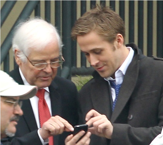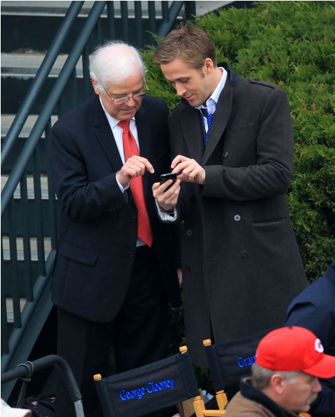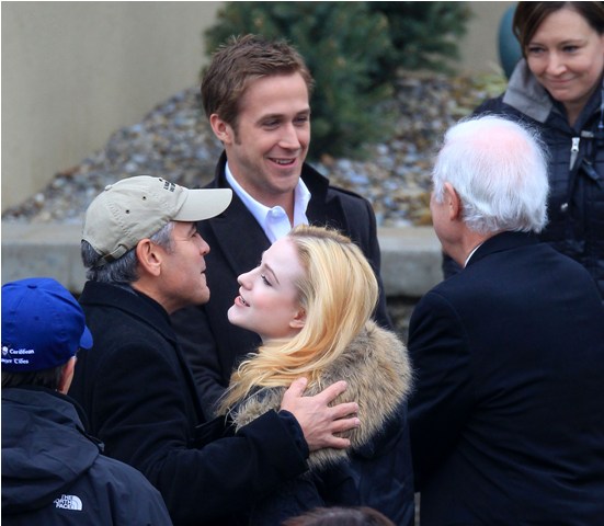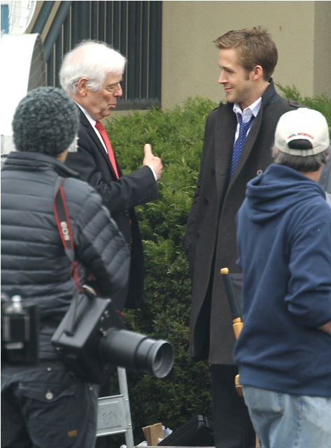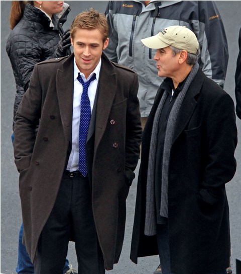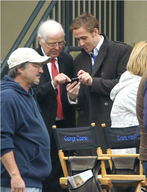 He may not be in LA but maybe Cincinnati is better. Check out these photos of Gosling on the set of The Ides of March with George Clooney whose parents came by for a visit yesterday. Look at the Ryan all charming and sh-t with the folks, like all afriendly with Clooney Senior, totally in with the Clooney situation. Someone is working it hard, non? Smart though. I mean, if Clooney’s on your side, it’s all good things.