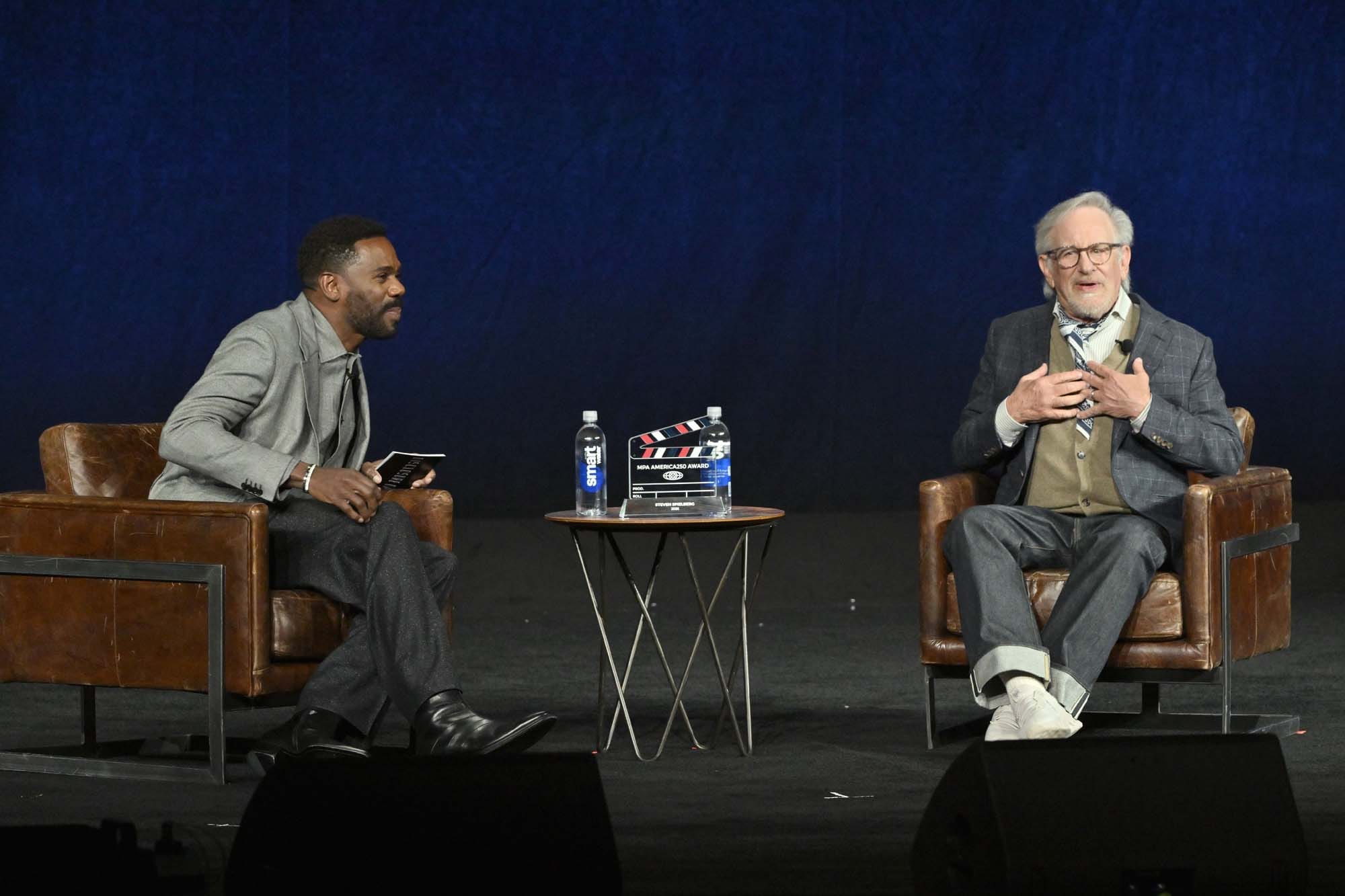 Colman Domingo and Steven Spielberg promote the upcoming film "Disclosure Day" at the Universal Pictures and Focus Features presentation at The Dolby Colosseum at Caesars Palace during CinemaCon, the official convention of Cinema United, on April 15, 2026 in Las Vegas, Nevada