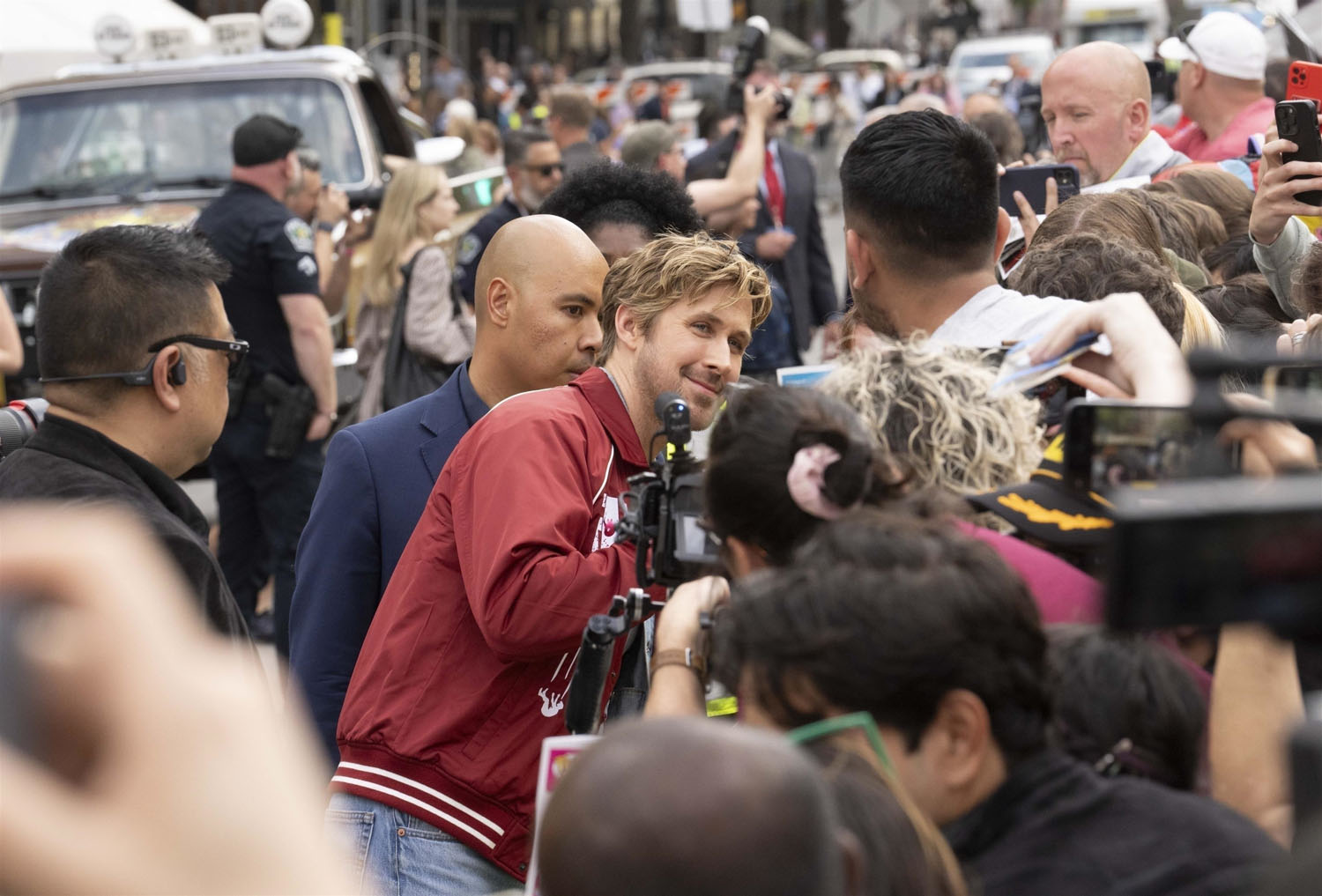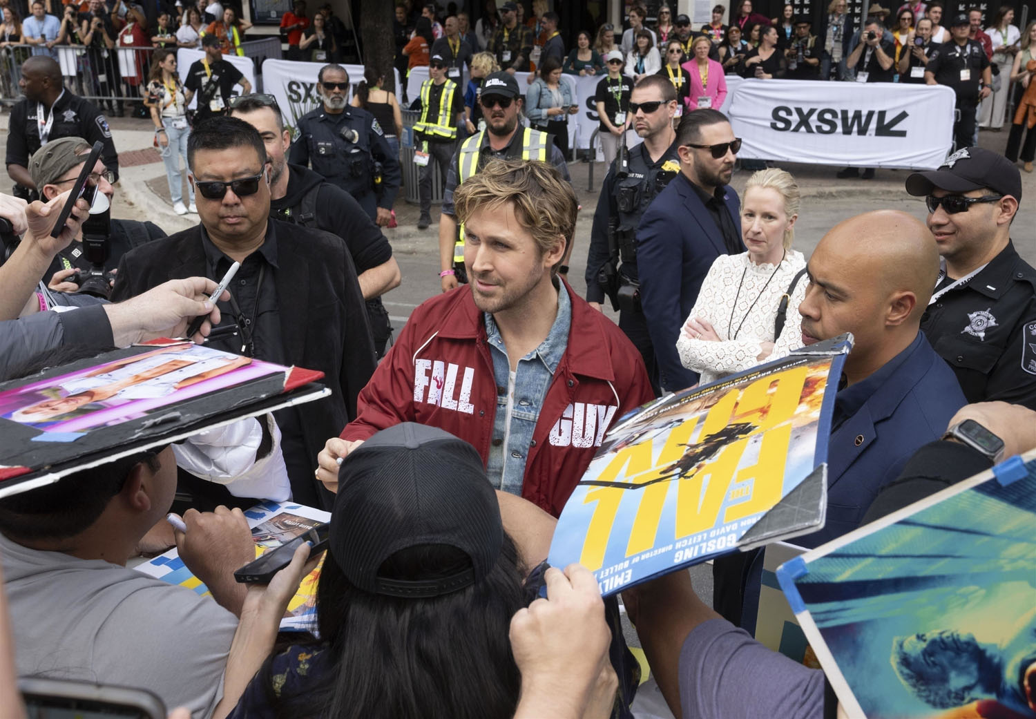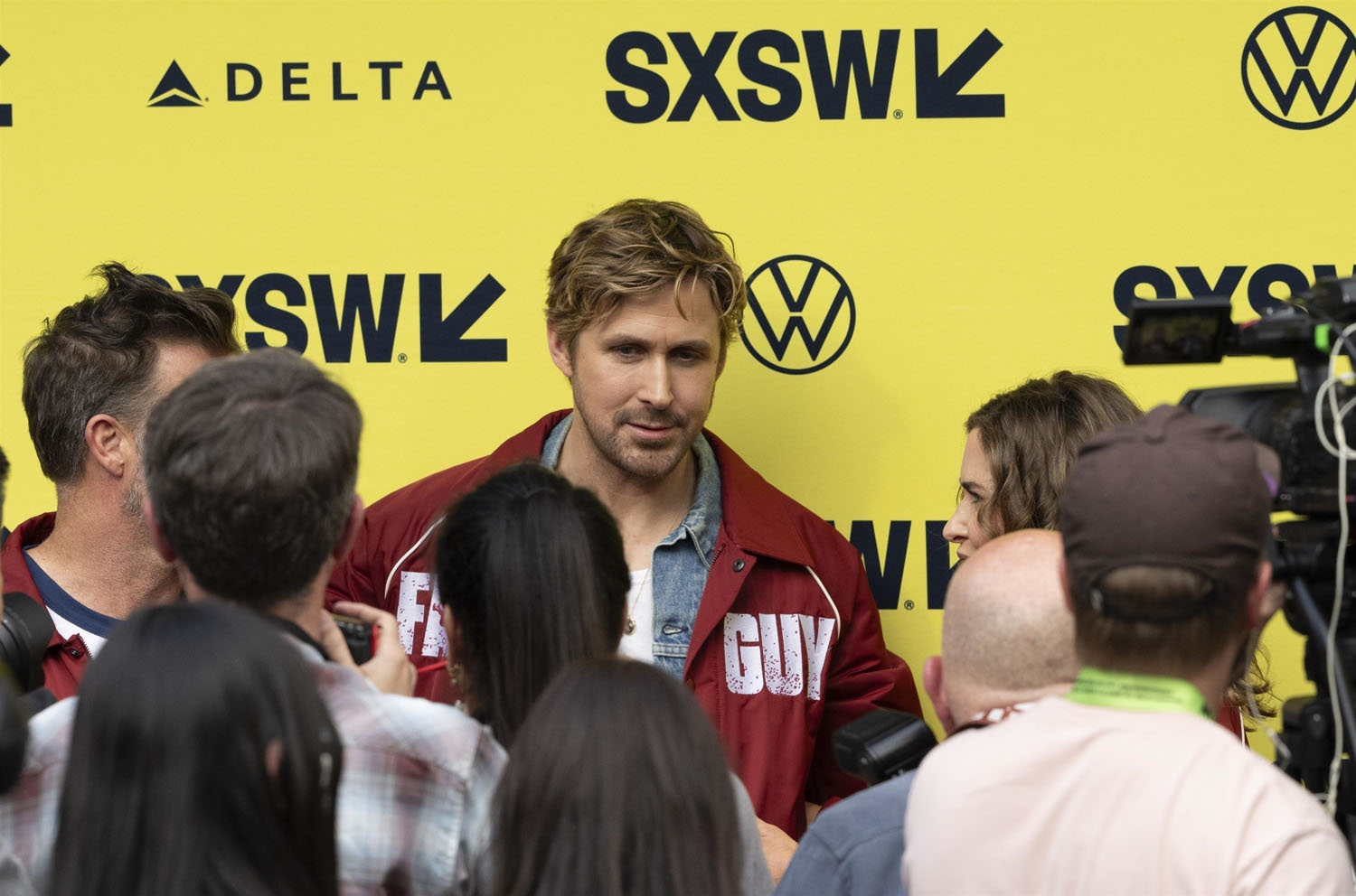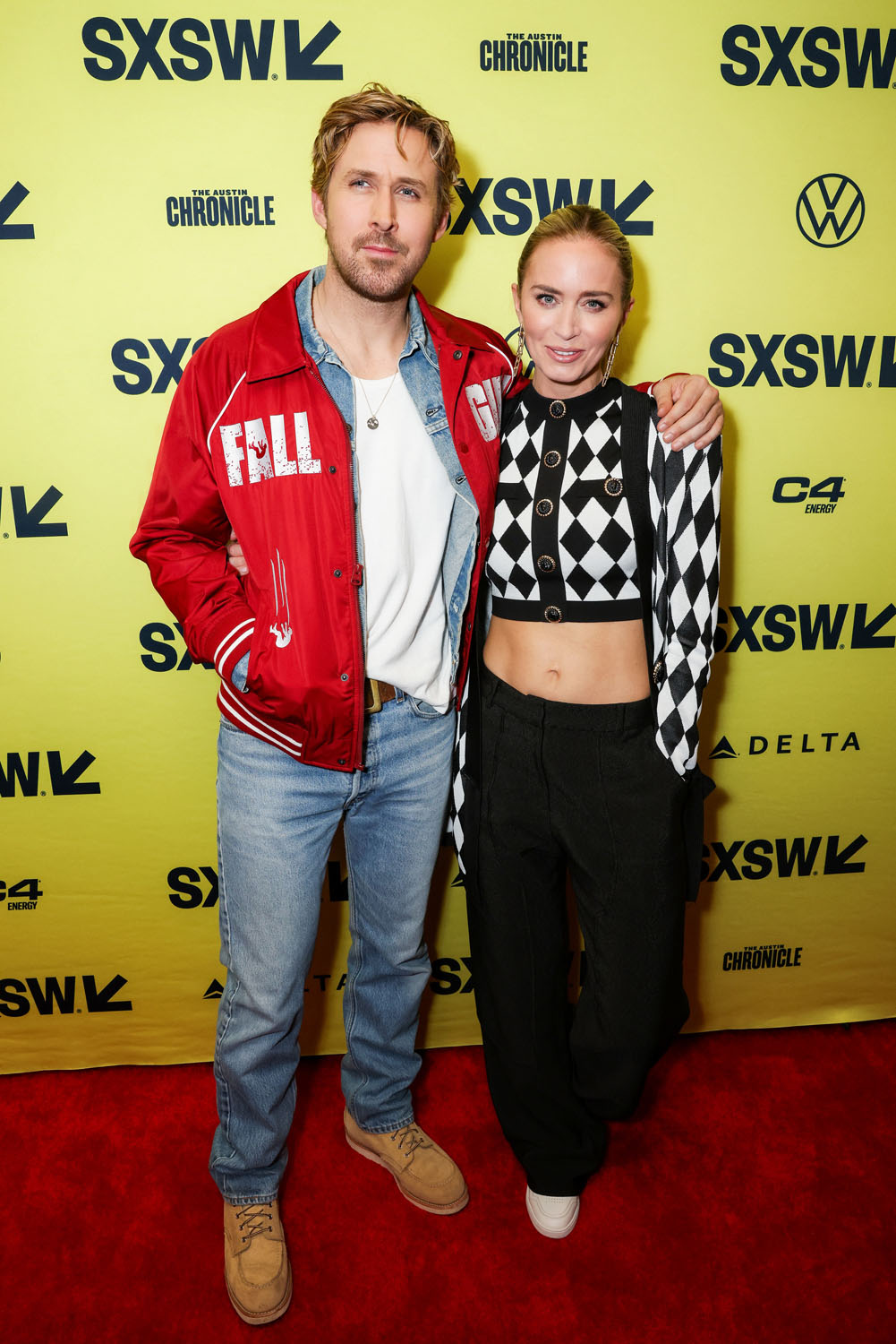 He and the cast and crew, including director David Leitch, and co-stars Emily Blunt, Stephanie Hsu, Winston Duke, and Hannah Waddingham premiered the film at SXSW this week and as you can see, Ryan’s replaced his pink bomber with a red one. Suddenly he’s the ultimate pitchman: