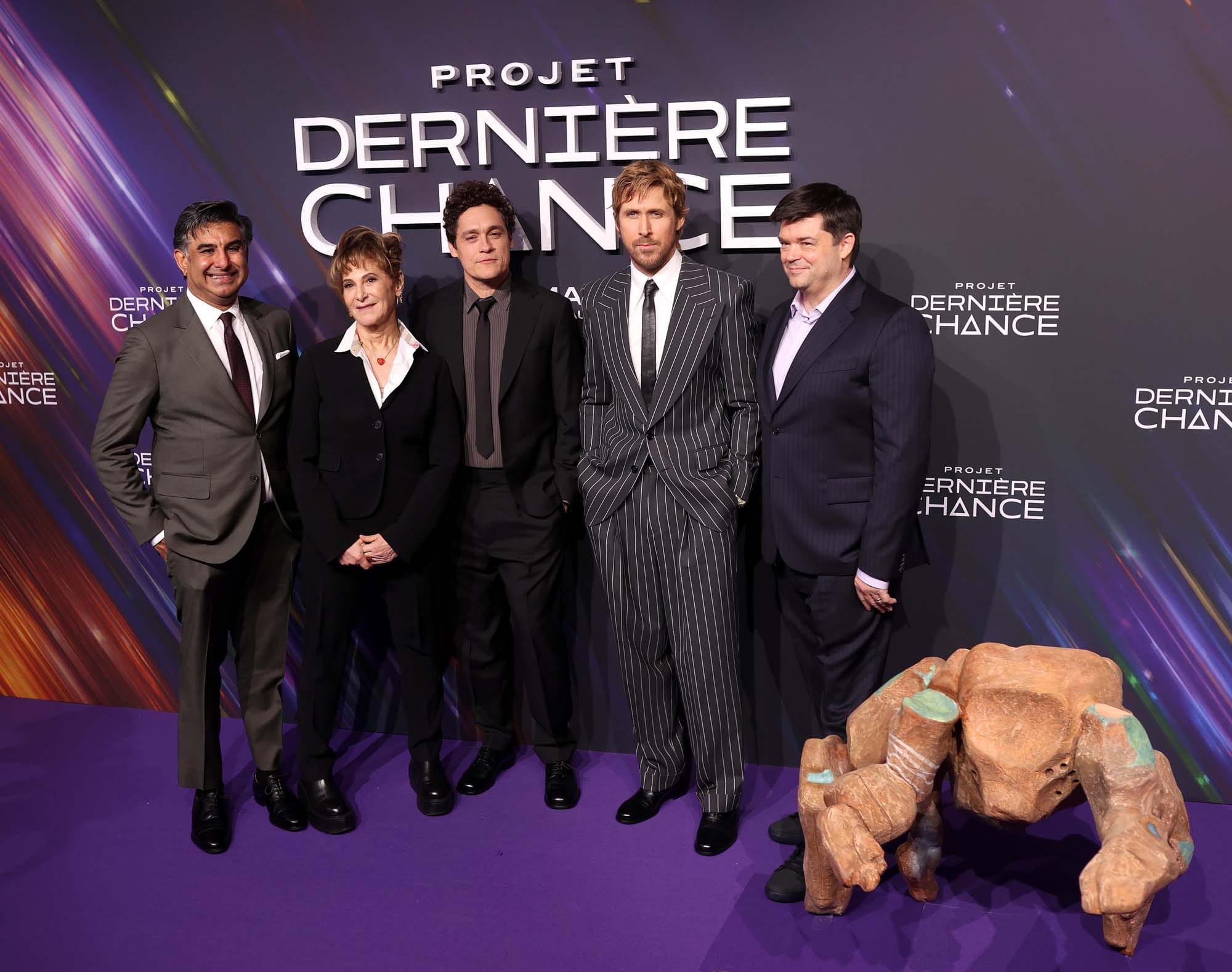 Aditya Sood, Amy Pascal, Phil Lord, Ryan Gosling and Chris Miller attend the "Projet Dernière Chance" (Project Hail Mary) - Photocall on March 11, 2026 in Paris, France.