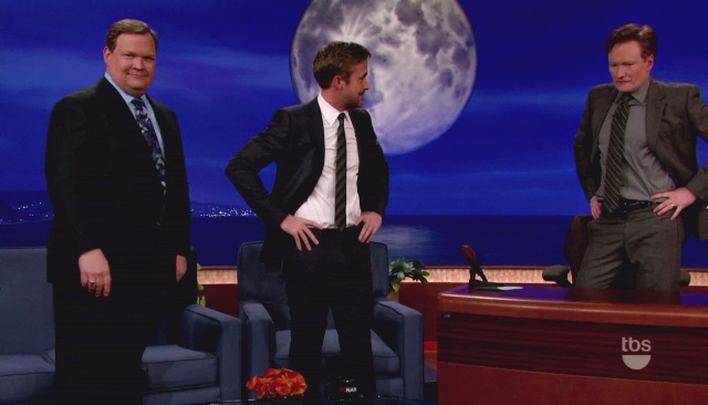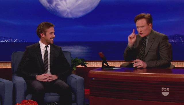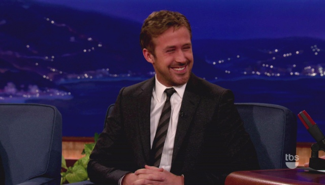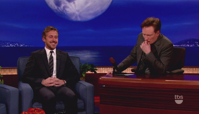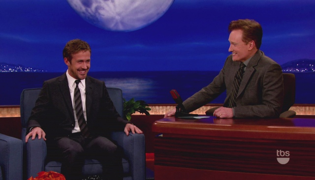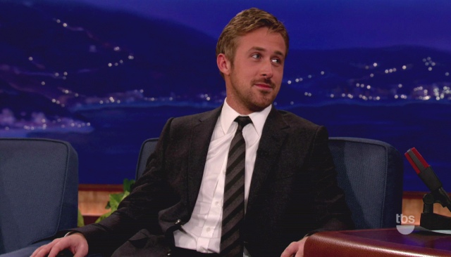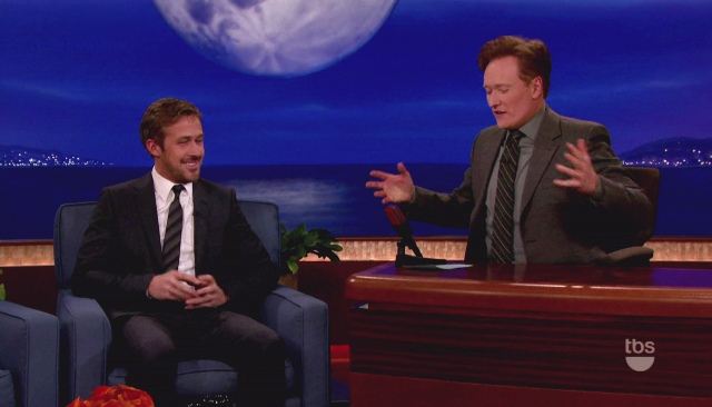 Promotion for Gangster Squad on the talk show circuit is being shouldered, primarily, by Emma Stone and Ryan Gosling. I mean, it’s not like they’re going to send Sean Penn out there. And, well, the young ones are just so pretty and fun and polished. Look at Ryan Gosling working late night like a f-cking pro on both Jimmy Kimmel and Conan. Am so curious what that pre-interview sounds like. Because the way it happens during taping, it certainly seems like he’s forthcoming with anecdotes and stories, and is even open to participating in a Will Ferrell Sketch. All that charm...and he doesn’t even have to sing and dance, Justin Timberlake. It’s a little slick, sure, but that just goes along with his fake New York accent. You know that you are being played, but when it looks this good and goes down so smoothly, you don’t really care, do you?