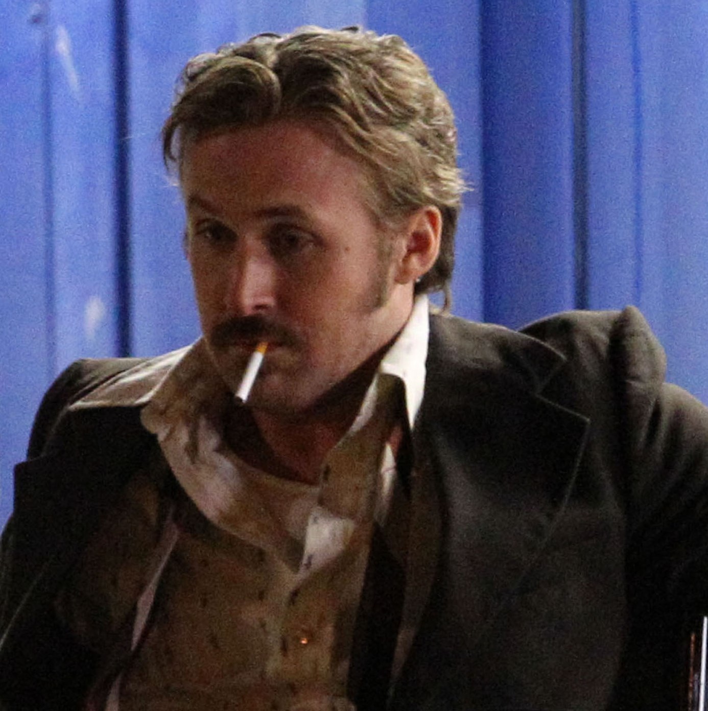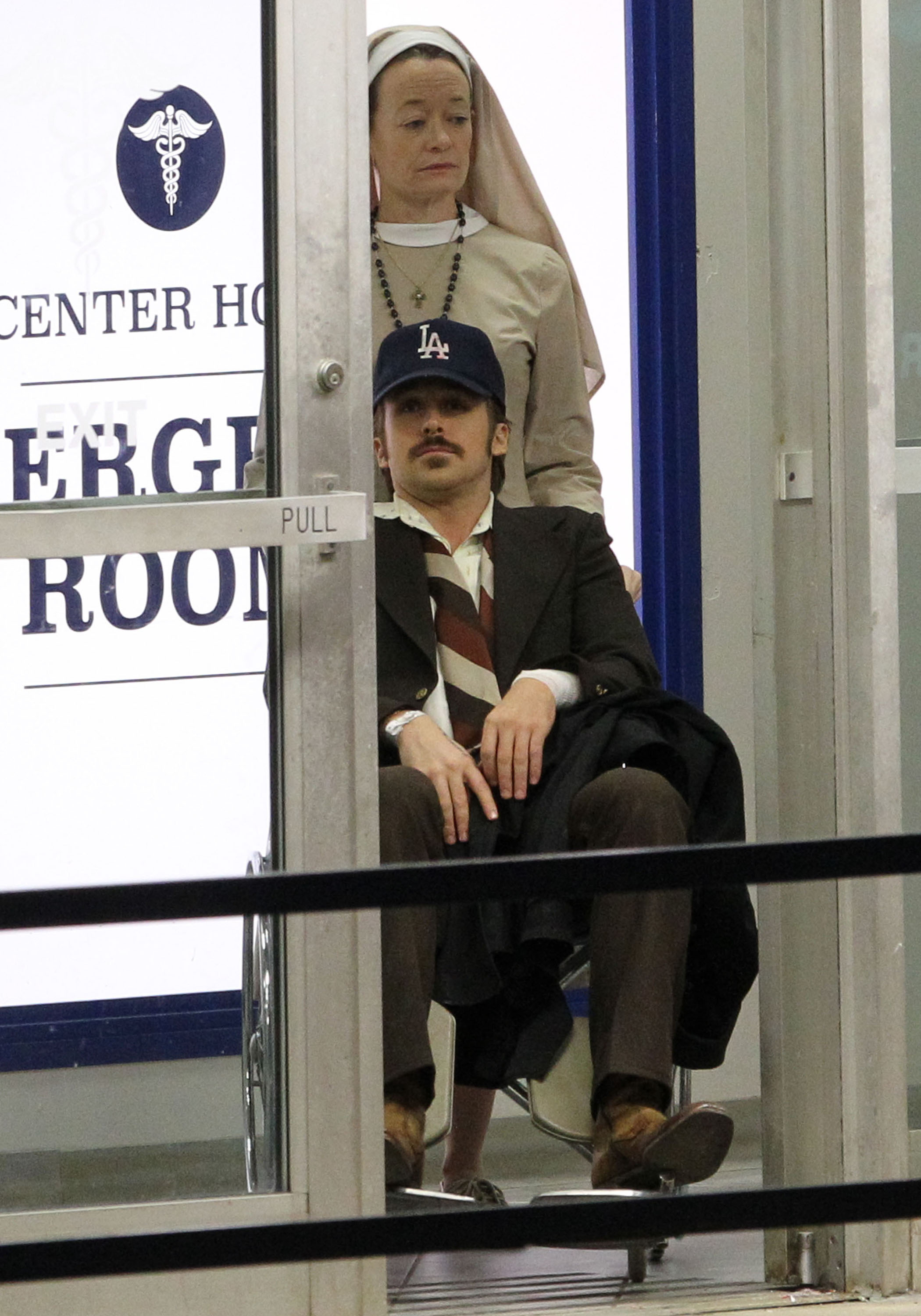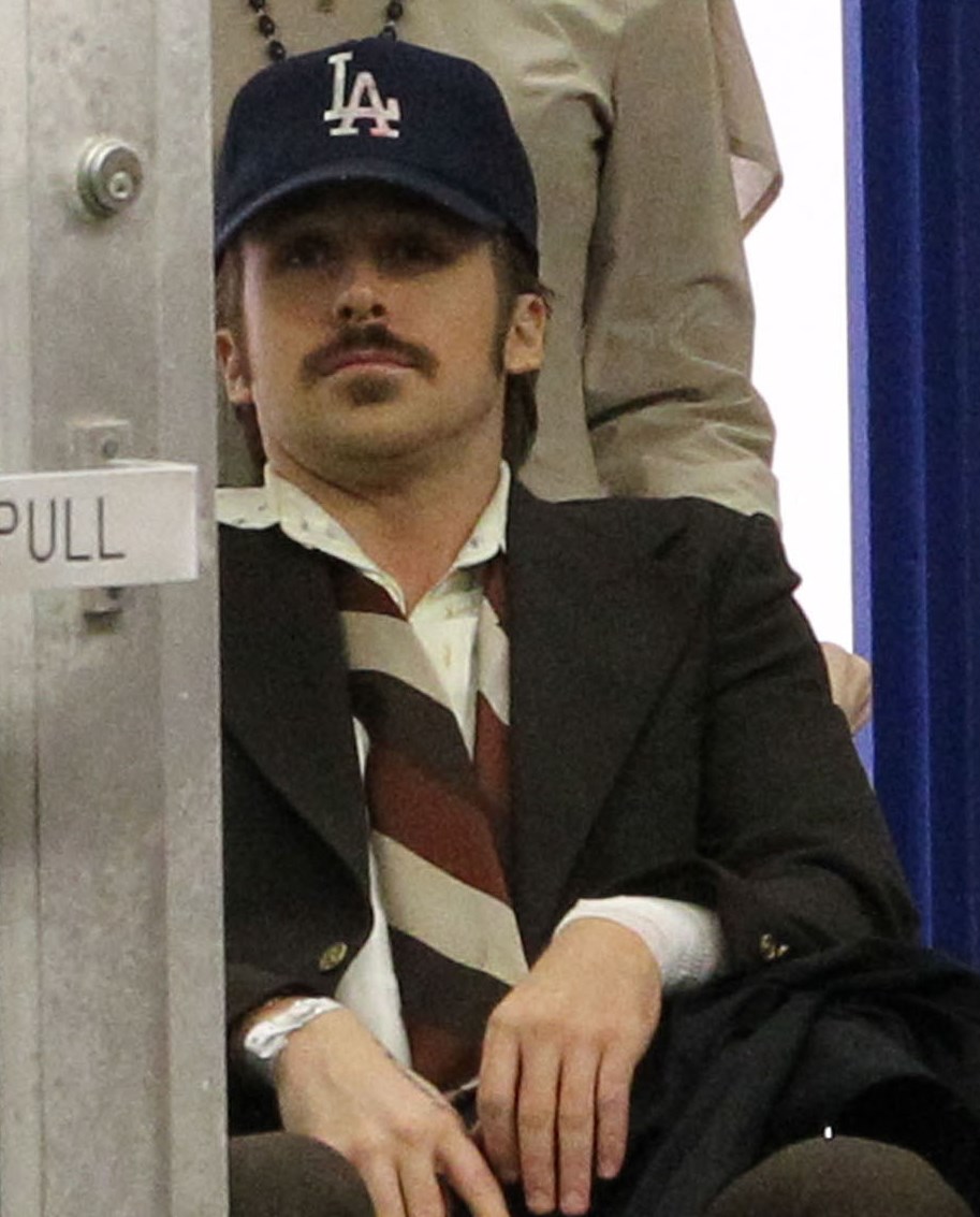 Here are new shots of Ryan Gosling on Friday in Atlanta on the set of The Nice Guys. He co-stars with Russell Crowe. As you can see, the film takes place in the 70s which, I guess, explains the moustache. And as you know, this is Ryan at work for the first time since his baby was born. Esmeralda arrived on September 12 although he and Eva Mendes haven’t spoken about it publicly at all. We only know her name because TMZ found the birth certificate.