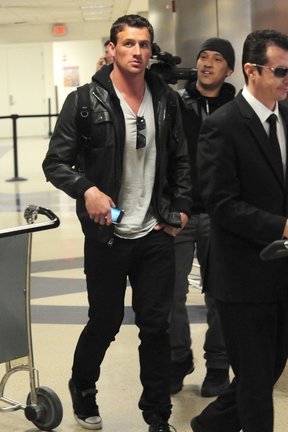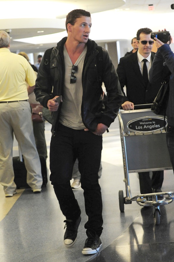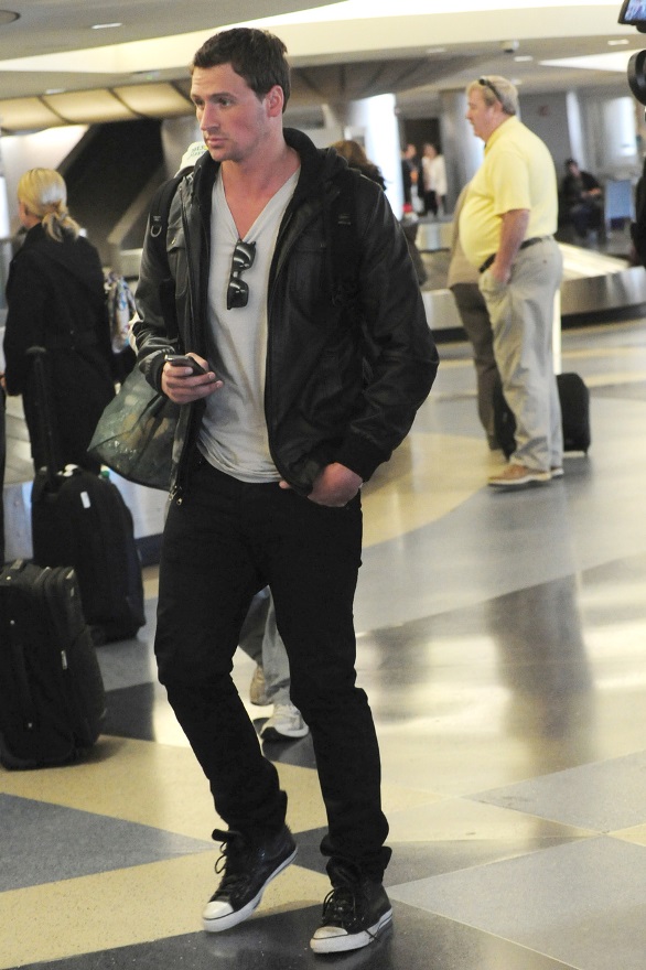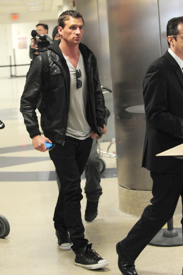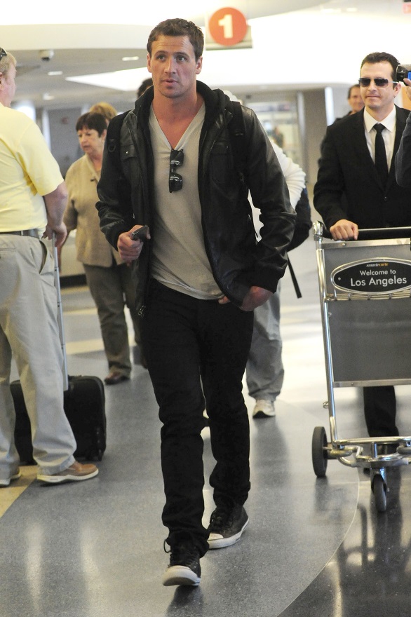 This is Ryan Lochte arriving at LAX today in advance of the premiere of What Would Ryan Lochte Do on E! this weekend. 100% I promise you, this is what Sasha, who is addicted to bad television, will be doing on Sunday. She’s been sending me emails every week about how she can’t wait, and it’s going to be the best show ever. They could be selling designer shoes for $10 a pair on her front lawn, only in her size, and she would not get off her couch during Jeah! Time.