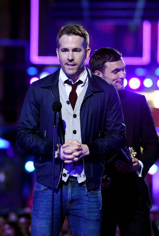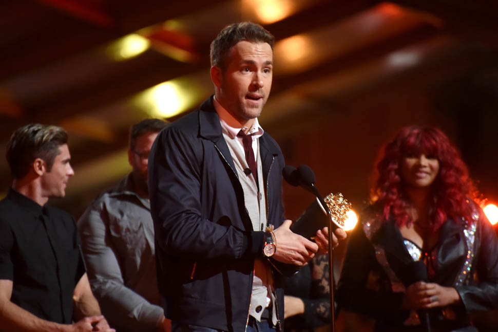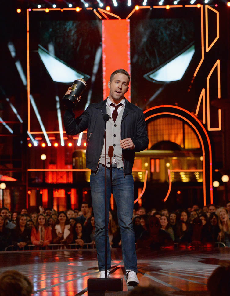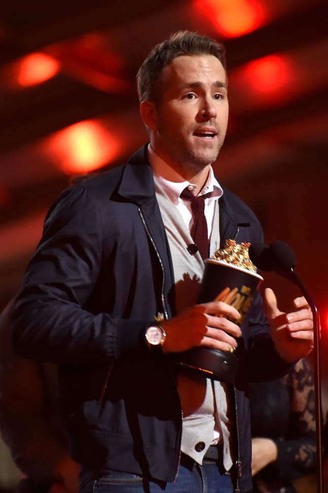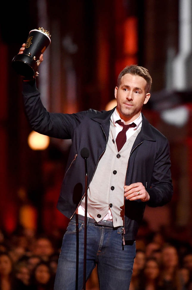 Ryan Reynolds showed up at the MTV Movie Awards to collect an award for Best Comedic Performance and Best Fight (with Ed Skrein) for Deadpool, which apparently now counts as a 2015 movie. He got a very hype entrance with a bunch of dancing Deadpools and Salt-N-Pepa performing “Shoop”, so it’s worth MTV’s blatant star f*cking in trade. I’ll put up with a lot of chicanery if it results in Salt-N-Pepa showing up.