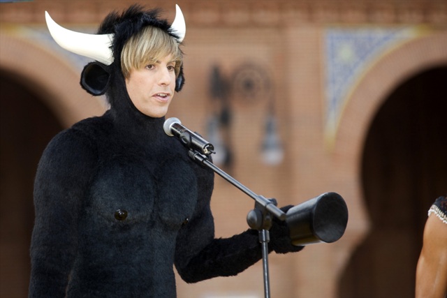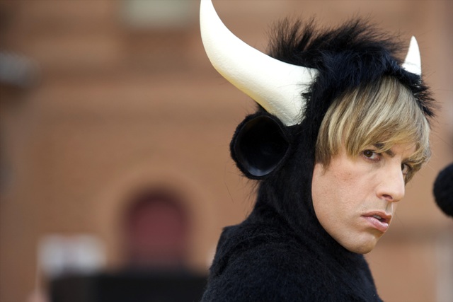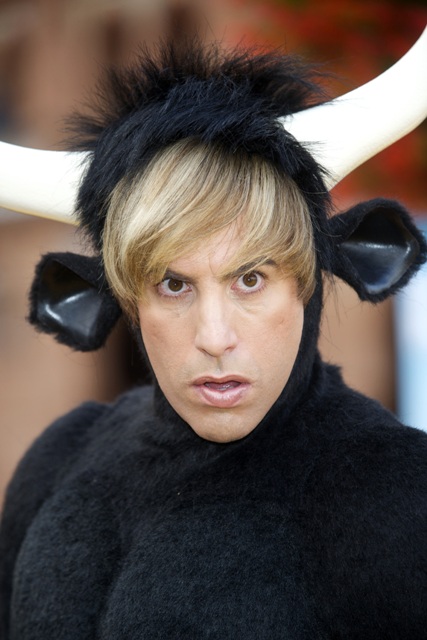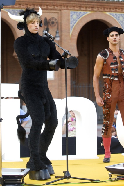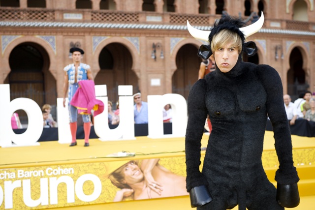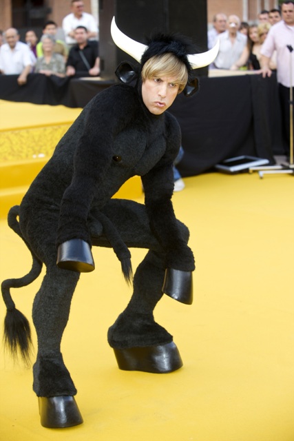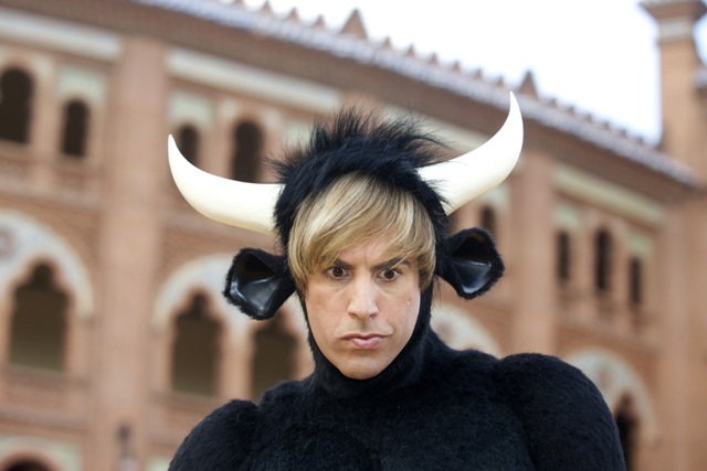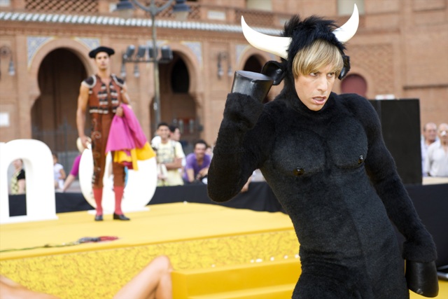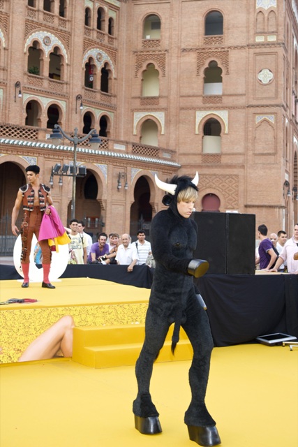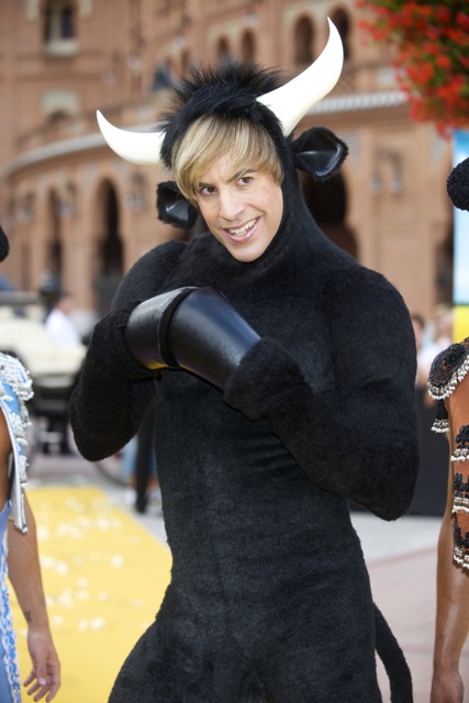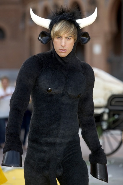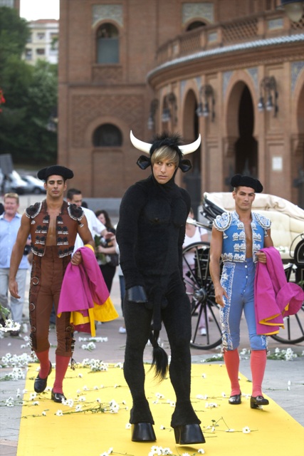 This is Sacha Baron Cohen, as Bruno of course, in Spain today promoting the film. Instead of giving us some ass shots, he chose to channel the Bull. And strut around like the place was his personal runway.
