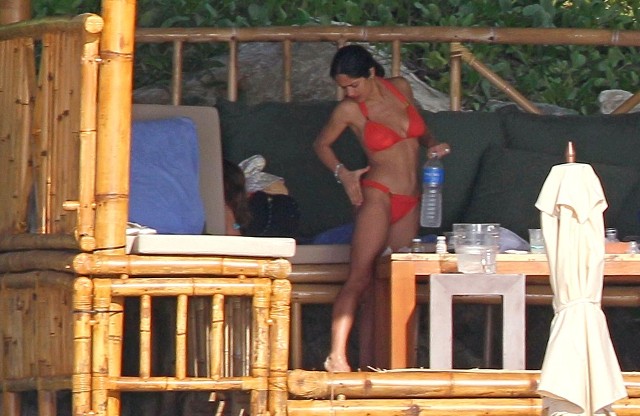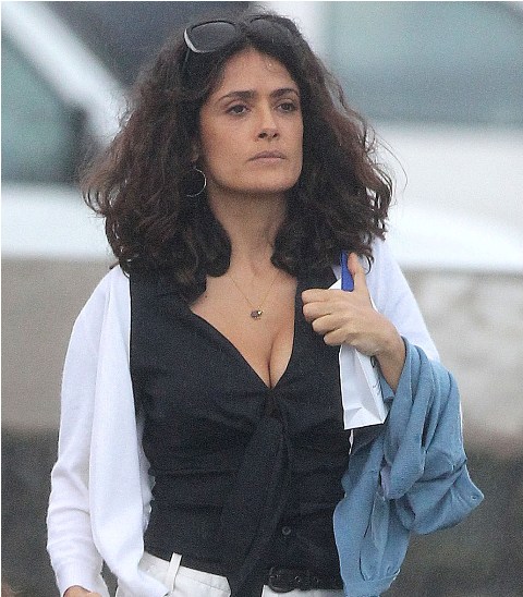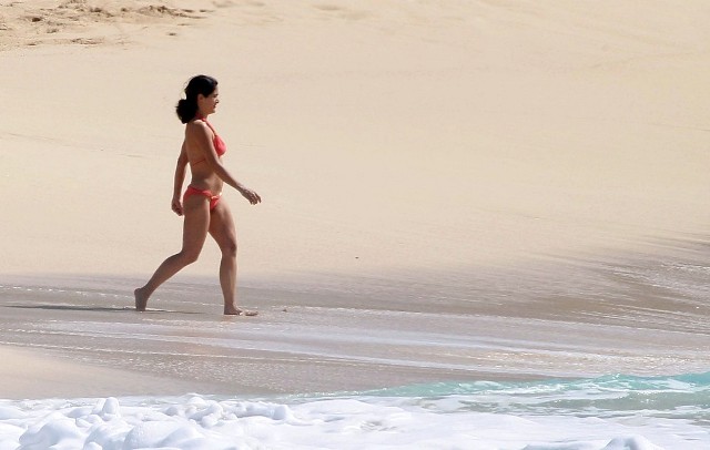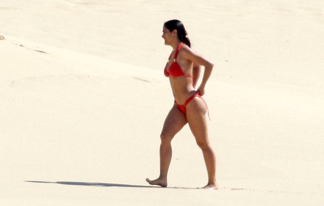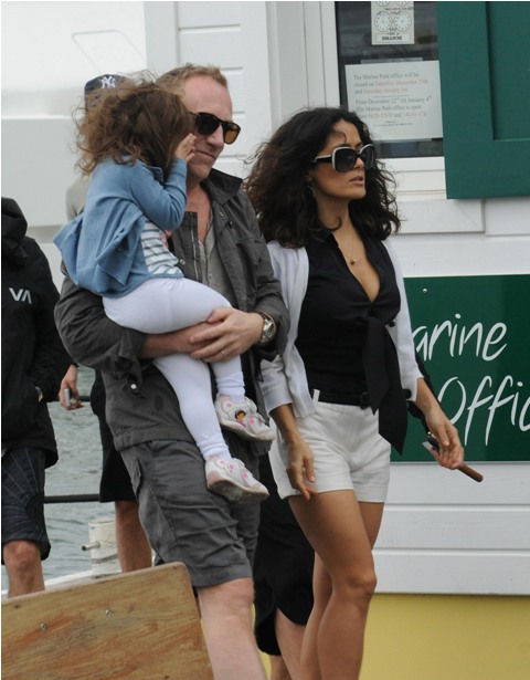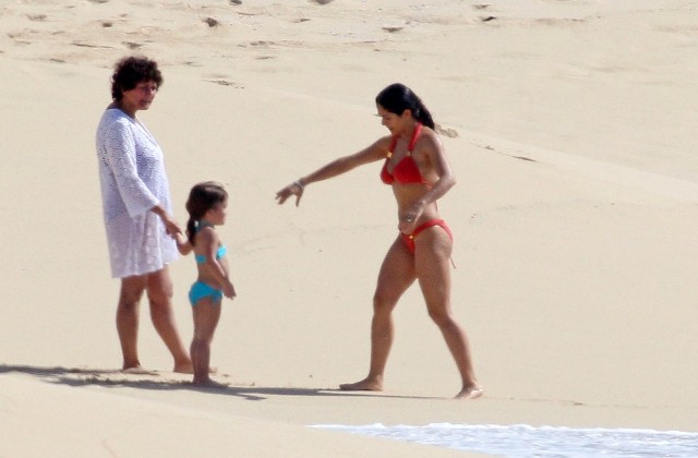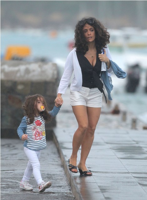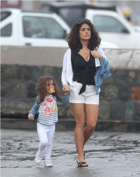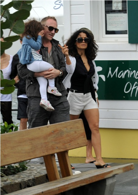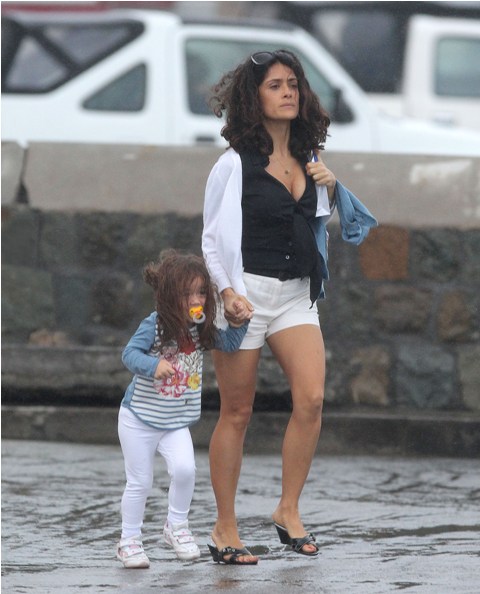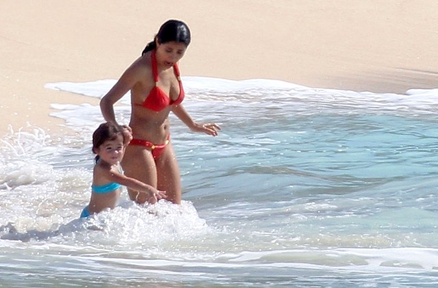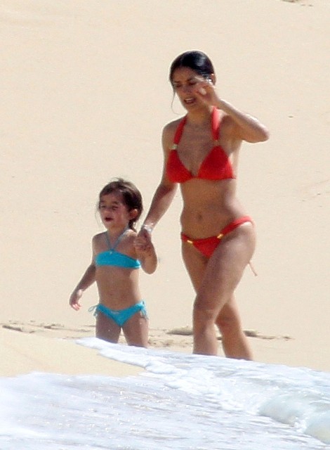Mexico and St Barts seem to be the popular warm holiday season destinations for celebrities this year and Salma Hayek is there now with daughter Valentina and husband Francois Henri Pinault. Here she is yesterday on the beach showing off some tight curves. You know, I thought her tits would be crazier when they’re let loose in a bikini. I guess it’s because they’re usually mashed together in a dress.