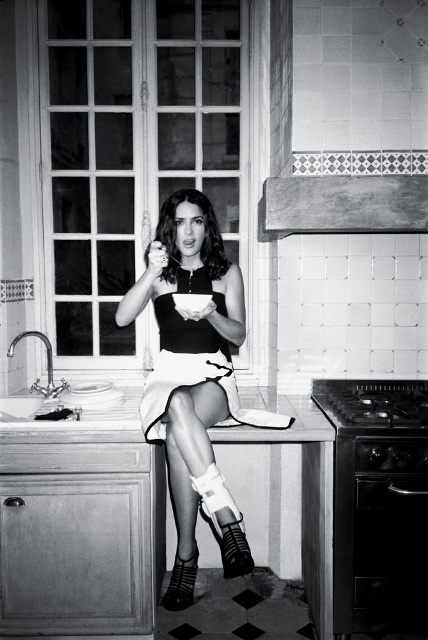 Sometimes you read an article and you wish, so badly, you could have been there while it was going down. This is one of those times. I want to see a candid Salma issuing orders, batting her eyelashes cutting tomatoes. Or talking with another mommy at the playground. Yes, this actually happens.