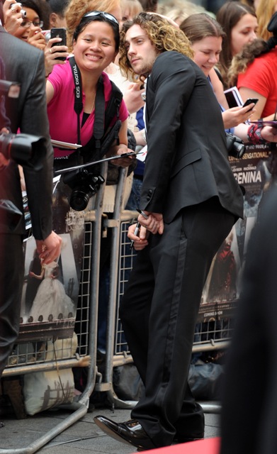 So here they are, My Obsession, Sam and Aaron Taylor-Johnson at the London premiere of Anna Karenina tonight , as into each other as ever. Click here if you missed the previous article this morning; I blew my load on them and have nothing more to say except I wish his feet weren’t turned so far out.