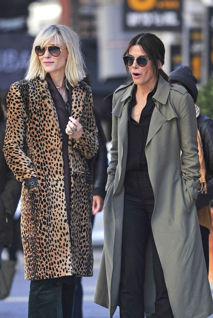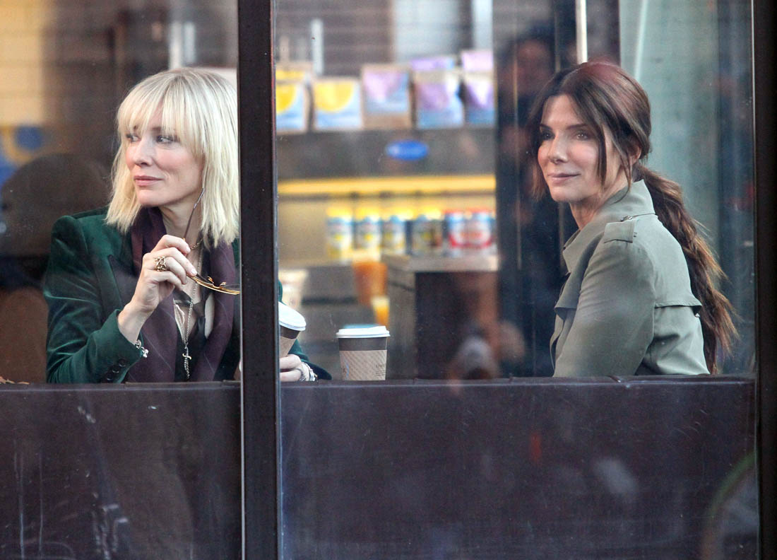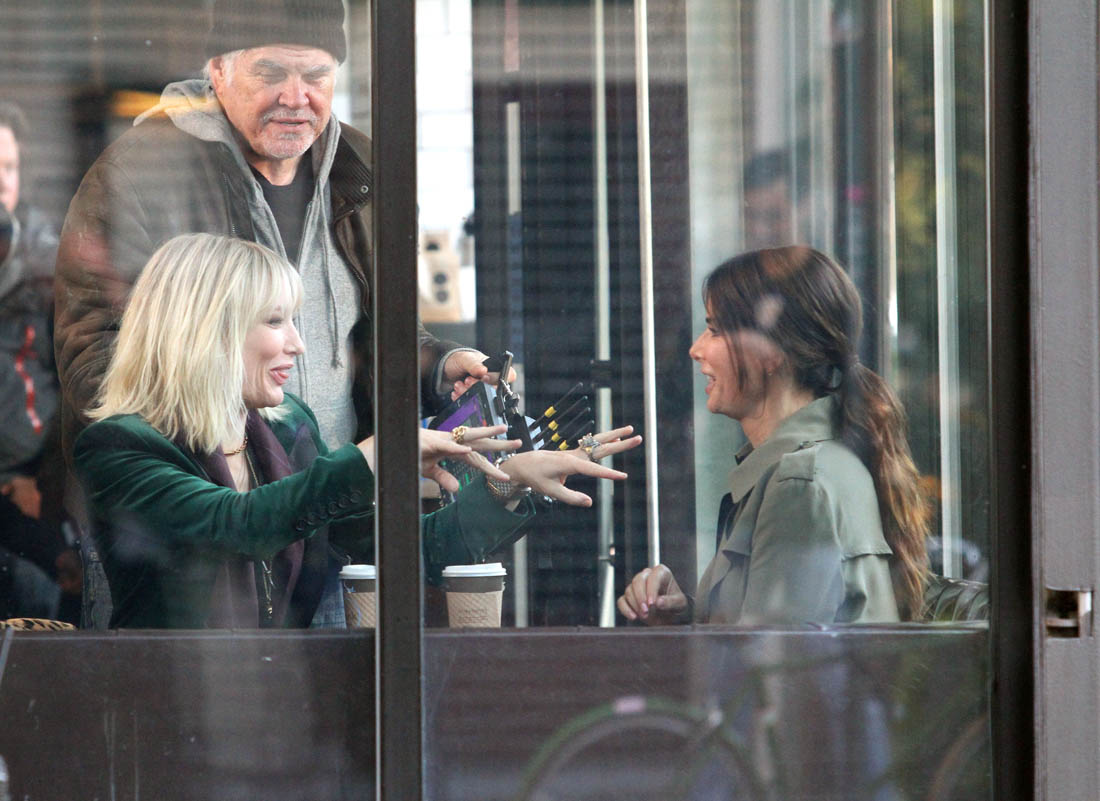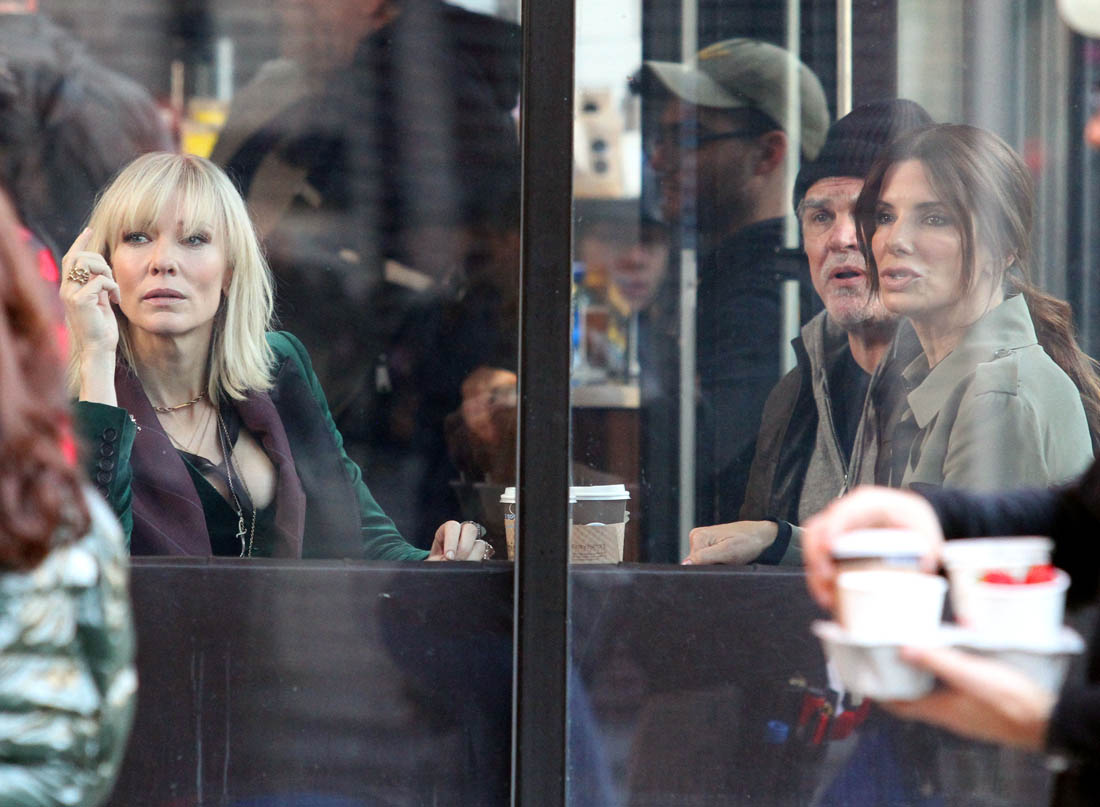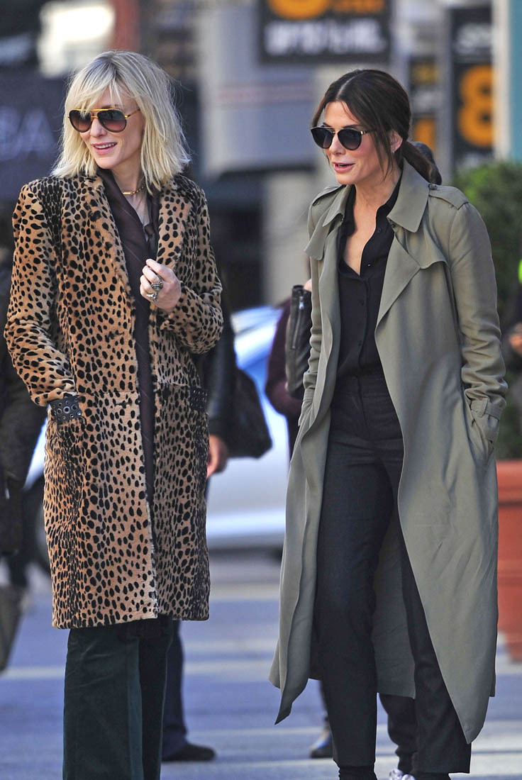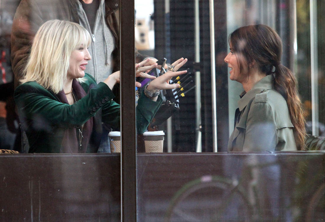 OK so far what we know is that Sandy may or may not be playing Danny Ocean’s (George Clooney) sister. And Cate’s in the Rusty Ryan (Brad Pitt) role, which you kinda see already because that coat could be this movie’s version of the line “Ted Nugent wants his shirt back”. Will Cate be eating in several scenes?