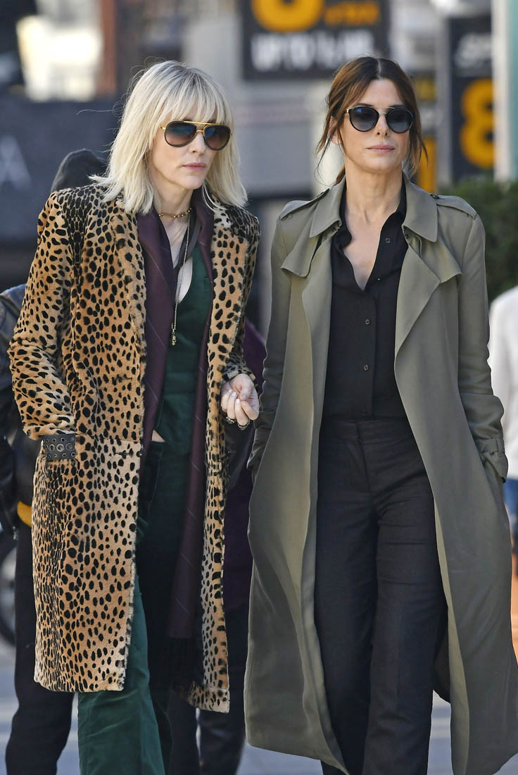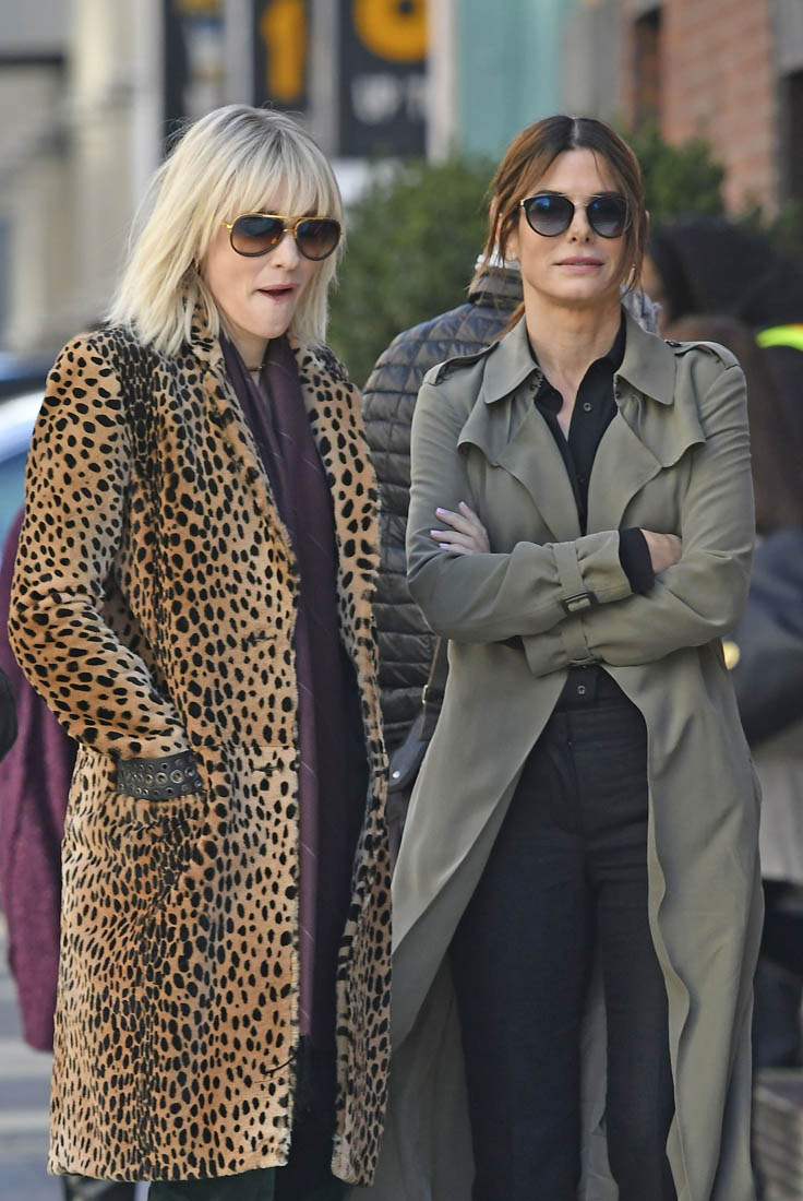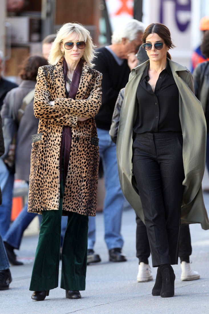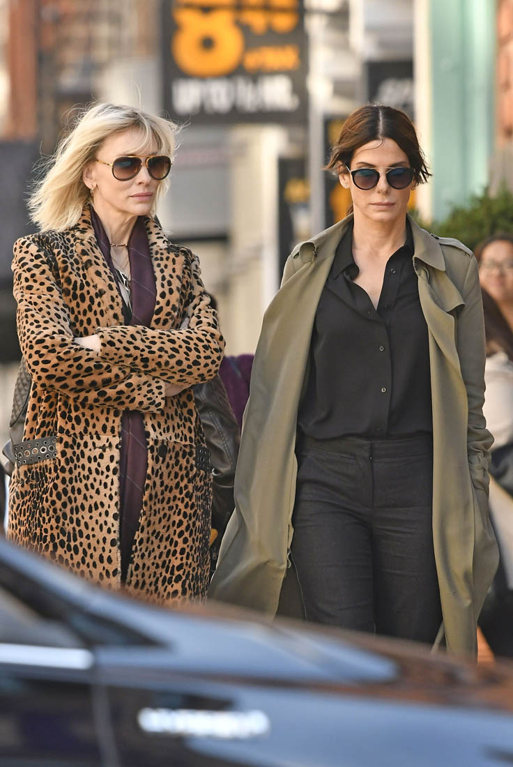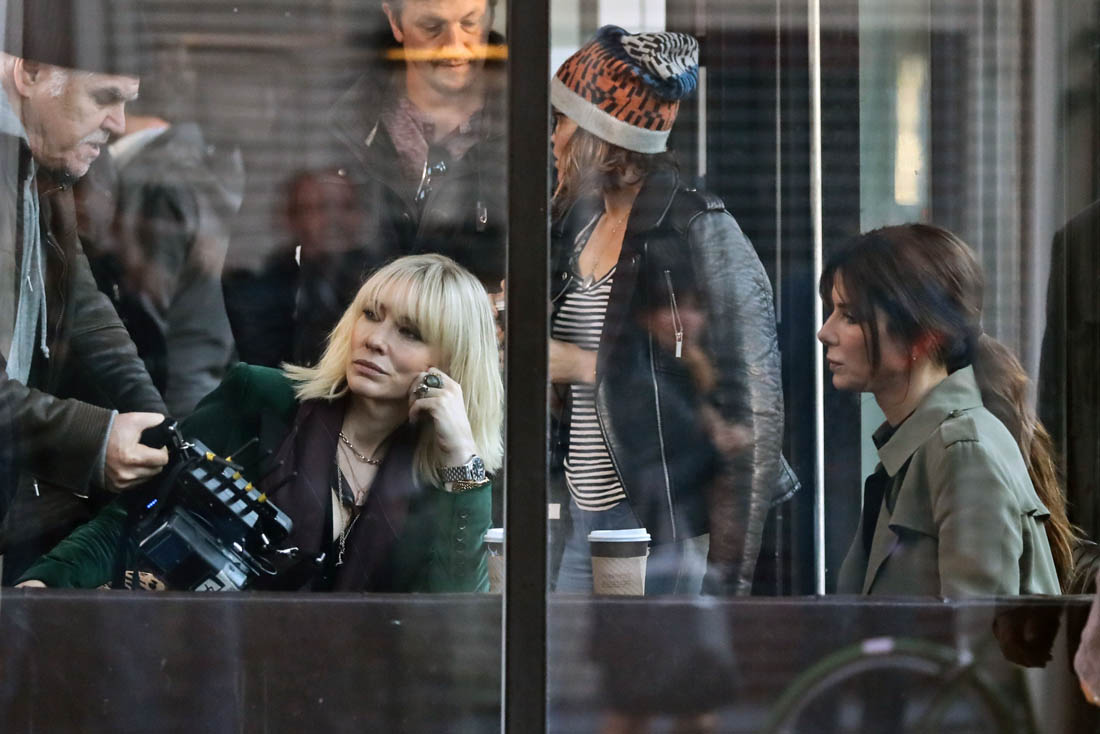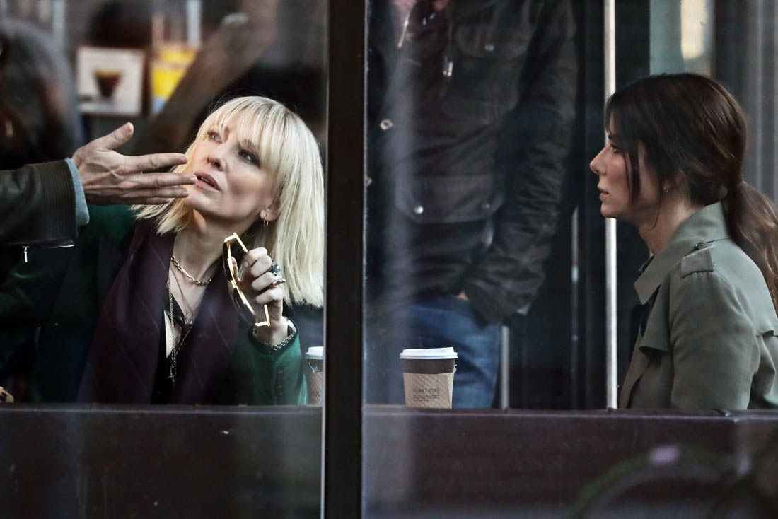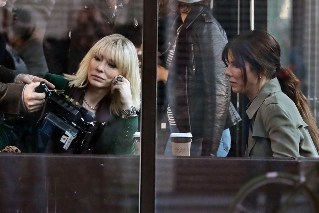 OK so far what we know is that Sandy may or may not be playing Danny Ocean’s (George Clooney) sister. And Cate’s in the Rusty Ryan (Brad Pitt) role, which you kinda see already because that coat could be this movie’s version of the line “Ted Nugent wants his shirt back”. Will Cate be eating in several scenes?