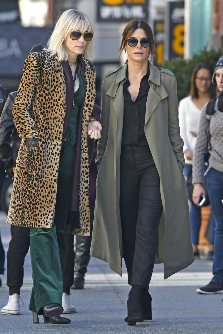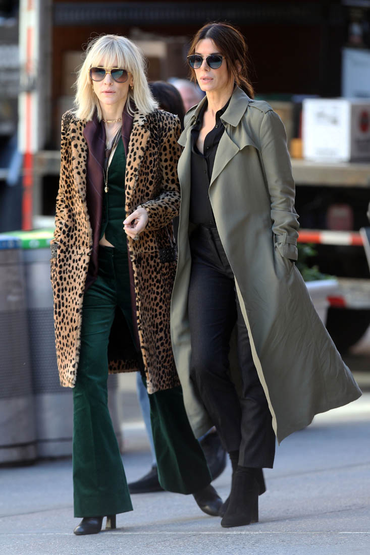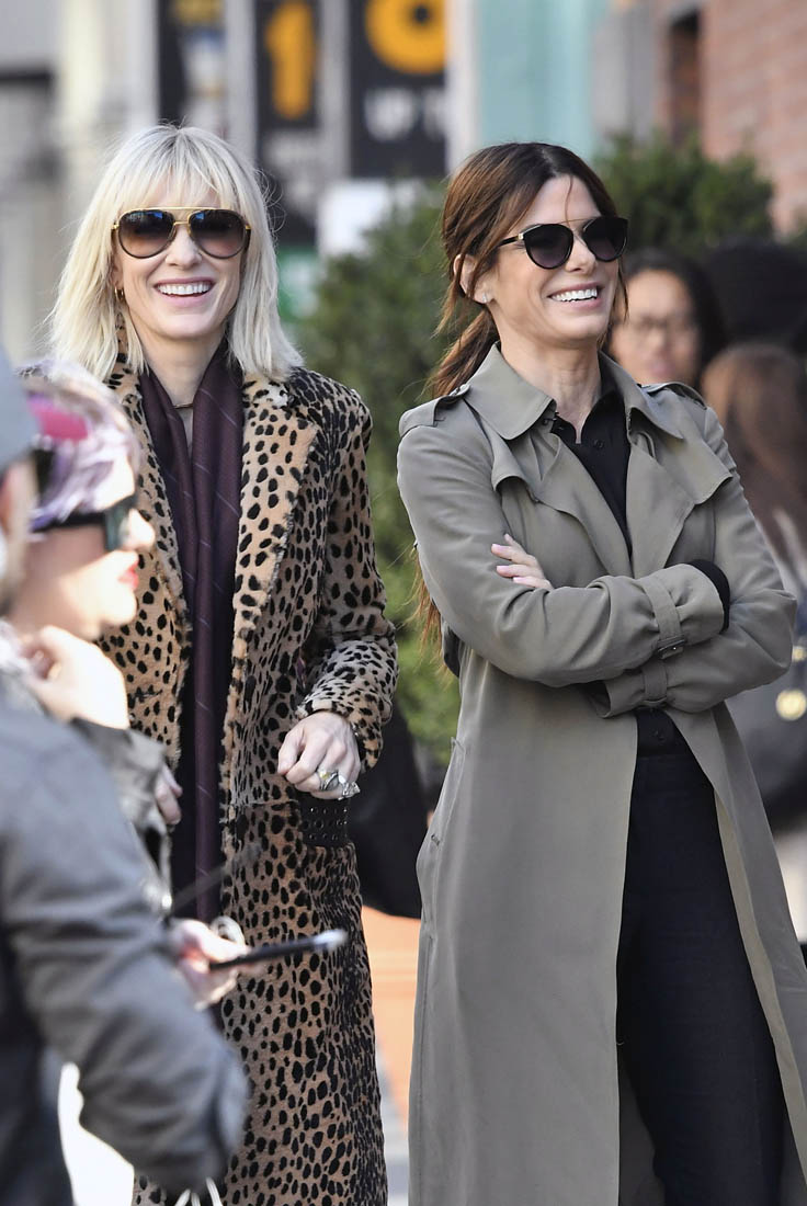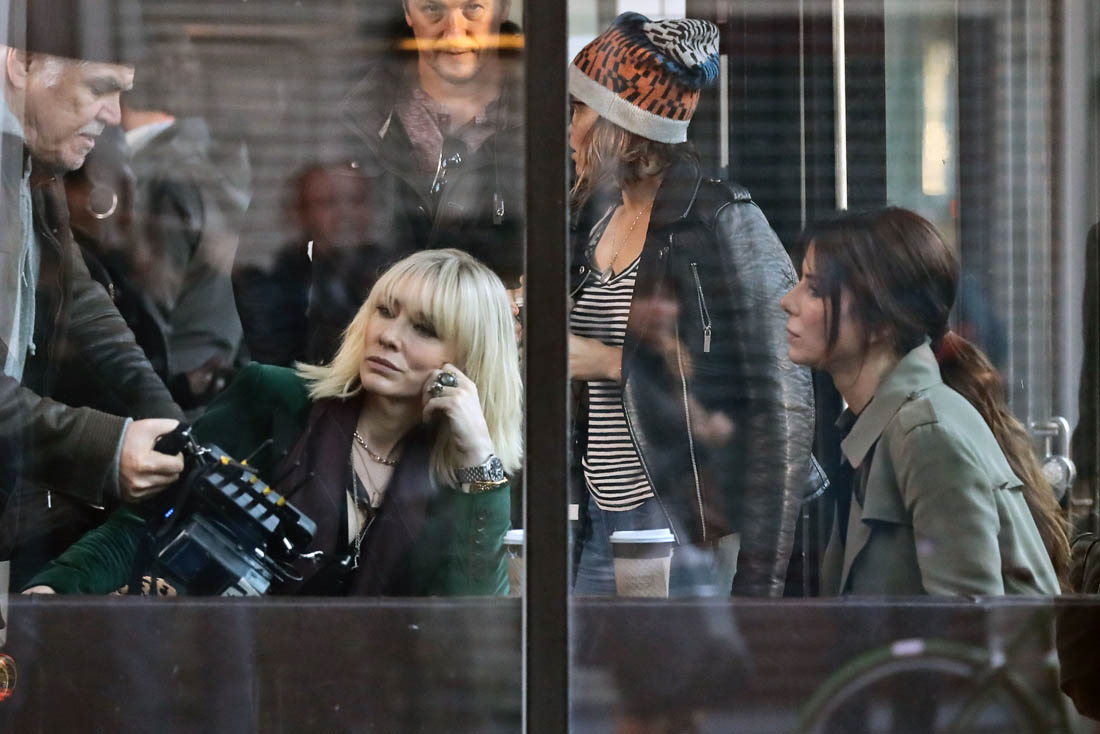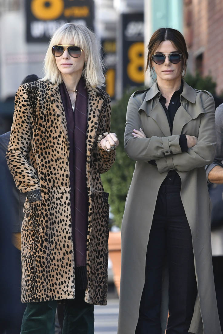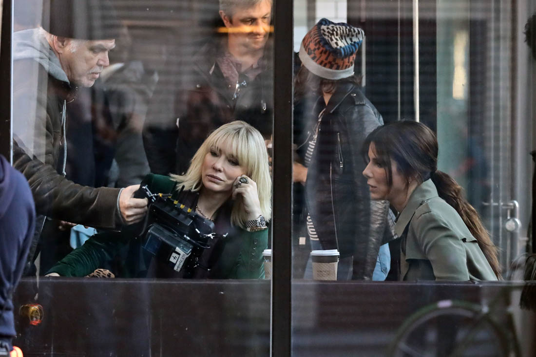 OK so far what we know is that Sandy may or may not be playing Danny Ocean’s (George Clooney) sister. And Cate’s in the Rusty Ryan (Brad Pitt) role, which you kinda see already because that coat could be this movie’s version of the line “Ted Nugent wants his shirt back”. Will Cate be eating in several scenes?
