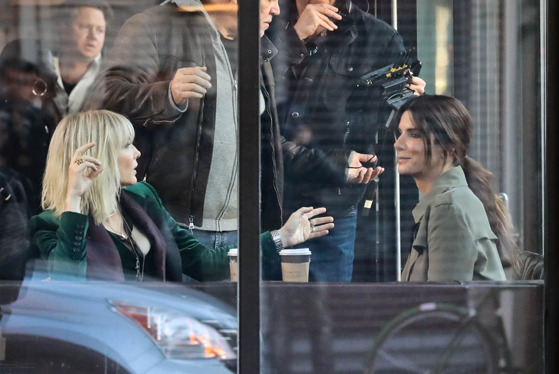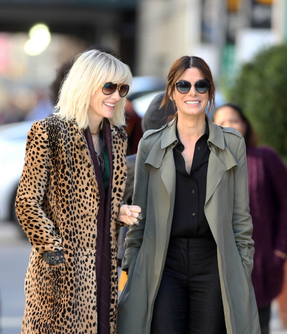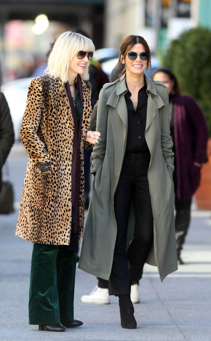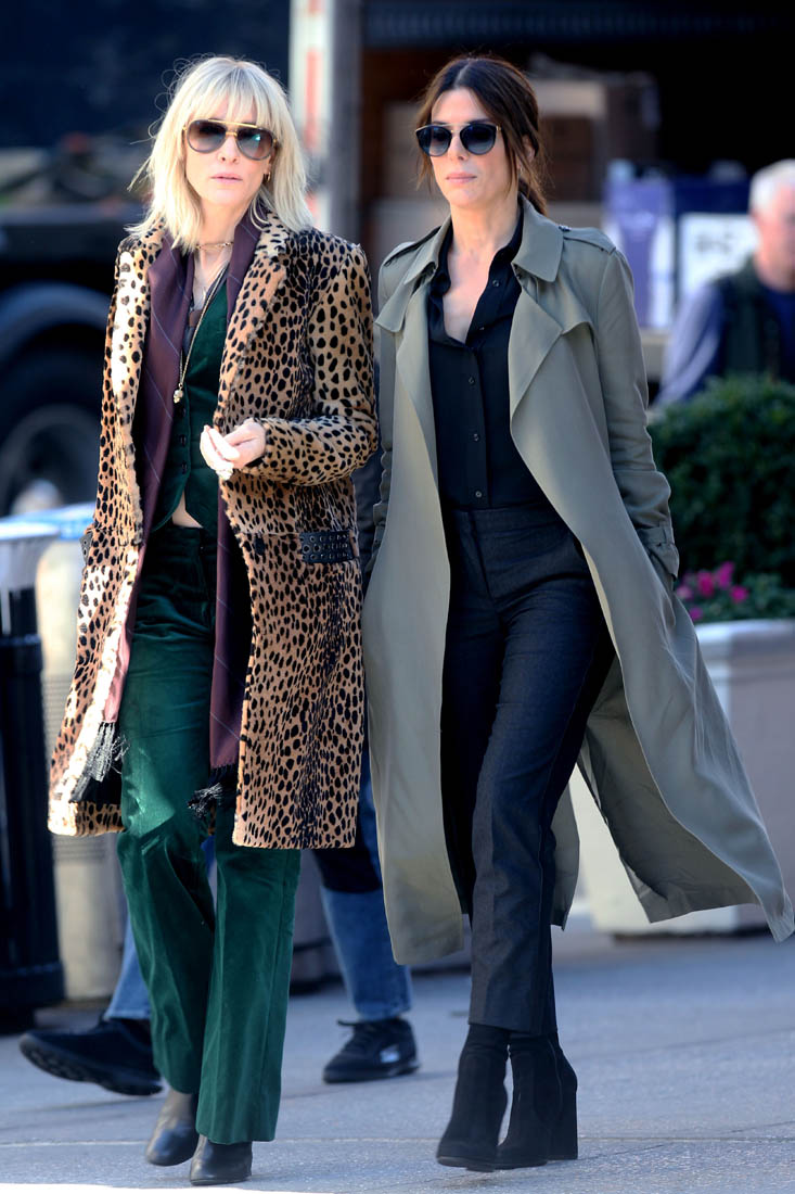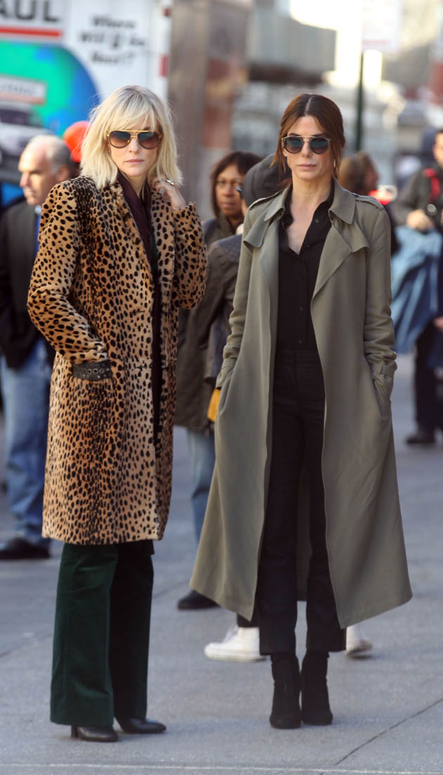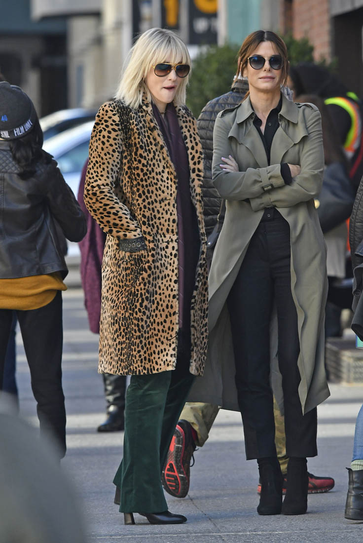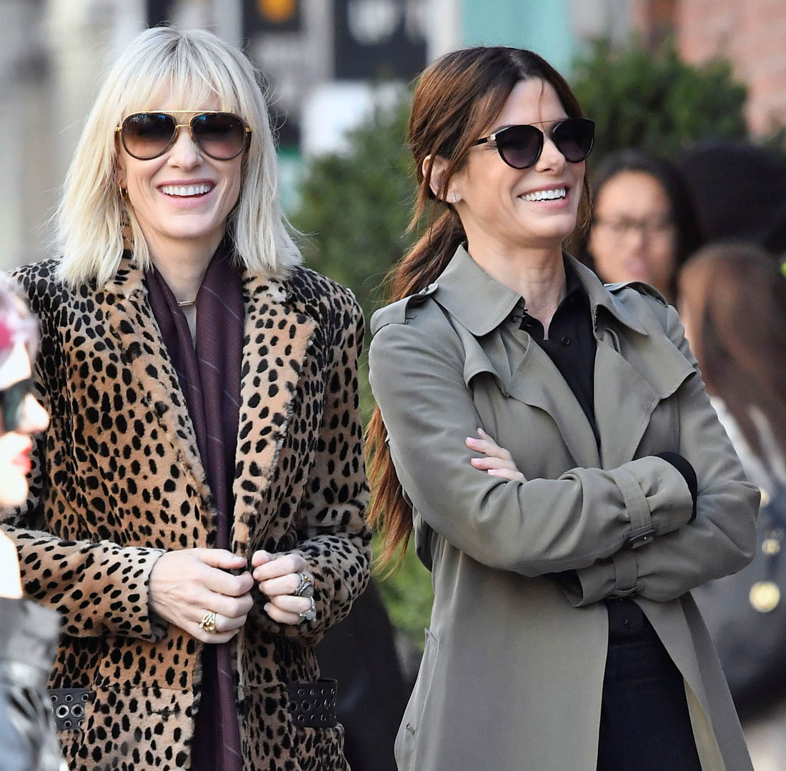 OK so far what we know is that Sandy may or may not be playing Danny Ocean’s (George Clooney) sister. And Cate’s in the Rusty Ryan (Brad Pitt) role, which you kinda see already because that coat could be this movie’s version of the line “Ted Nugent wants his shirt back”. Will Cate be eating in several scenes?