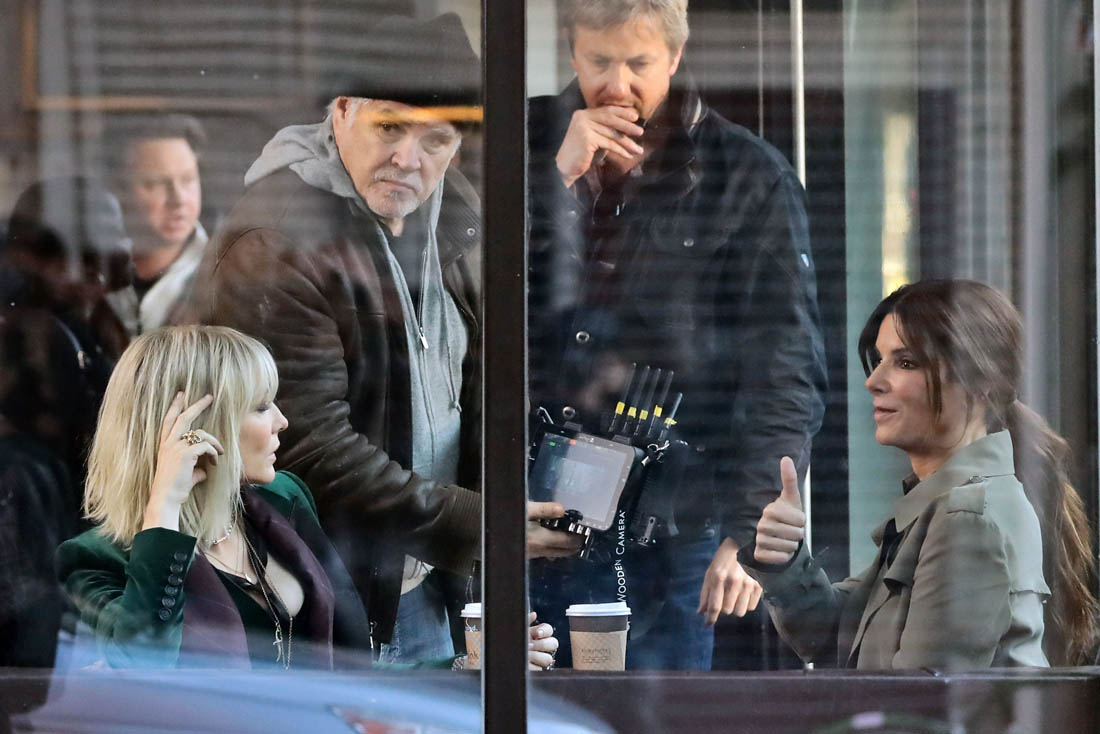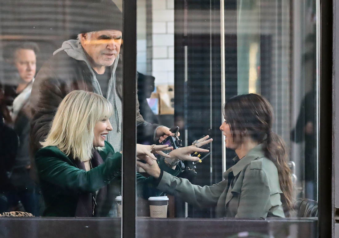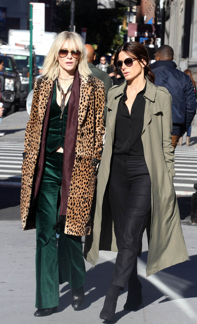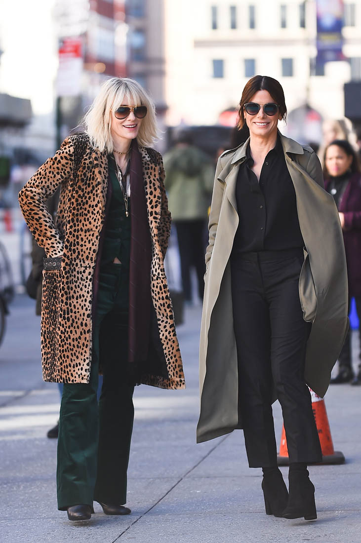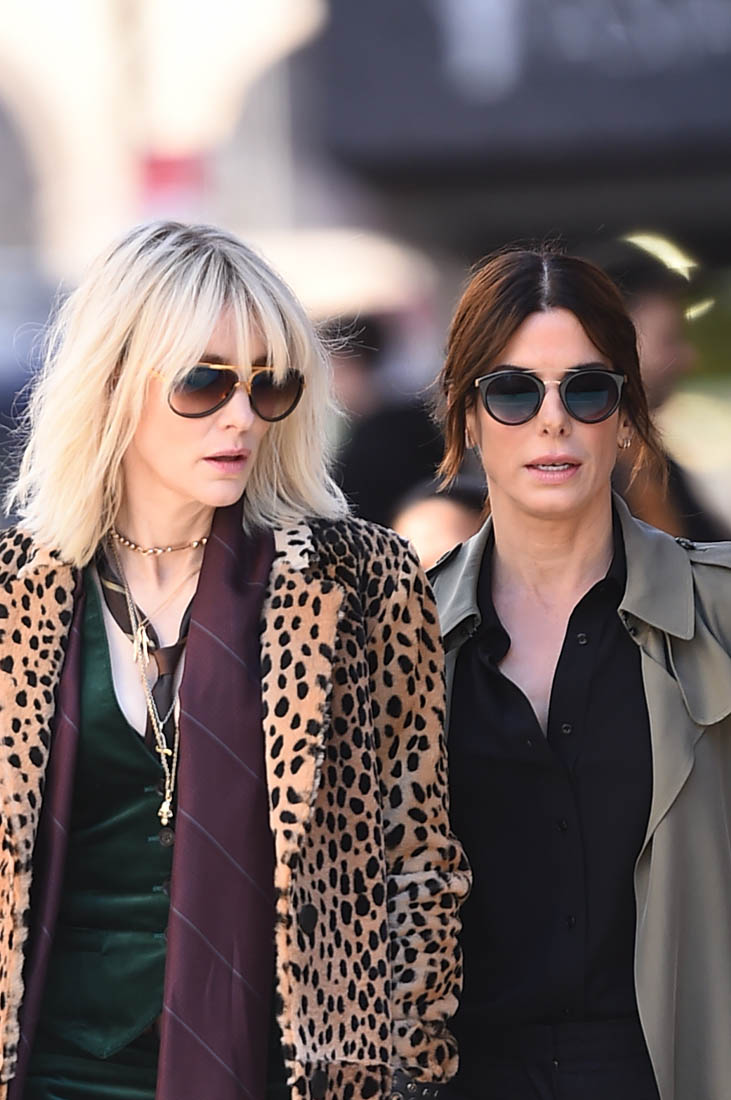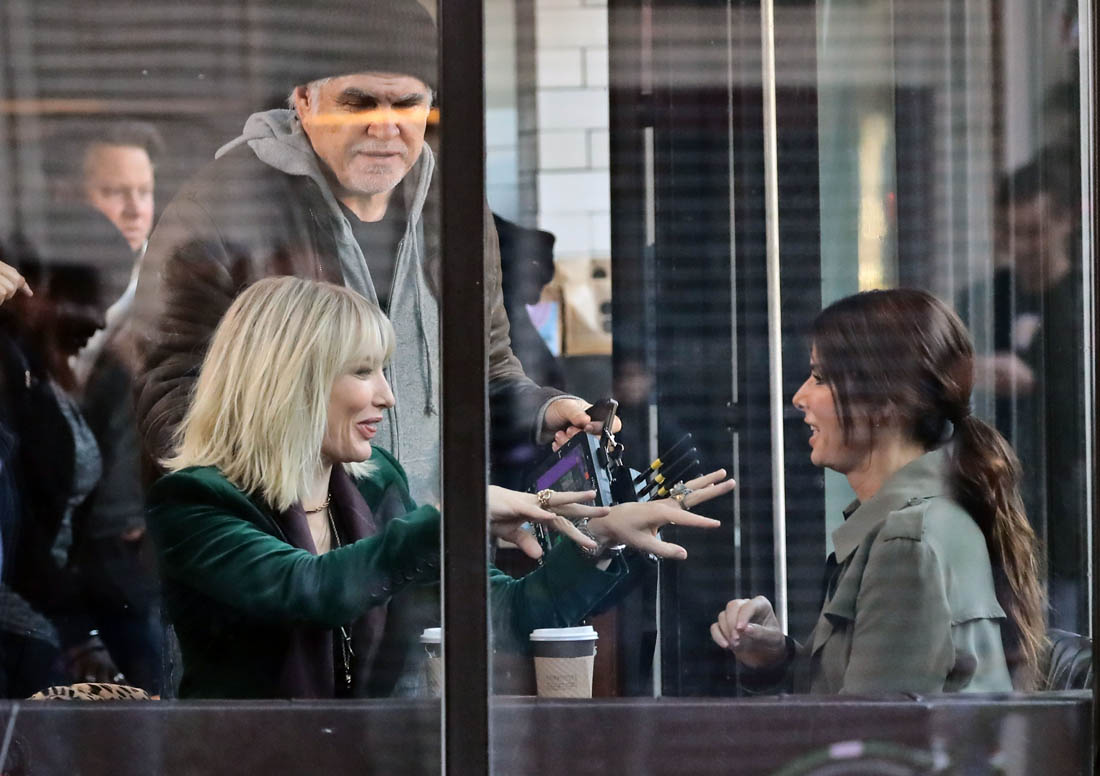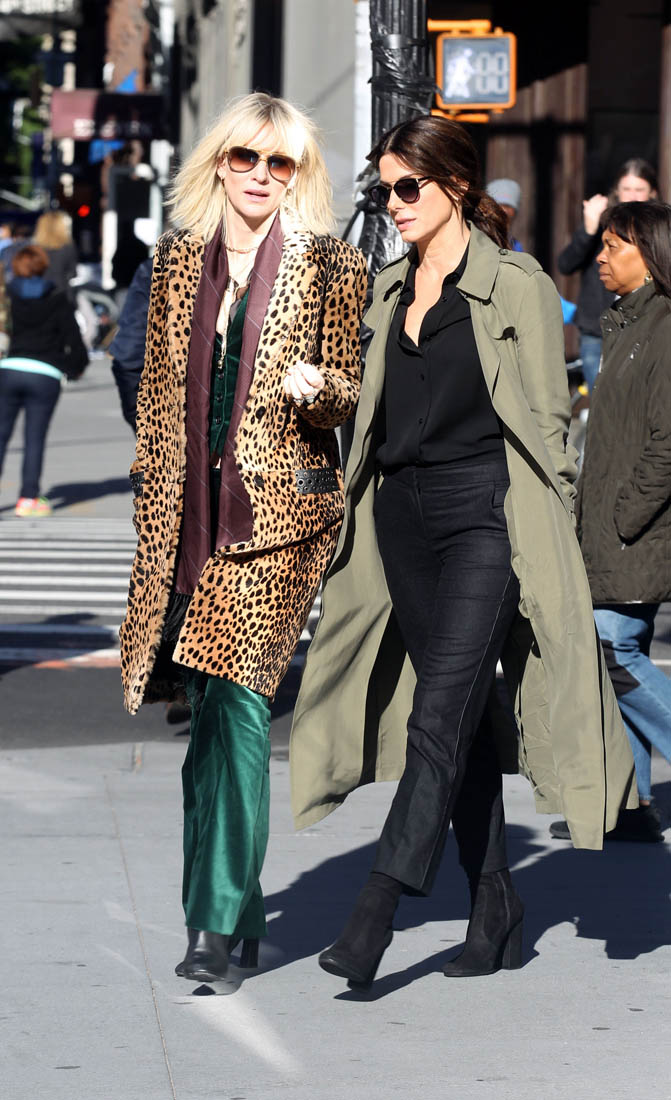 OK so far what we know is that Sandy may or may not be playing Danny Ocean’s (George Clooney) sister. And Cate’s in the Rusty Ryan (Brad Pitt) role, which you kinda see already because that coat could be this movie’s version of the line “Ted Nugent wants his shirt back”. Will Cate be eating in several scenes?