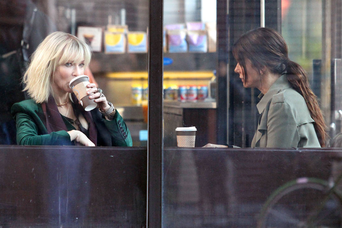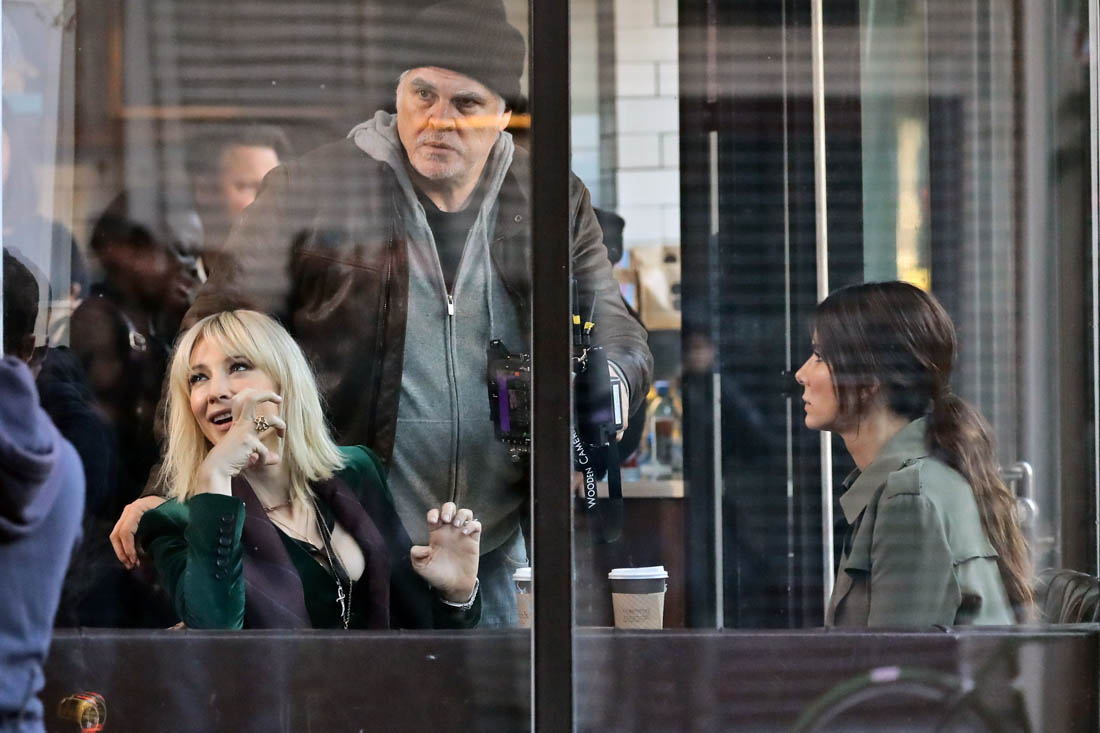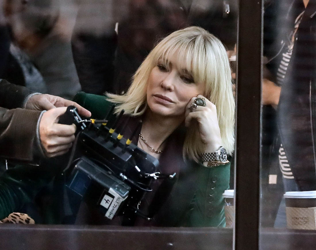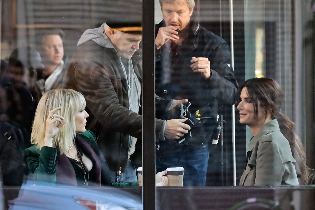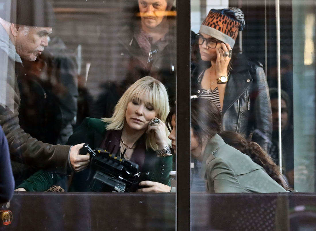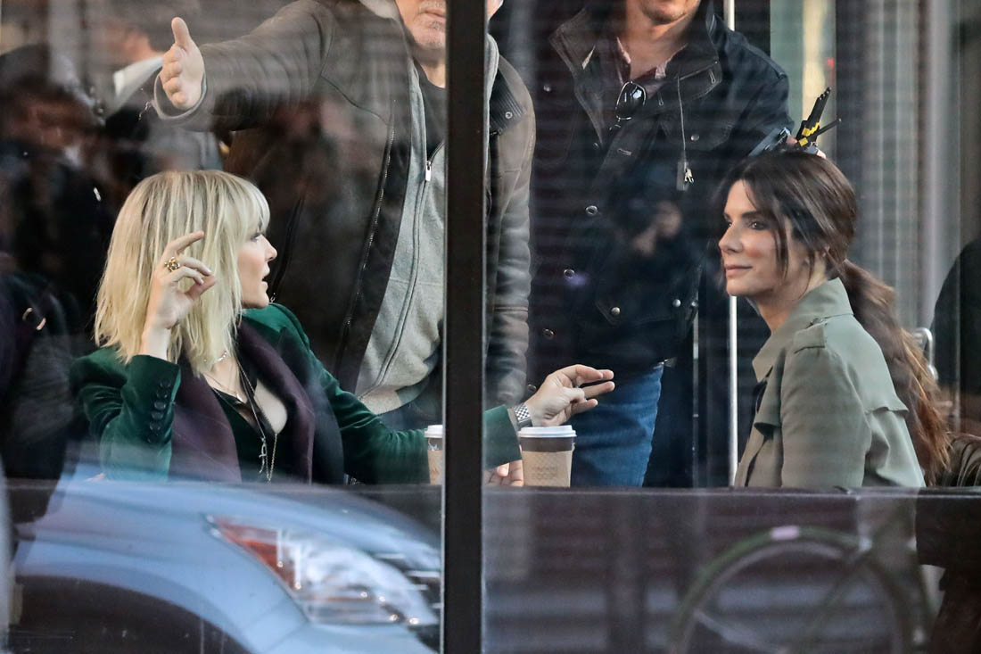 OK so far what we know is that Sandy may or may not be playing Danny Ocean’s (George Clooney) sister. And Cate’s in the Rusty Ryan (Brad Pitt) role, which you kinda see already because that coat could be this movie’s version of the line “Ted Nugent wants his shirt back”. Will Cate be eating in several scenes?
