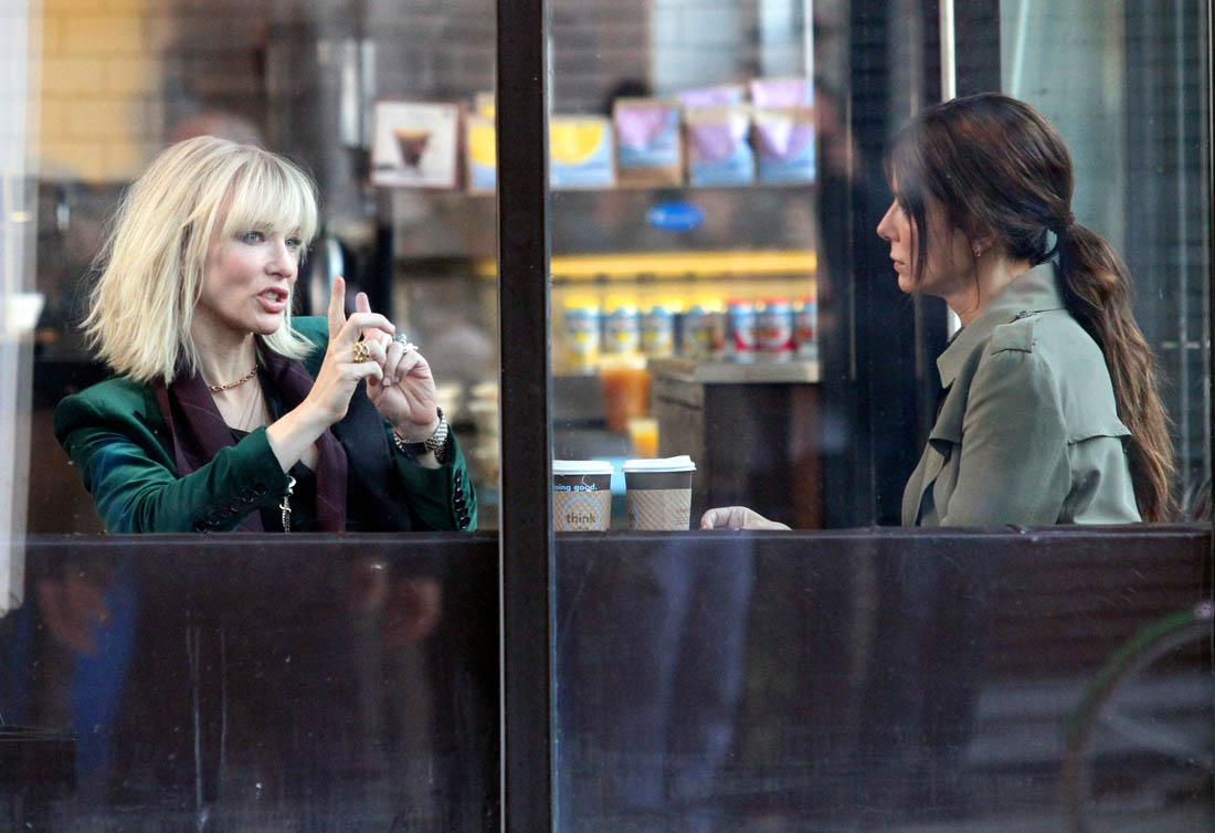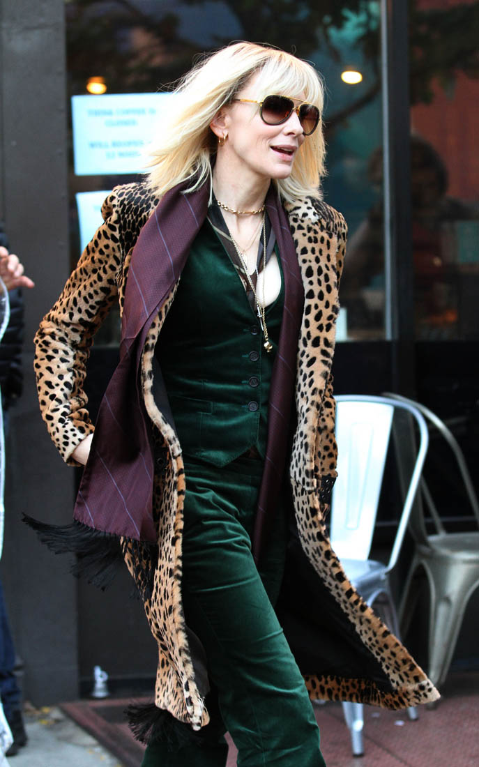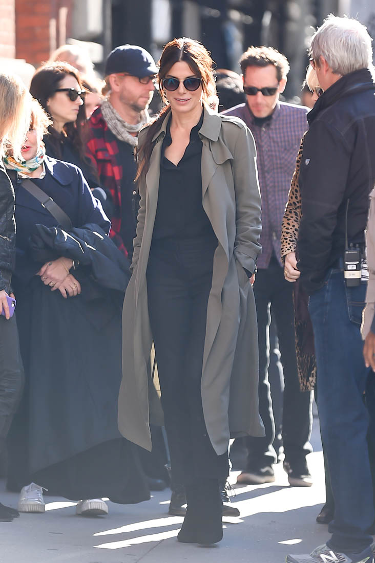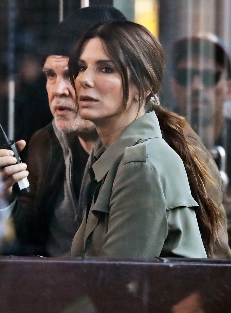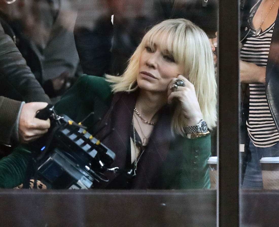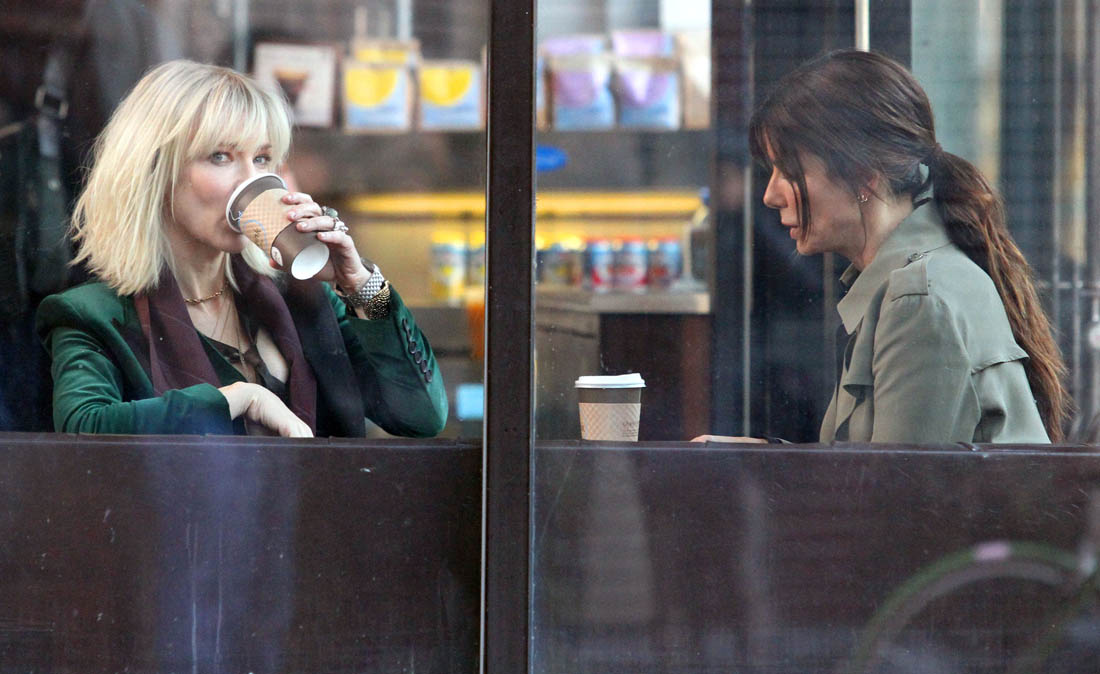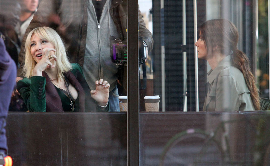 OK so far what we know is that Sandy may or may not be playing Danny Ocean’s (George Clooney) sister. And Cate’s in the Rusty Ryan (Brad Pitt) role, which you kinda see already because that coat could be this movie’s version of the line “Ted Nugent wants his shirt back”. Will Cate be eating in several scenes?