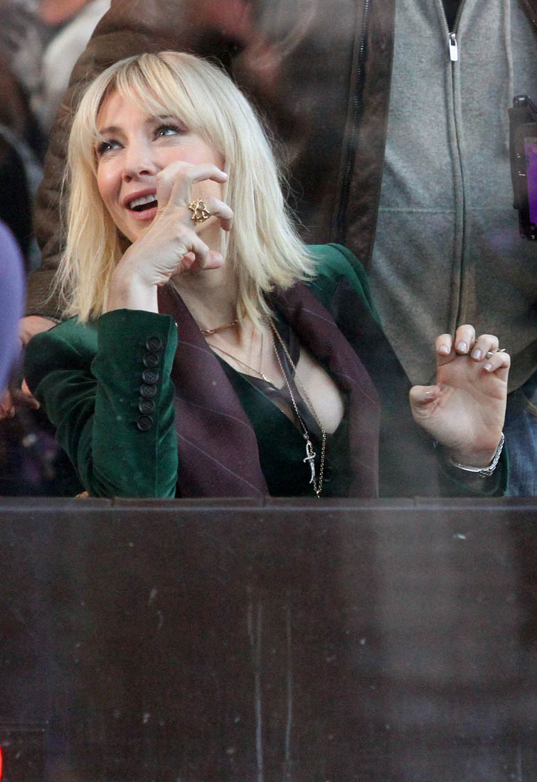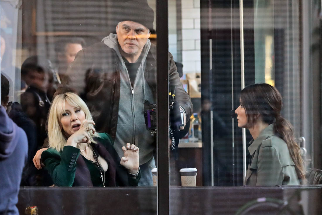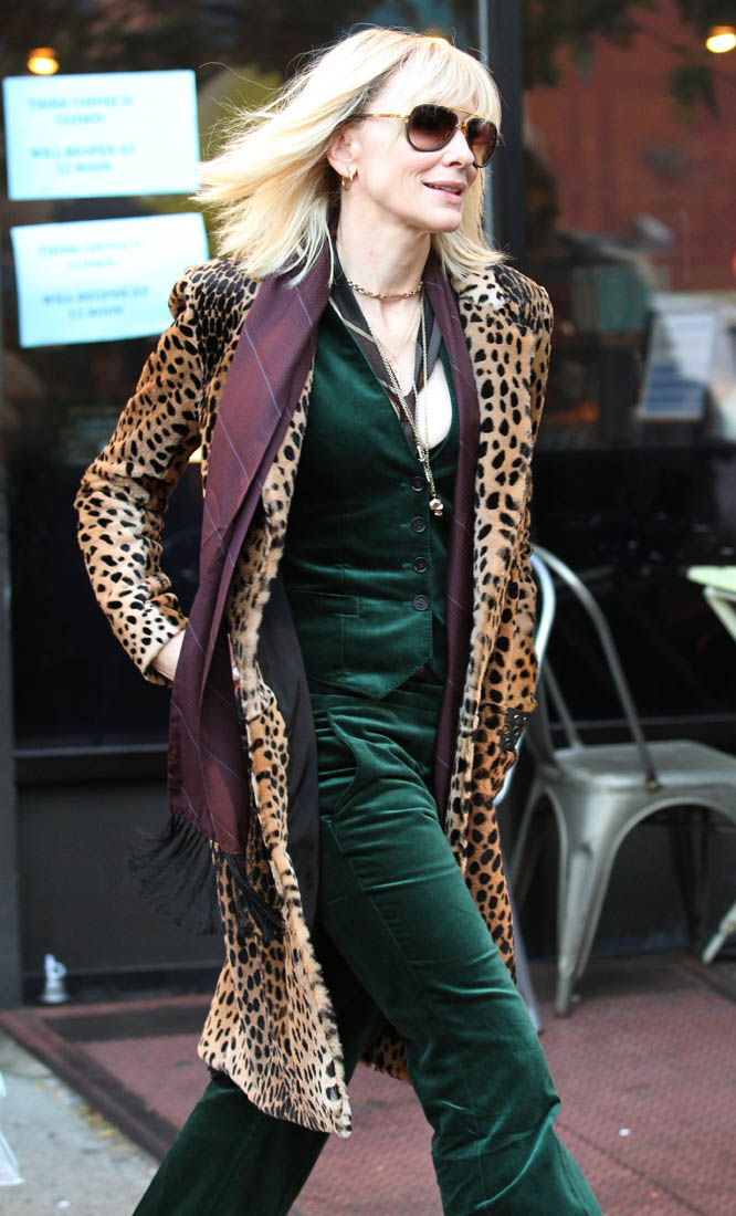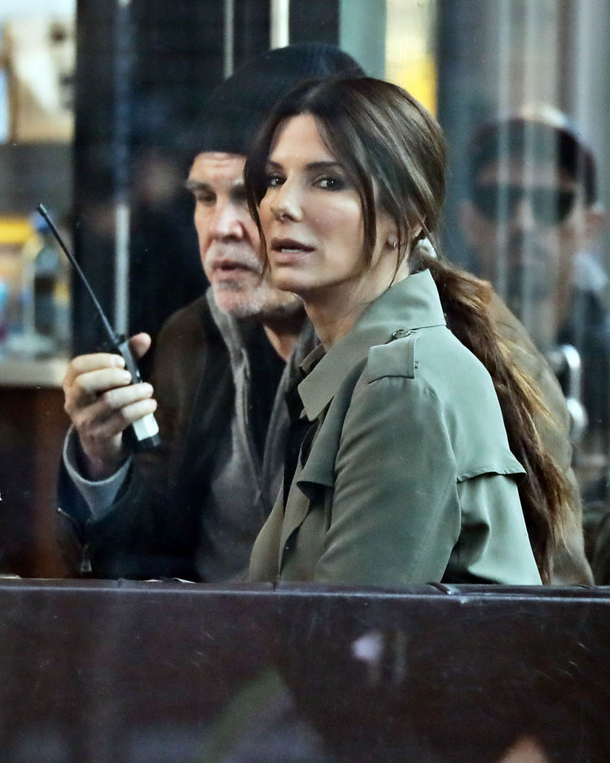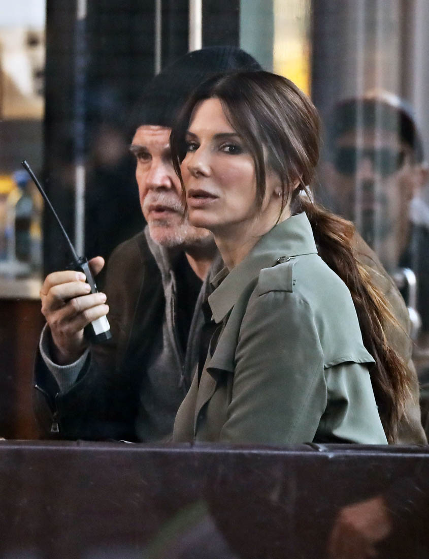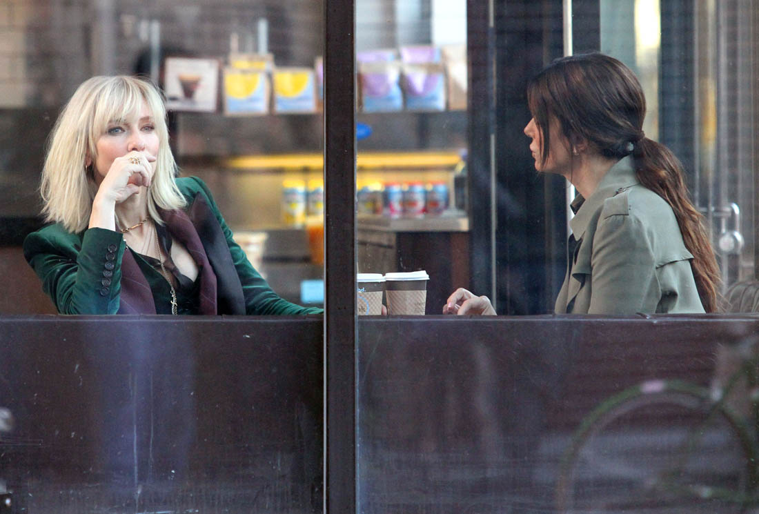 OK so far what we know is that Sandy may or may not be playing Danny Ocean’s (George Clooney) sister. And Cate’s in the Rusty Ryan (Brad Pitt) role, which you kinda see already because that coat could be this movie’s version of the line “Ted Nugent wants his shirt back”. Will Cate be eating in several scenes?