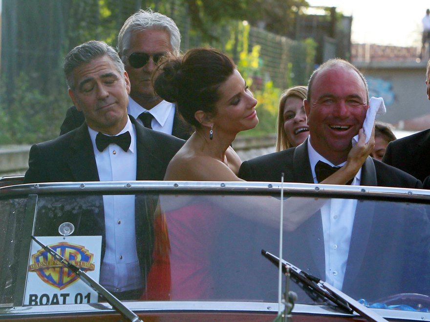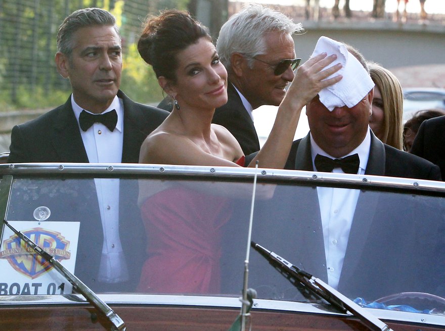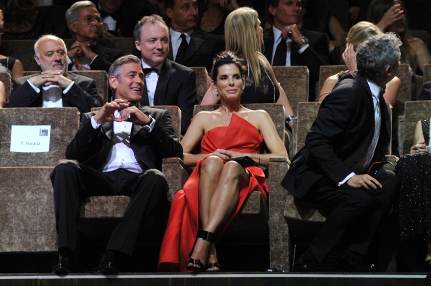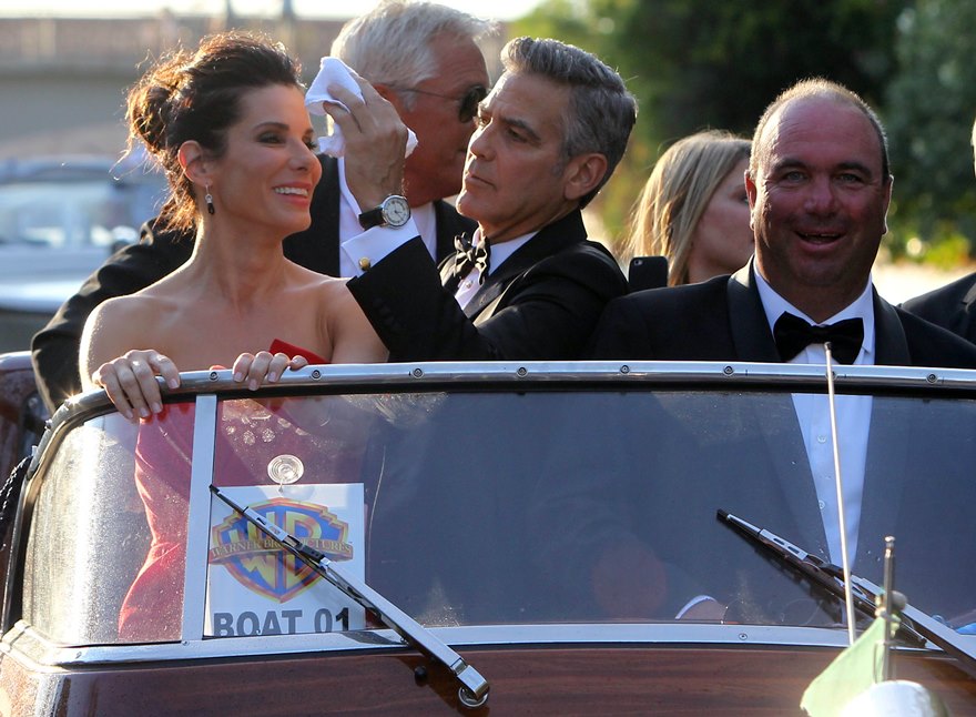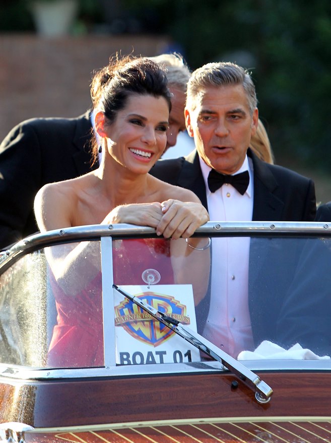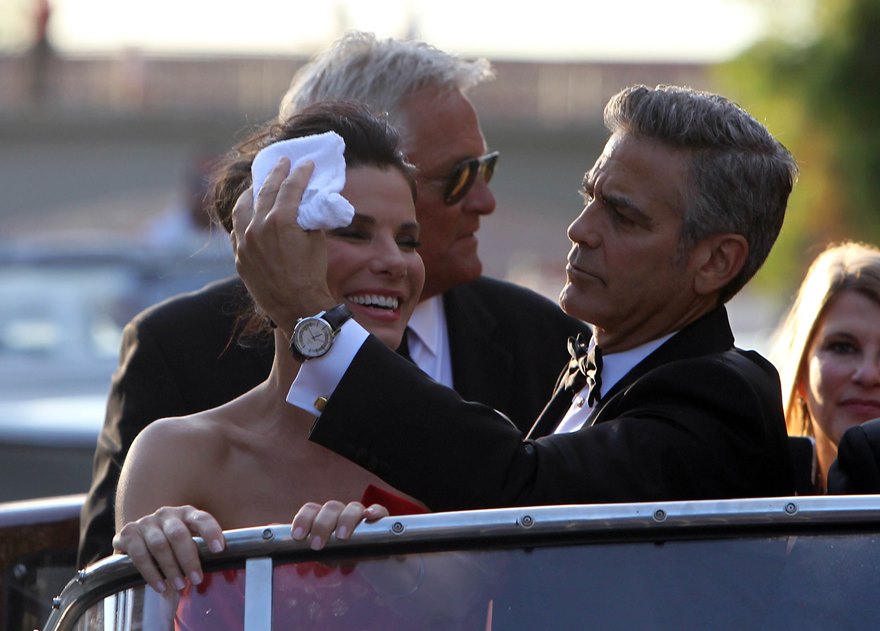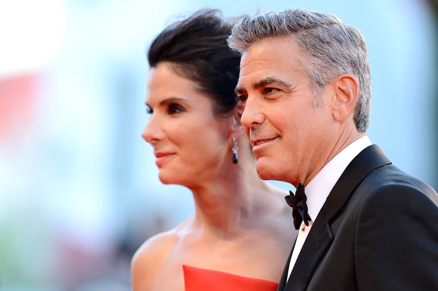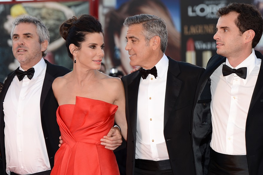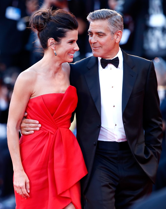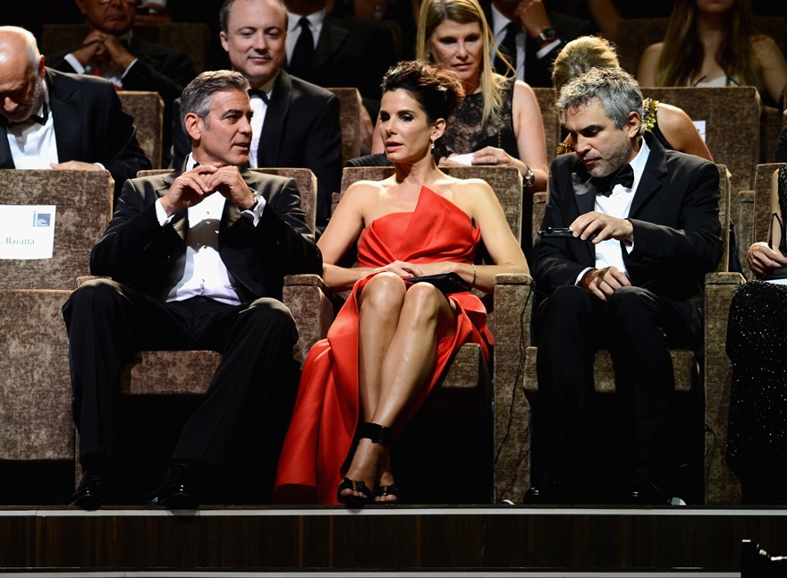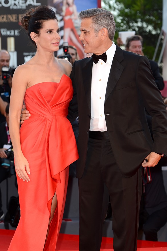 Check them out, arriving at the gala premiere of Gravity tonight. And what a handsome couple. He’s wiping her brow. She’s wiping the captain’s brow. He’s wiping the captain’s brow too. They are ENTERTAINERS. They will play. They are professional equals. They are maturity equals. I guess… I guess that’s too perfect, isn’t it? It’s too good to be true.