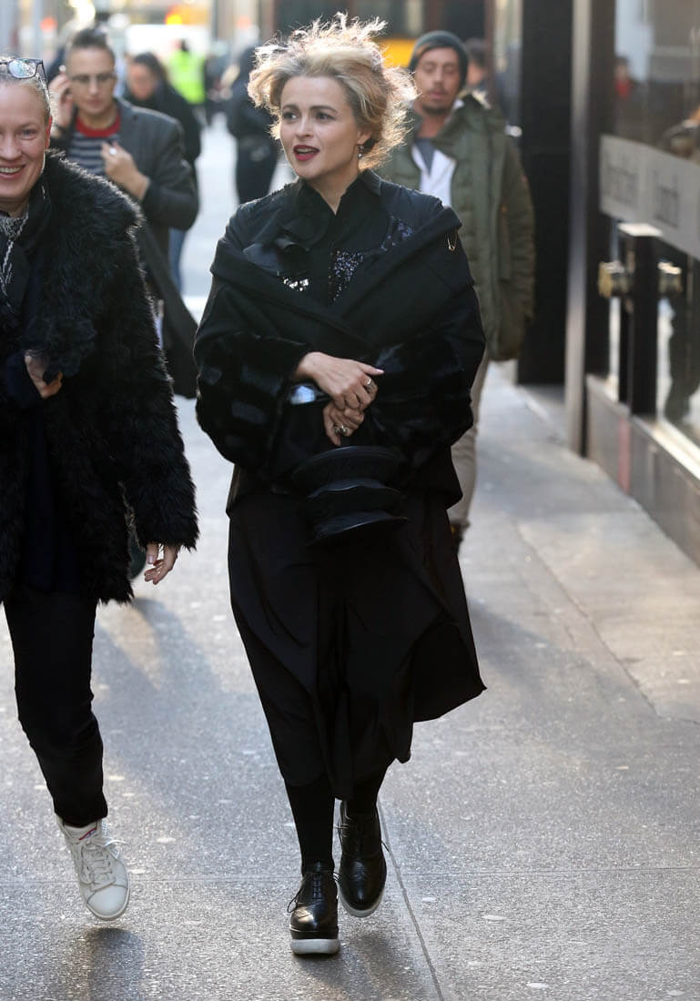 More shots of Sandra Bullock, Cate Blanchett, joined by Helena Bonham Carter on the New York set of Ocean's Eight. I’m stupid. I was focused on the casting and the story, it never occurred to me that fashion would be a character on this movie since they’re robbing the MET Gala, OMG! Cate was wearing a killer print coat the other day. Today, there’s another great jacket, and accessories, and Sandy’s in an excellent coat too, with a perfect pair of pants. And while HBC’s steeze may not be your particular jam, I am all about those shoes and whatever it is that’s cascading down her blazer.