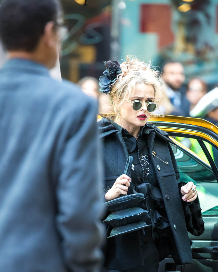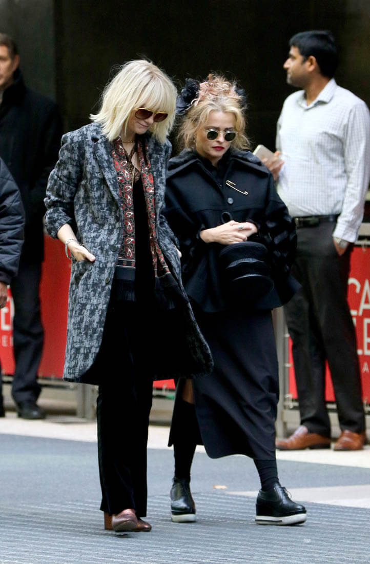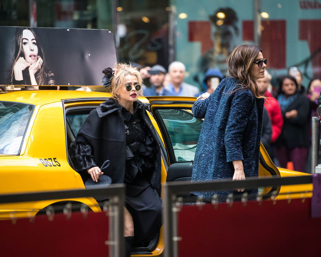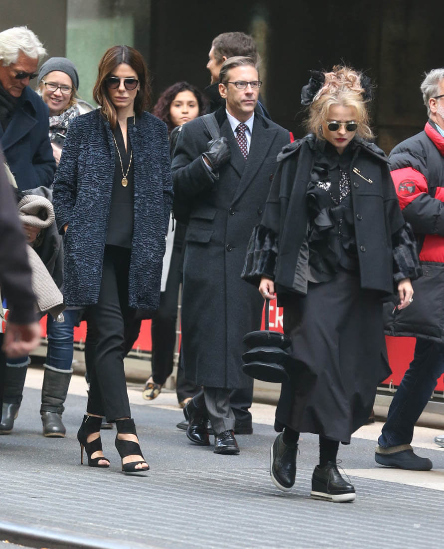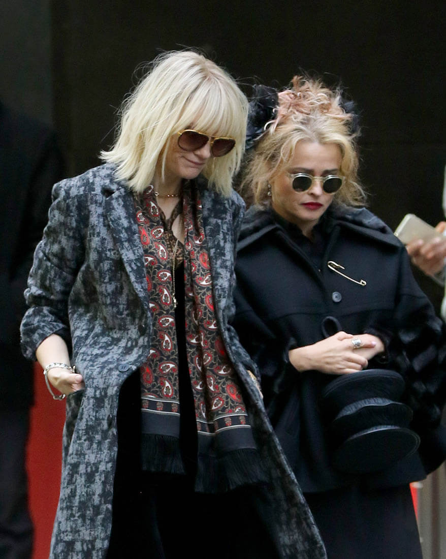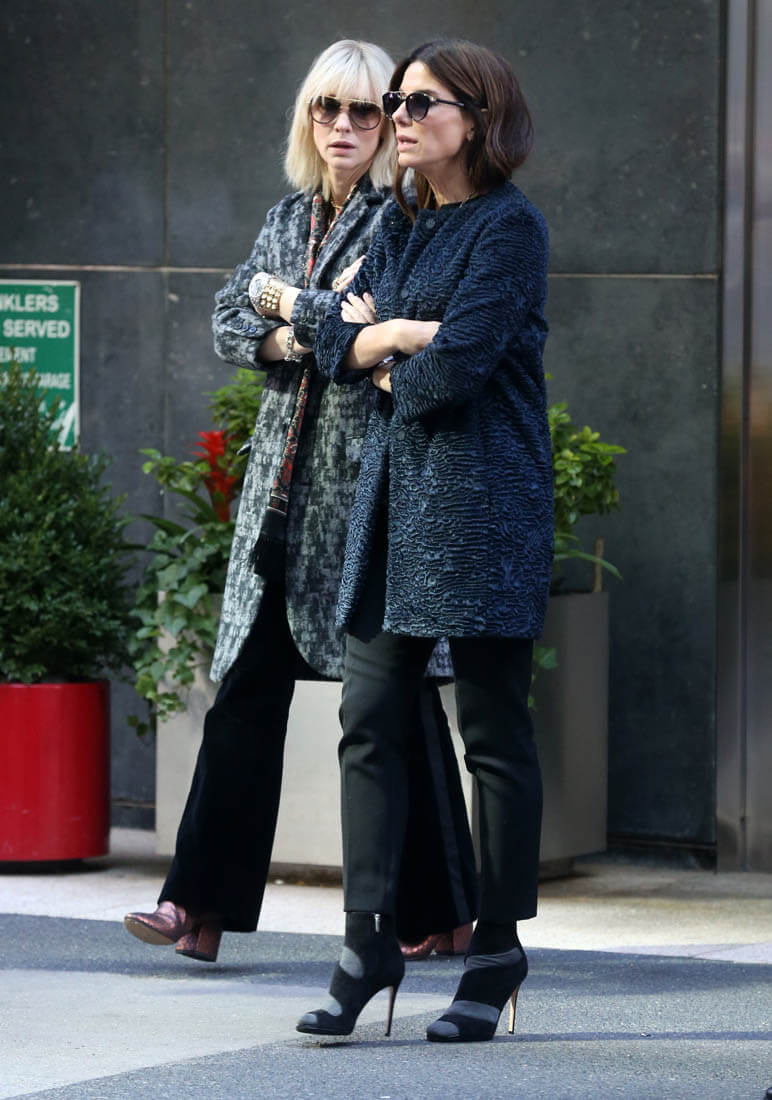 More shots of Sandra Bullock, Cate Blanchett, joined by Helena Bonham Carter on the New York set of Ocean's Eight. I’m stupid. I was focused on the casting and the story, it never occurred to me that fashion would be a character on this movie since they’re robbing the MET Gala, OMG! Cate was wearing a killer print coat the other day. Today, there’s another great jacket, and accessories, and Sandy’s in an excellent coat too, with a perfect pair of pants. And while HBC’s steeze may not be your particular jam, I am all about those shoes and whatever it is that’s cascading down her blazer.