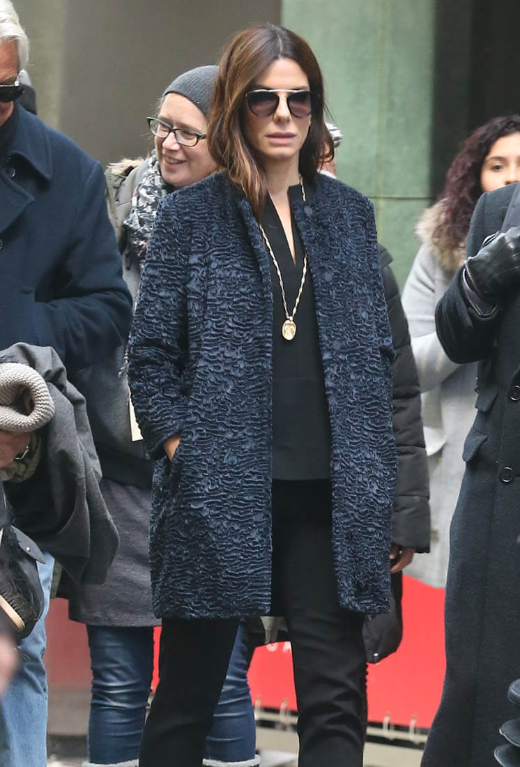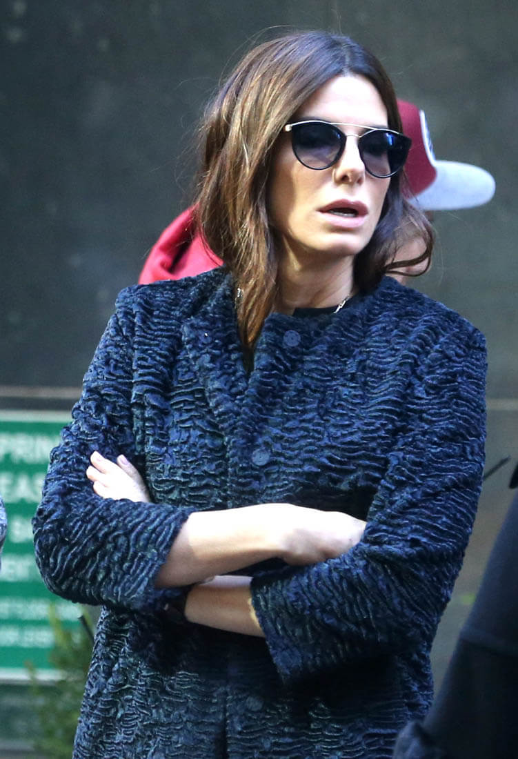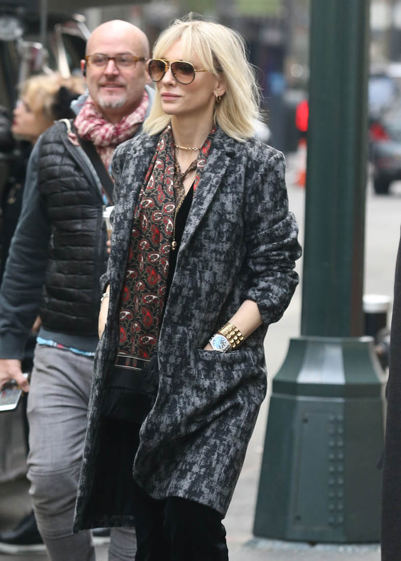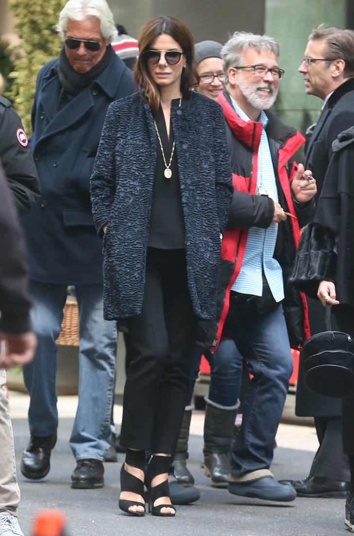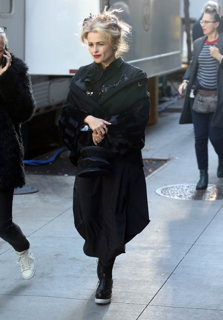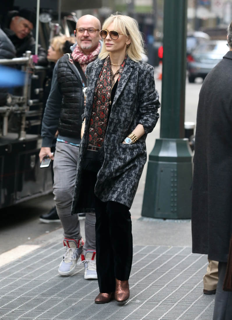 More shots of Sandra Bullock, Cate Blanchett, joined by Helena Bonham Carter on the New York set of Ocean's Eight. I’m stupid. I was focused on the casting and the story, it never occurred to me that fashion would be a character on this movie since they’re robbing the MET Gala, OMG! Cate was wearing a killer print coat the other day. Today, there’s another great jacket, and accessories, and Sandy’s in an excellent coat too, with a perfect pair of pants. And while HBC’s steeze may not be your particular jam, I am all about those shoes and whatever it is that’s cascading down her blazer.