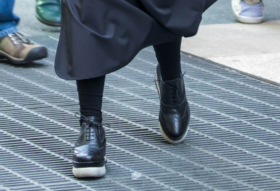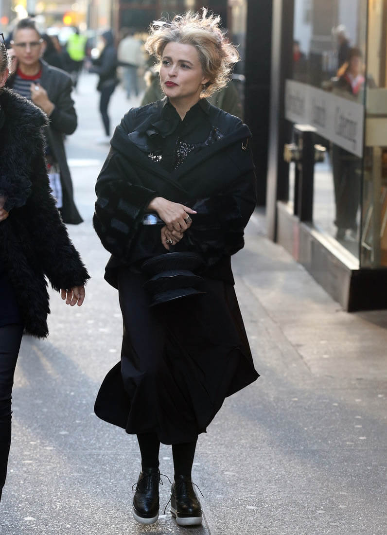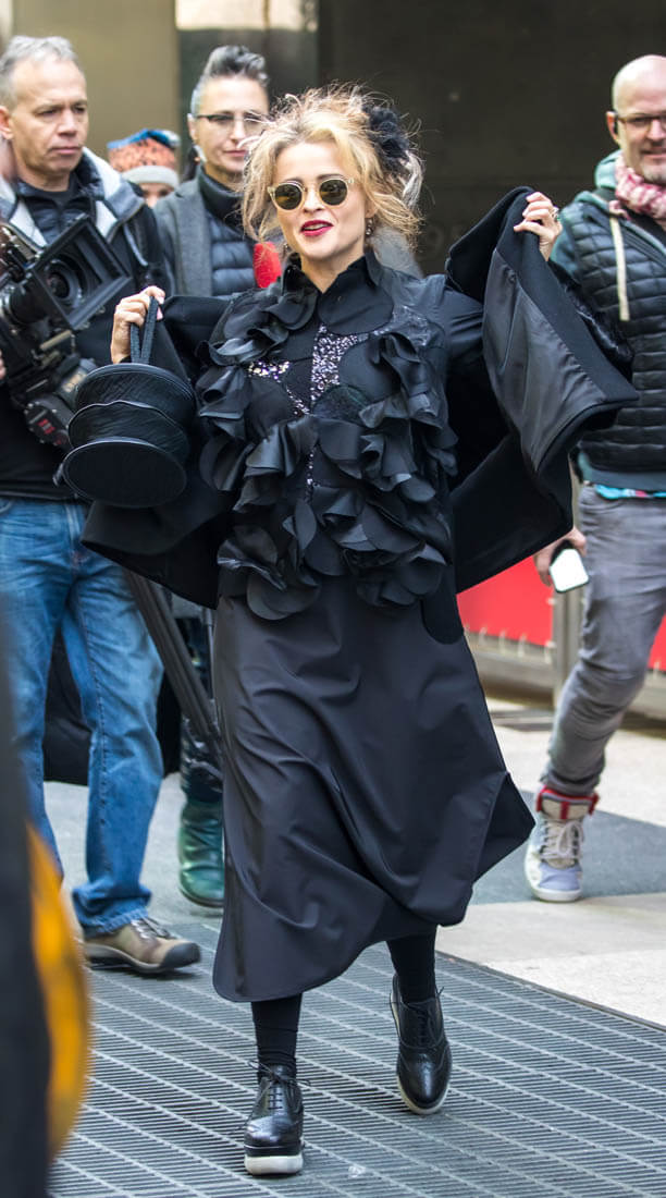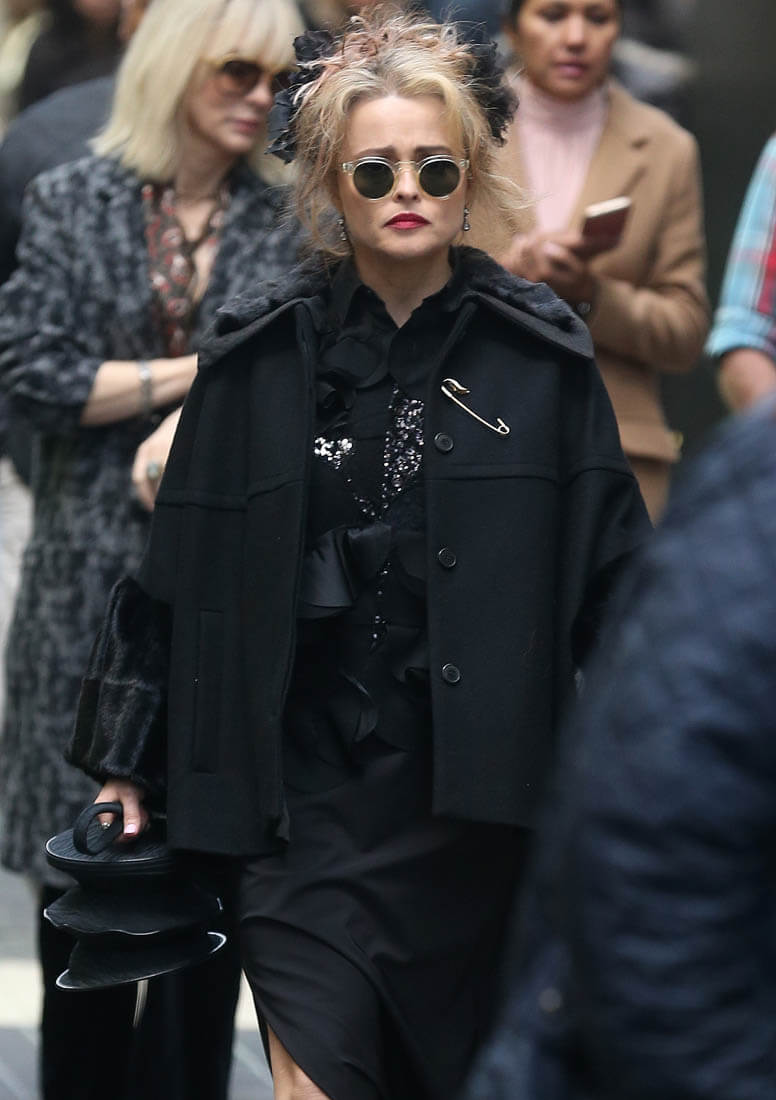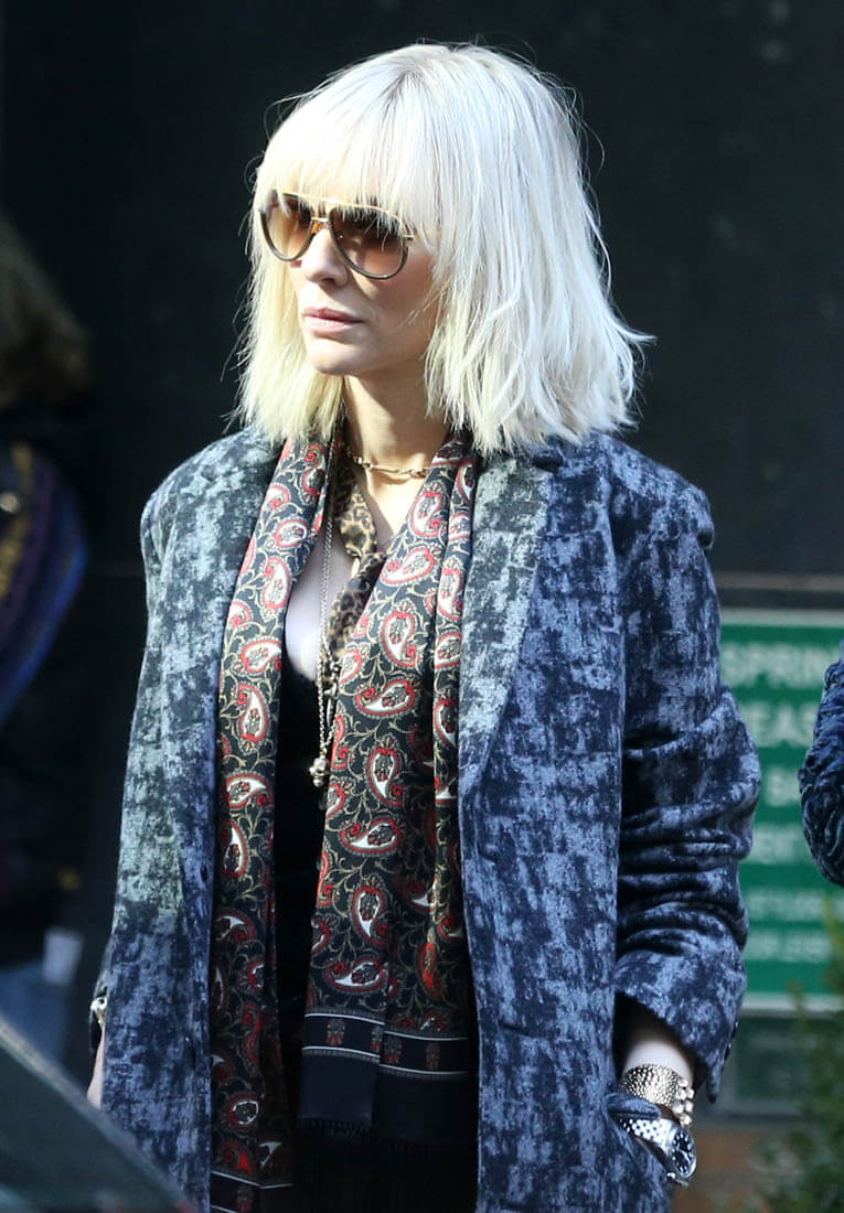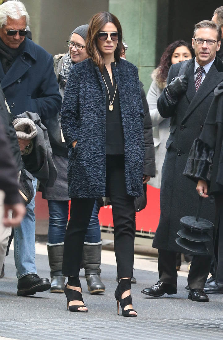 More shots of Sandra Bullock, Cate Blanchett, joined by Helena Bonham Carter on the New York set of Ocean's Eight. I’m stupid. I was focused on the casting and the story, it never occurred to me that fashion would be a character on this movie since they’re robbing the MET Gala, OMG! Cate was wearing a killer print coat the other day. Today, there’s another great jacket, and accessories, and Sandy’s in an excellent coat too, with a perfect pair of pants. And while HBC’s steeze may not be your particular jam, I am all about those shoes and whatever it is that’s cascading down her blazer.