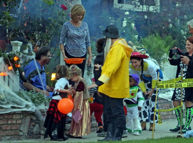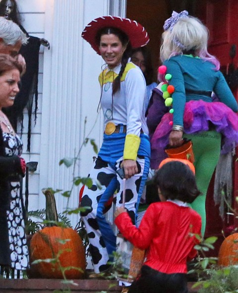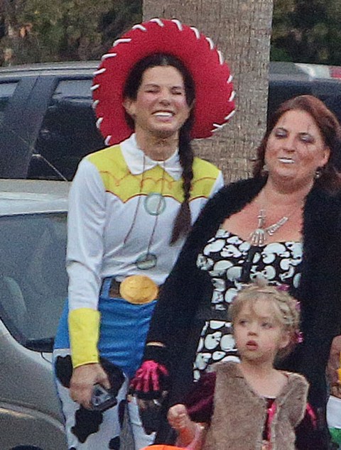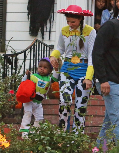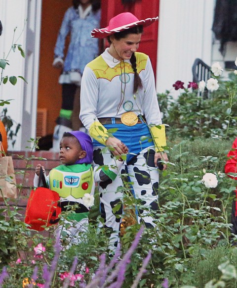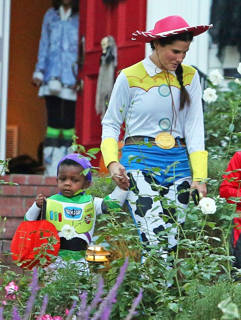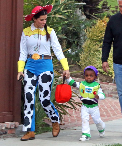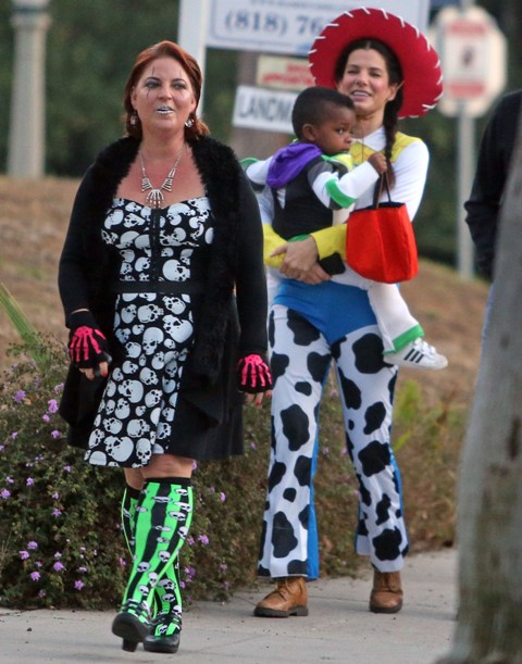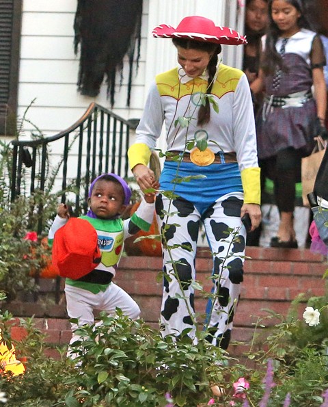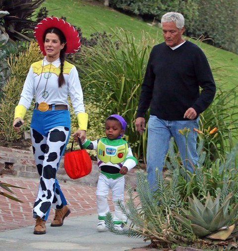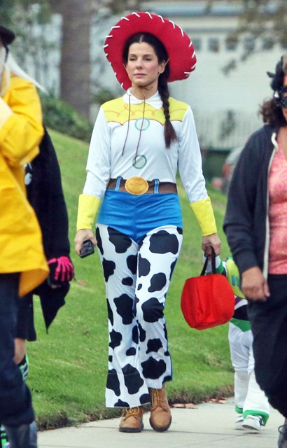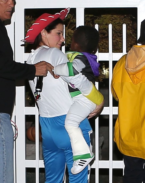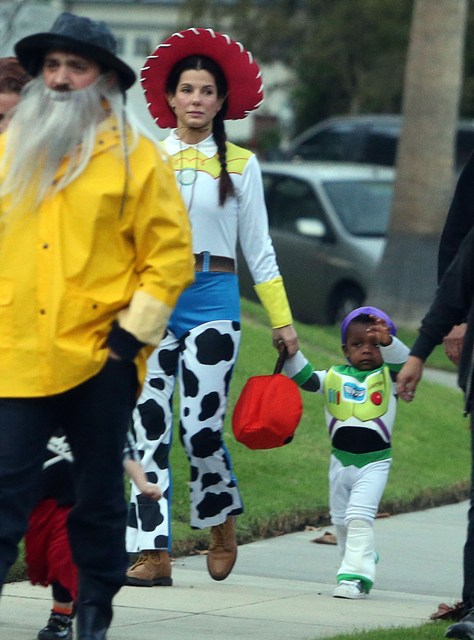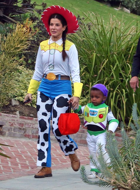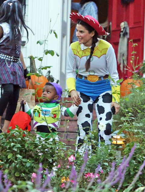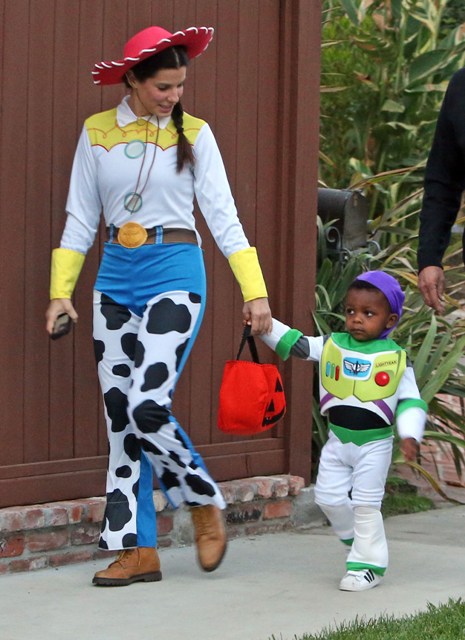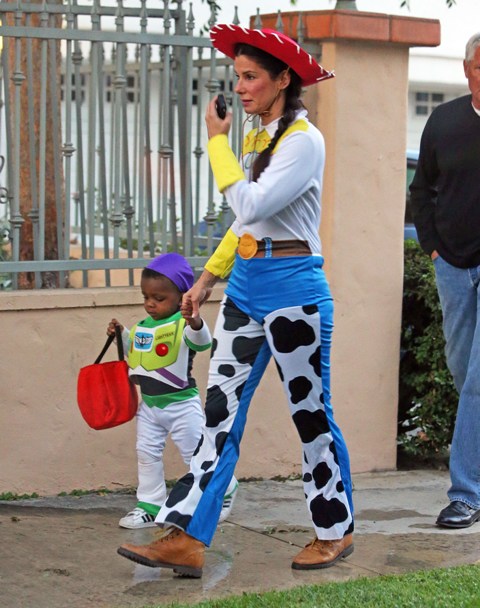 So there’s Mimi, who would never be so stupid and selfless as to sacrifice looking hot and being the centre of attention, especially not at Halloween, and then there’s Sandra Bullock, who took little Louis out trick-or-treating yesterday in Toluca Lake dressed up as cowgirl Jessie to her son’s Buzz Lightyear. Buzz seems very determined.