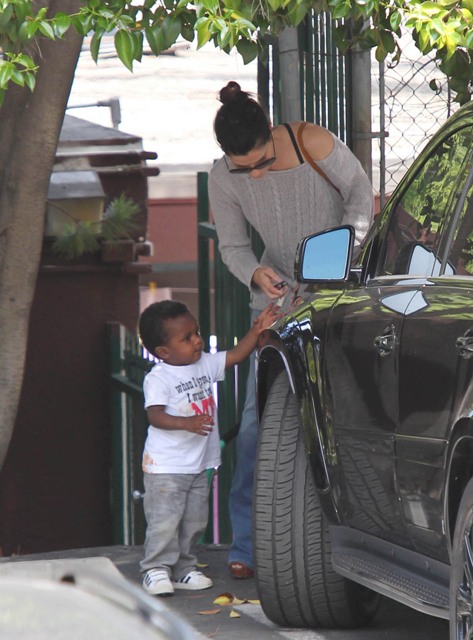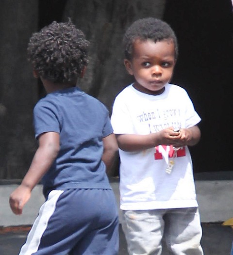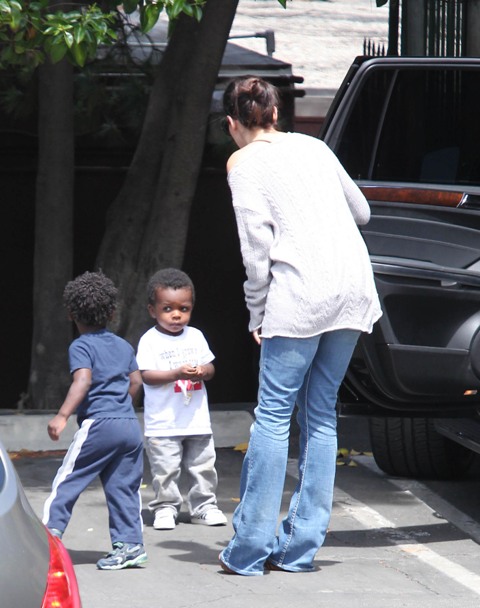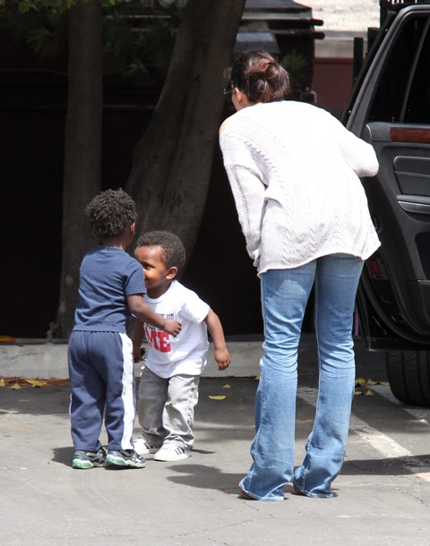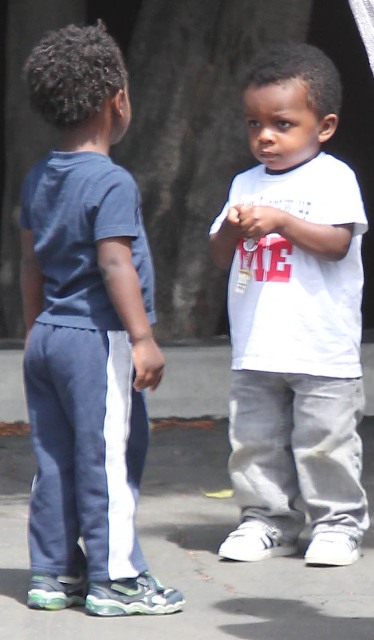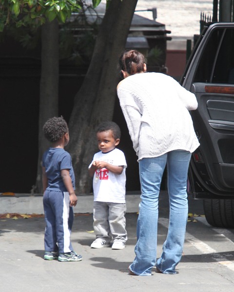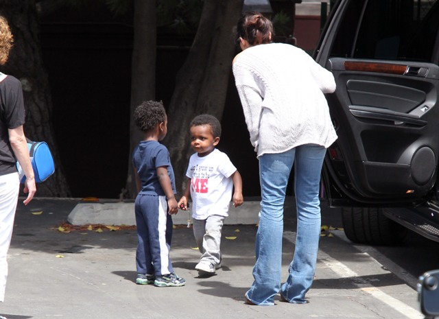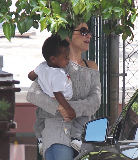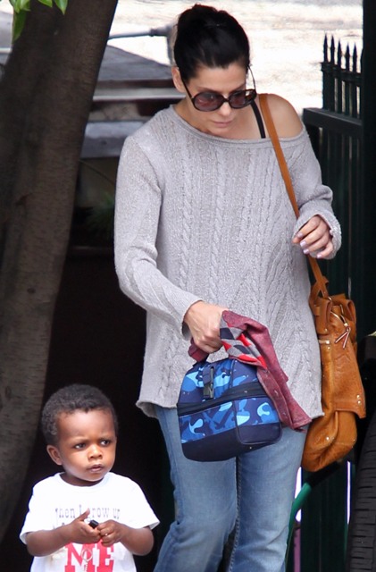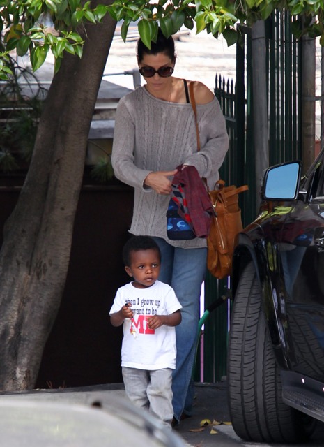 Sandra Bullock picked up her son Louis from school yesterday but had to wait while he wrapped up his conversation with a little friend. I love the expression on his face: equal parts affection and suspicion. Like, oh I really want to be buds, but have you been sent here by your mother to infiltrate my ma’s inner circle? Because if that’s the case, you need to answer to me.