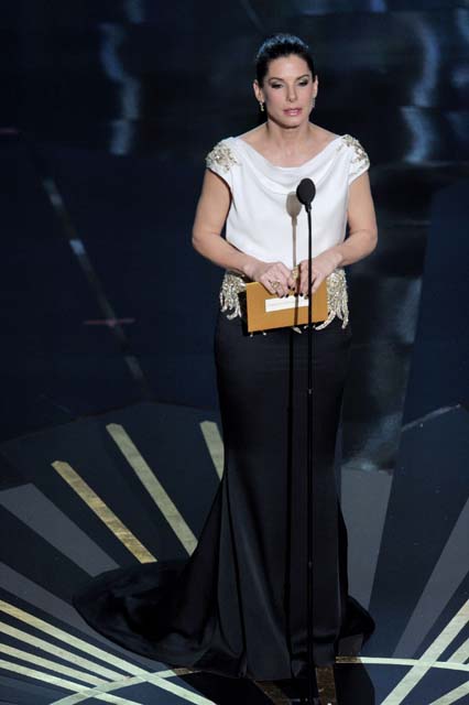 I felt this way about Sandra Bullock's dress. Everyone somehow saw it a millisecond before I did, and I thought, black, white, blouson, open back, maybe it won't be bad. I know a lot of people hated it merely because of the label that dare not speak its name.