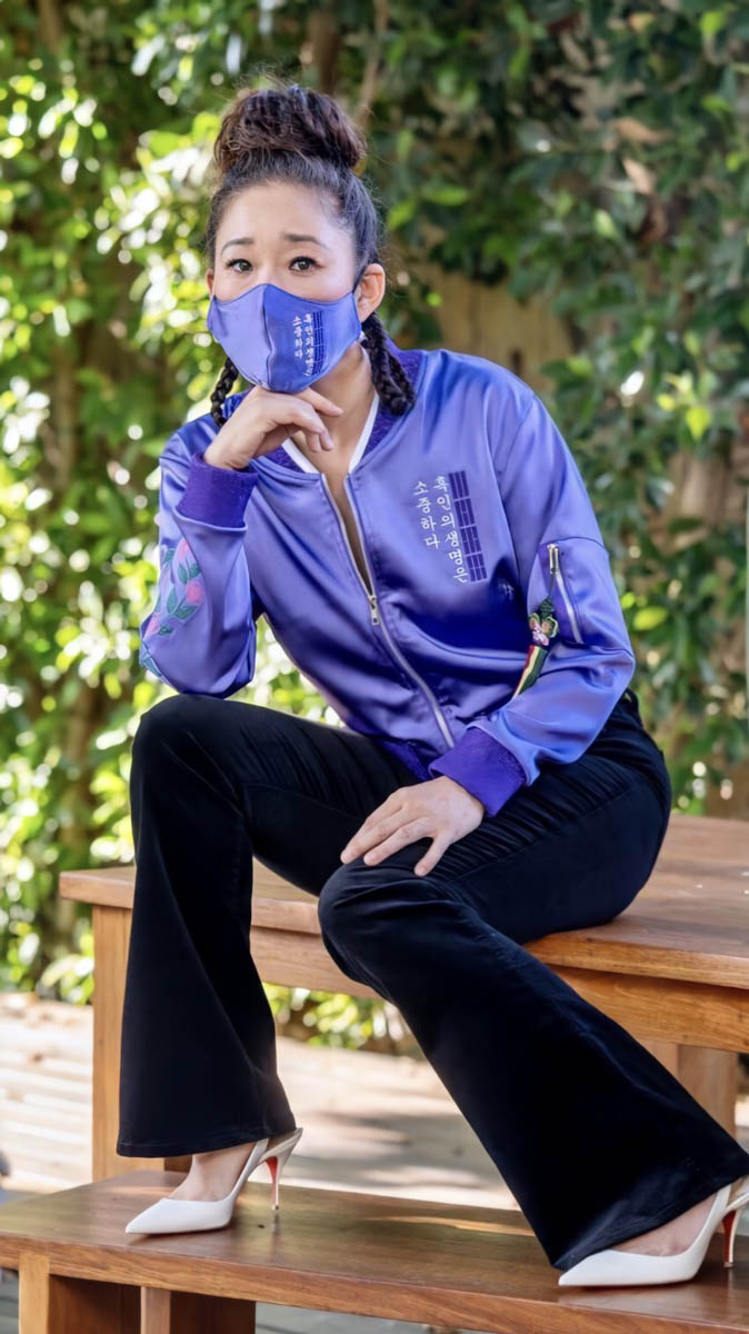 She’s wearing a custom jacket by Matthew Kim’s LA-based brand KORELIMITED which produced a line of t-shirts and hoodies in support of Black Lives Matter. Together they collaborated on a piece that honoured Sandra’s Korean heritage and paid tribute to Black culture. The writing on the bomber reads “Black Lives Are Precious” because “Black Lives Matter” is not directly translatable in Korean. The dashes are a nod to the Korean flag. And the colour, royal purple, carries meaning for both the Korean and Black communities. It’s “super Korean”, as Sandra said, and just think, as one example, of the use of purple in Black Panther (vibranium is purple, derived from the purple “heart-shaped herb”, reserved for the Wakandan ruler and their family, fitting because the colour symbolises royalty and power).