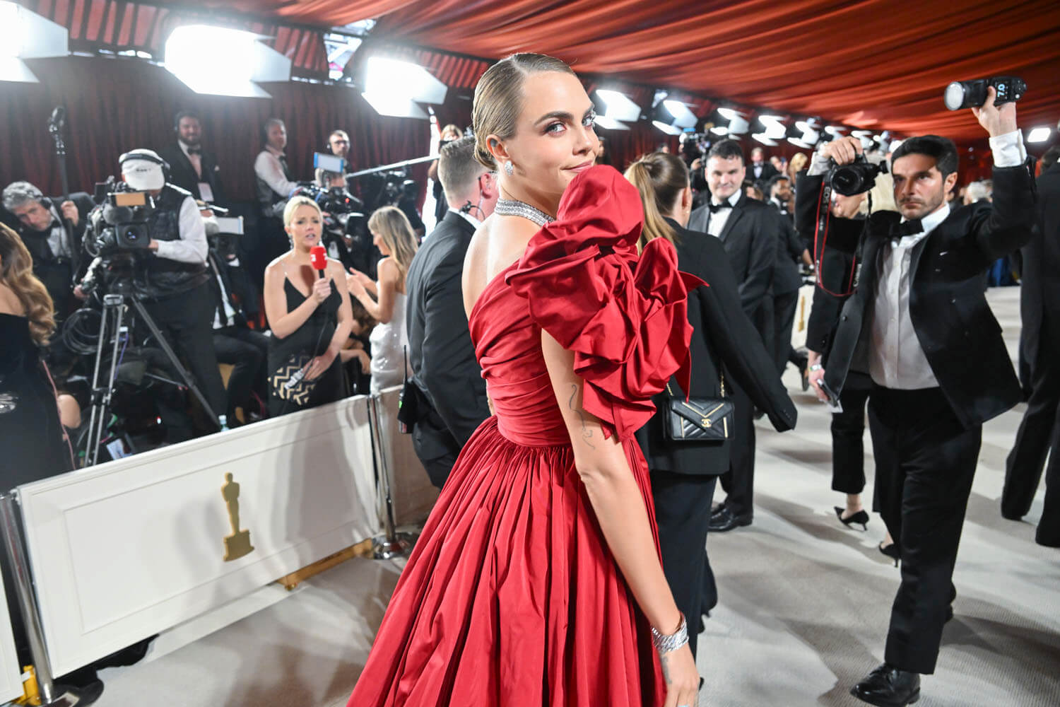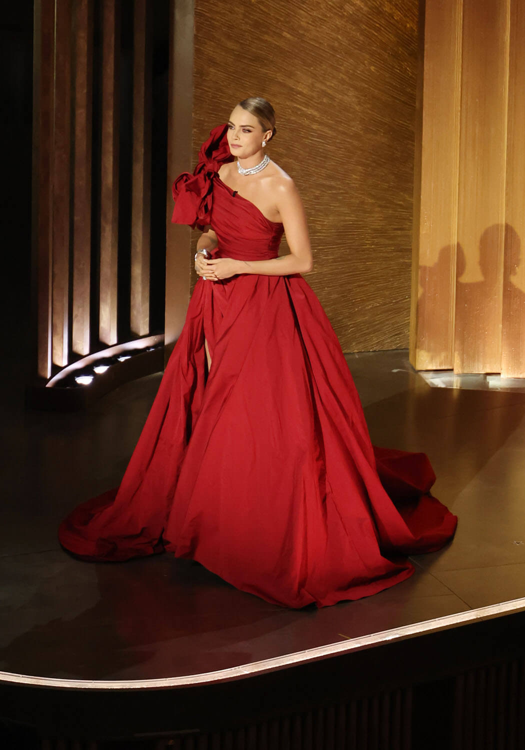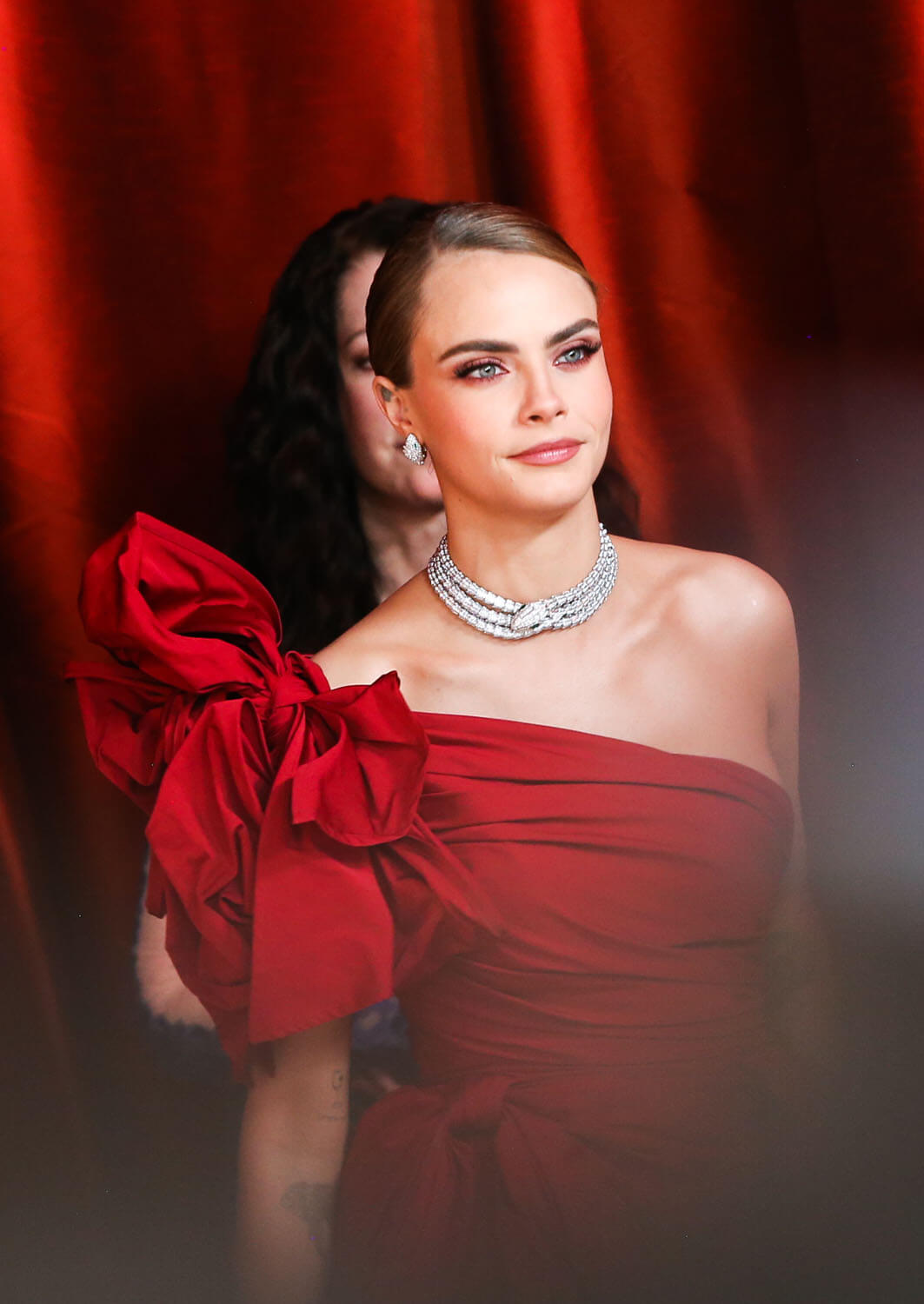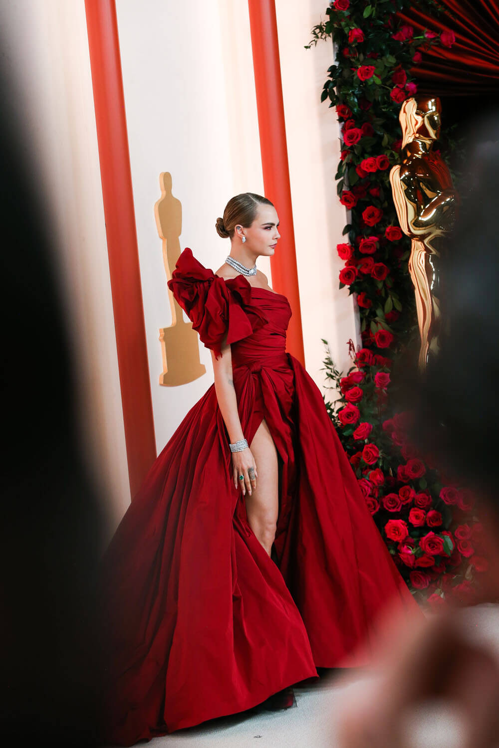 So it was with relief that I saw Cara Delevingne in this crimson number by Elie Saab. It pops! She doesn’t look washed out! She defeated that dusty rug!