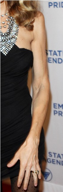 Last night Sarah Jessica Parker attended the Empire State Pride Agenda event last night. Am all over the dress and the tights and the everything, but her arms, in these photos they’re kinda grossing me out. And check it – skinny bitches can have that weird little skin pocket in between the armpit and the chest too.