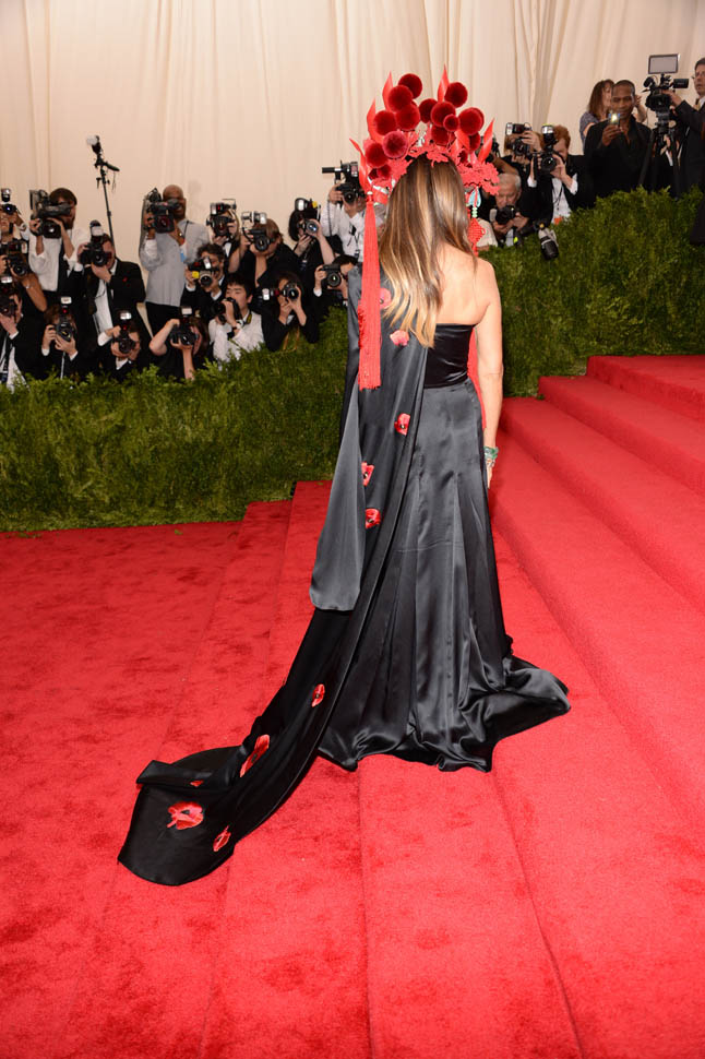 So of course it was SJP who wore a Philip Treacy headpiece inspired by a ceremonial Chinese bride. My cousin Cat and I used to play at this all the time because there was always a bride on the Chinese kung old timey soap operas we used to watch. And it was always a blind marriage. Sometimes the groom would suck and she’d end up escaping and sometimes it’d end up being her true love and they’d turn hate to love but not before she was transported from her village or her family home in a carriage (held up by porters on sticks) with a curtain drawn across the front to her future husband’s home. Wearing a headdress similar to the one SJP has on, only with either a handkerchief covering her face or a row of tassels.