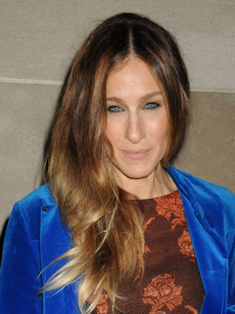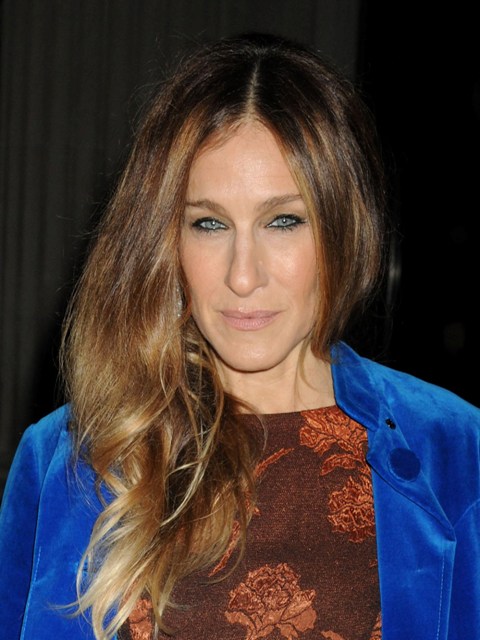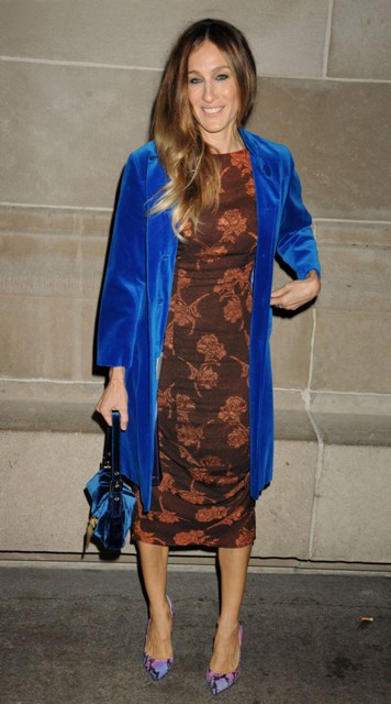 Love the length of this dress, especially the sleeves. And how she’s clashing it with her shoes. We should all have a long blue velvet blazer in our closets.