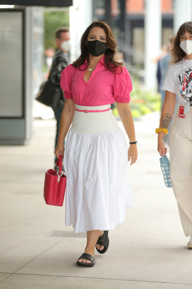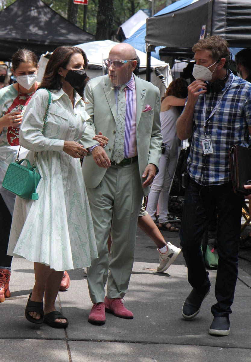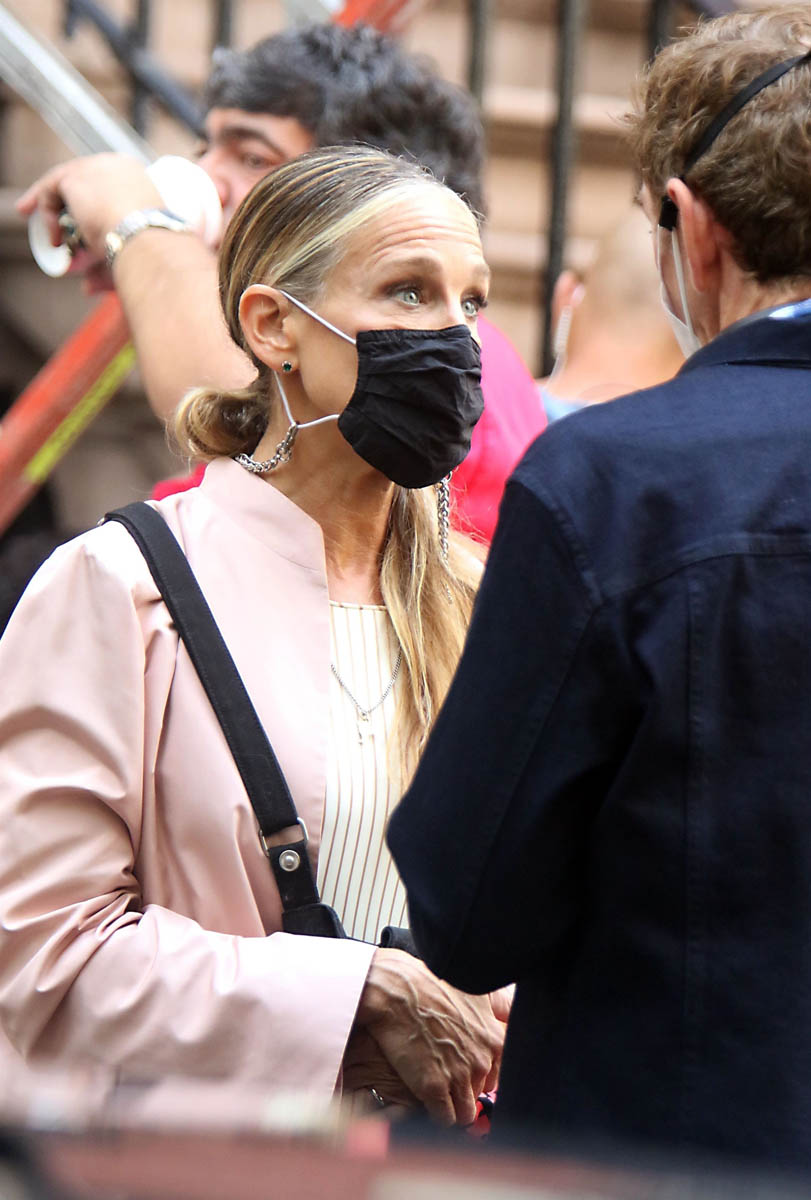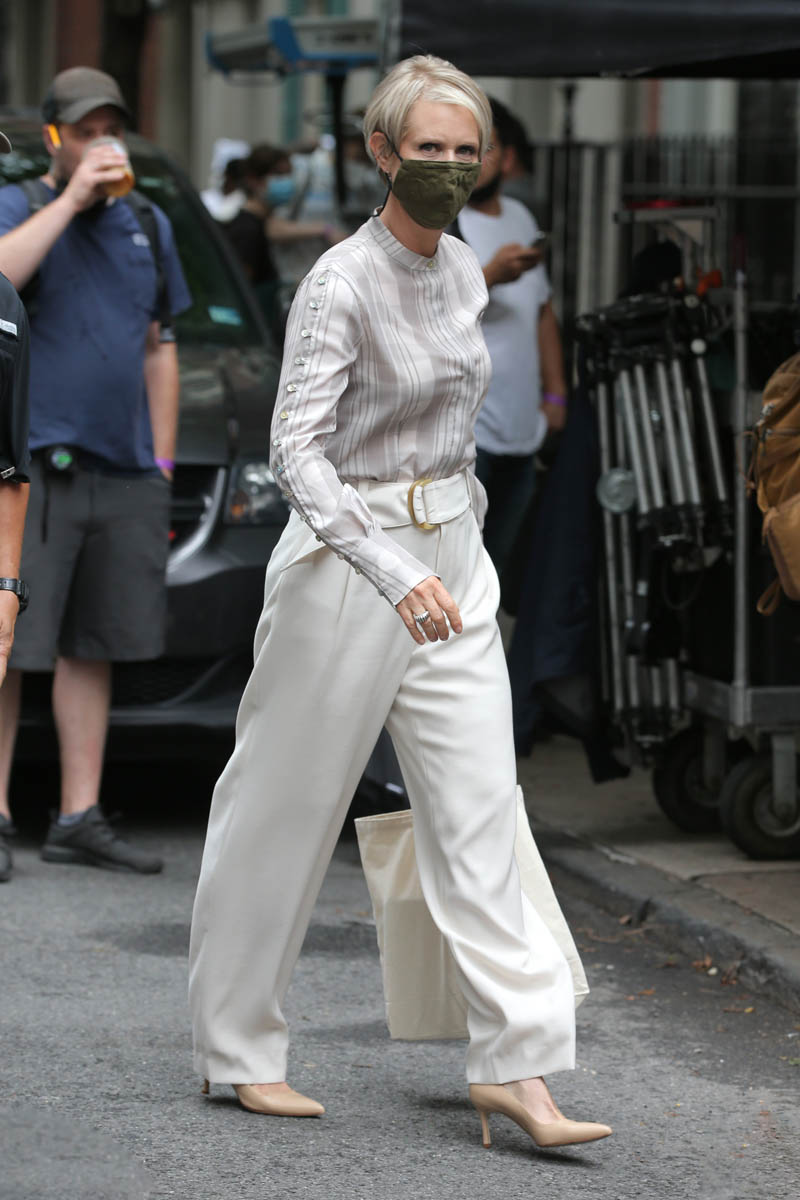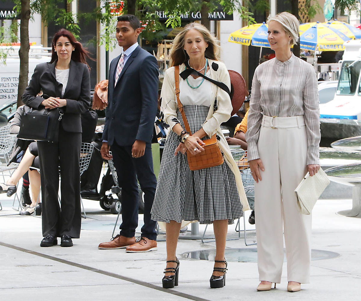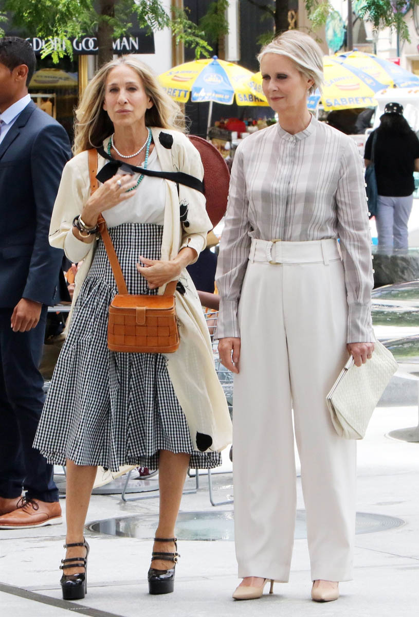 Anyway, we have a lot of time to discuss what the show will be and whether or not it will work so for now, let’s just focus on some surface observations and/or presumptions we can make from these photos, starting with the styling, which was always a big part of SATC. My first thought when these shots came out was that they have decided that Miranda will not have red hair. That’s how we always knew Miranda, even though Cynthia Nixon is a natural blonde. So it was deliberate creative choice, to make Miranda a redhead. Cynthia has said that she prefers her natural colour to her character’s colour and now that the characters are older, I suppose they’ve done away with Miranda’s hair signature, and I like it. I like the tone on her, and I really, really like the cut.