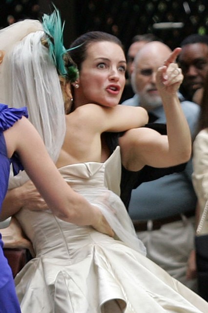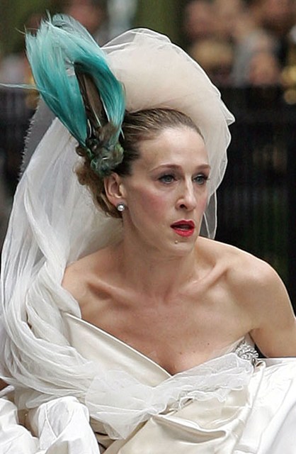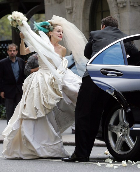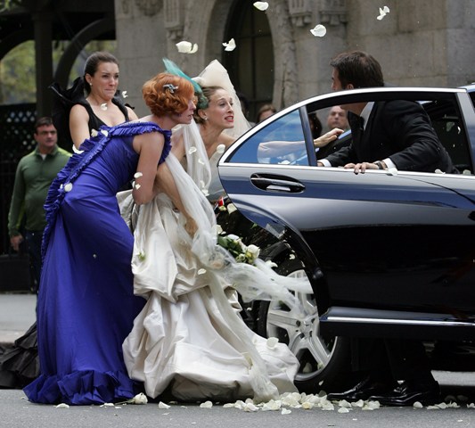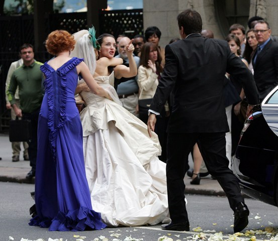 The girls were back on the streets shooting Carrie’s supposed wedding scene the other day – as you can see, SJP looks like a drag queen again in a dress that is 2 sizes too big in the breast. Apparently in this “dream sequence”, Carrie flips out and attacks Big with her bouquet.