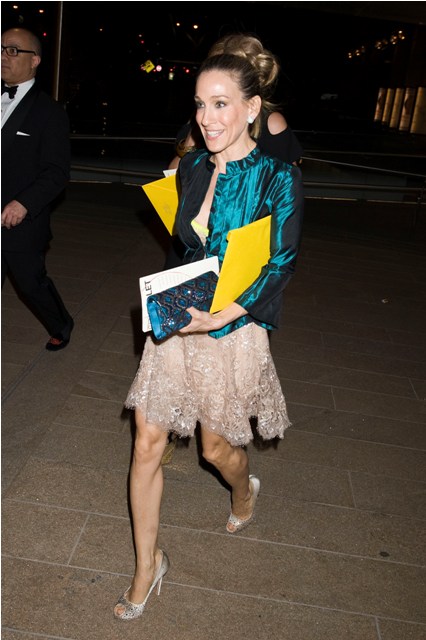 Sarah Jessica Parker attended the New York City Ballet spring opening last night. Love the jacket over the dress. Love. But... she is deathly thin right now, non? Like more so than usual. Perhaps it’s the stress of running after two babies and a preschooler. I’ll say it again though – she’s never slammed for her veins and her emaciated frame. Because the MiniVan Majority loves TBS Sex & the City. So fabulous! Let’s have cosmos followed by “exotic” Indian food!