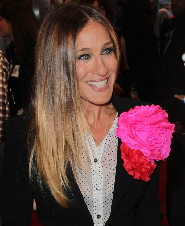 If we could all wear a sheer white blouse under a fitted tuxedo jacket. Black sheer? More forgiving. Pale sheer? Rolls. And I’m really into the big flower accent on her shoulder.
