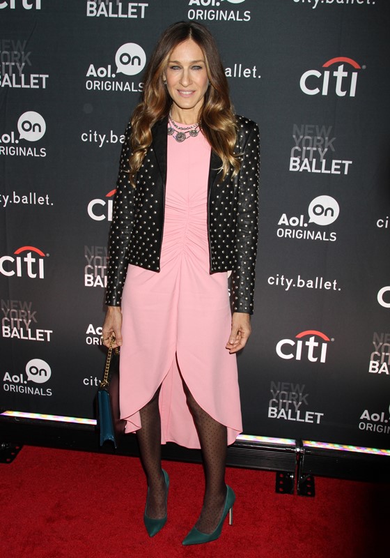 The only way this pink dress should be worn is under a badass jacket and never as the main event. When the pink is a supporting player, it works much better. She looks great.