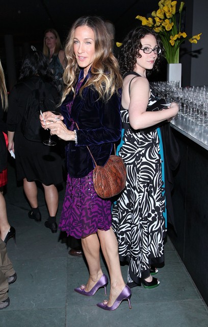 I generally don’t like heels with big ass sh-t on the toe. Like her “dream wedding” shoe in the Sex & The City movie. Somehow though she always makes it work. And I like the way she’s breaking it all up with that bag.