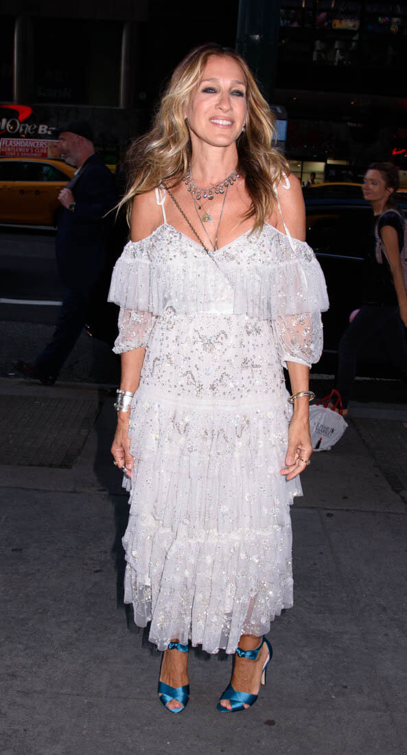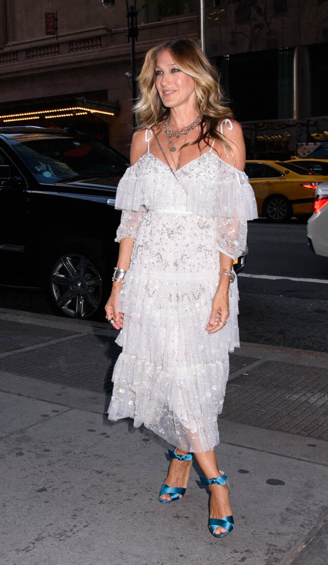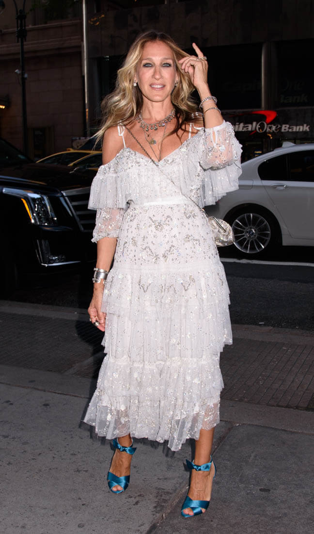 I can’t get enough of the off-the-shoulder. I want it to never go away. Especially when it’s so pretty and sparkly and shimmery like on this dress on SJP. So pretty! Too pretty to be ruined by those shoes.