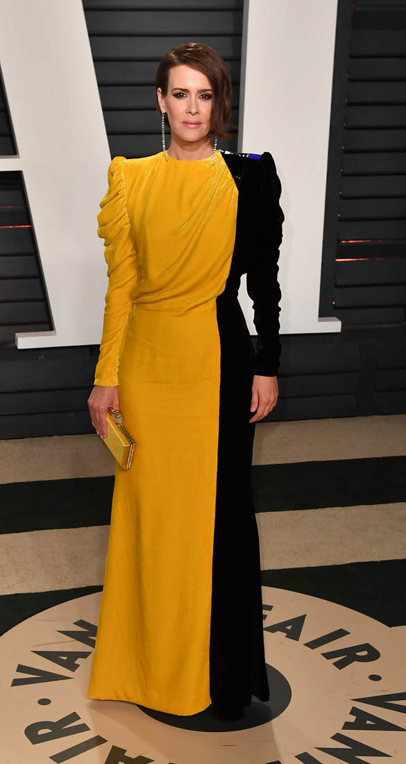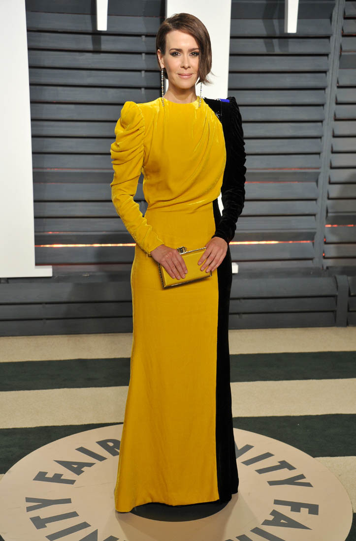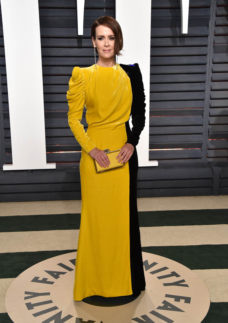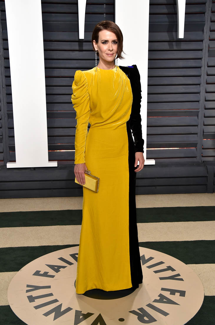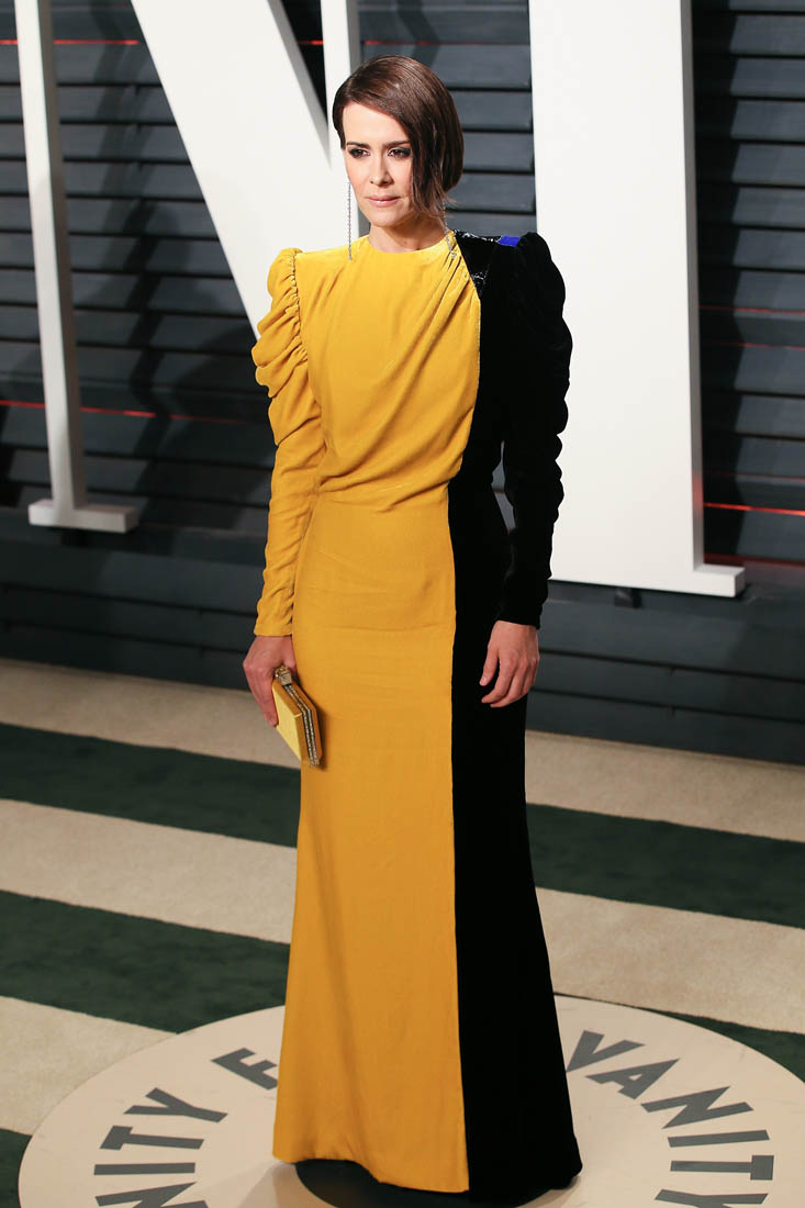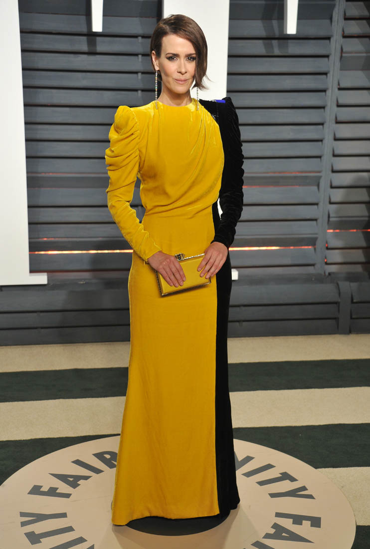 For now though, as we saw from Thandie Newton’s example, many of the more edgy (and amazing) looks from Oscar night showed up at Vanity Fair. Including this bombass half yellow half black dress on Sarah Paulson.