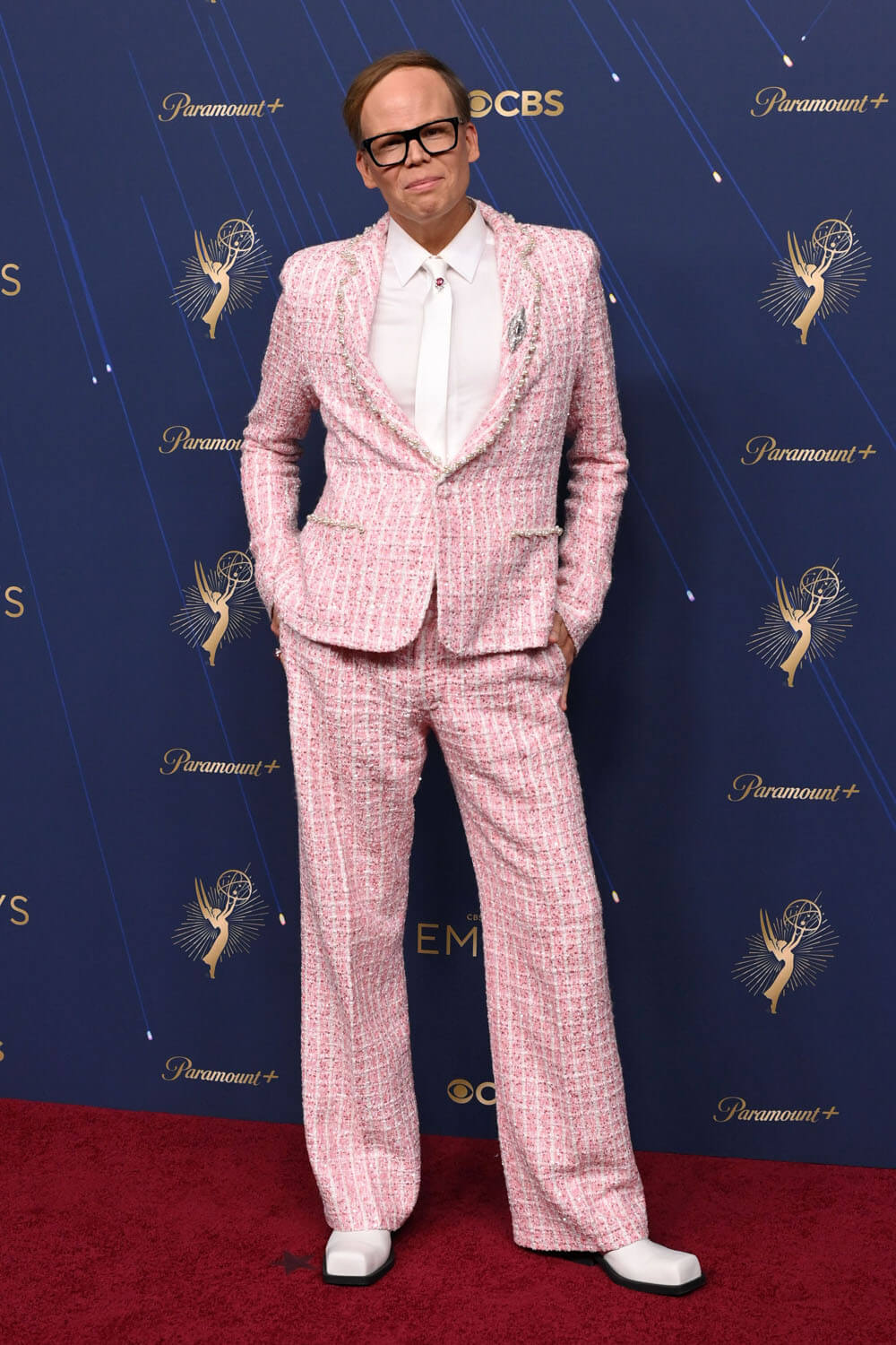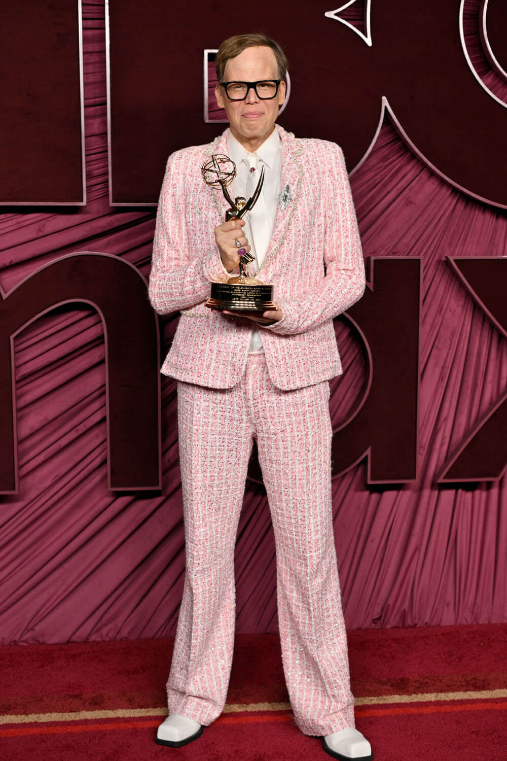 When comedian Jeff Hiller won his first Emmy for his role as Joel on the HBO series Somebody Somewhere, I cheered for a gem of a performance from a gem of a show winning against more brand-name competition—he beat out Ike Barinholtz, Colman Domingo, Bowen Yang, Ebon Moss-Bachrach, Michael Urie, and Harrison F-cking Ford—but I also squealed at his splendid pink tweed tuxedo with pearl embellishments. I thought it was Chanel, but it is actually from Project Runway alum Tyler Neasloney’s Dear Tyler label.
