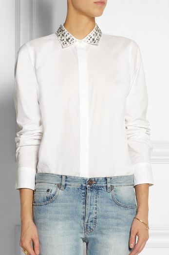 All you need to do next is just throw on a white button up shirt. Easy. You can go with your basic standard style – click here (9) and here (10). Or you can mix things up with a jewelled collar (11) or even a heart collar (12). YES!