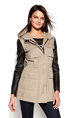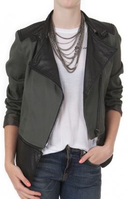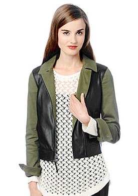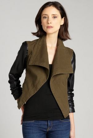 That green jacket with leather sleeves Sandy wore in Lifestyle makes me want to punch myself in the face. Could you find it please? and maybe some other options, too?