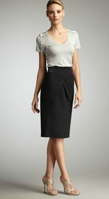 I know a lot of you work in the corporate world which doesn’t allow for a lot of office flare, but a good way to add some fun while still keeping appropriate is with a little shimmer – take a peek at two great polished pencil skirts here and here.