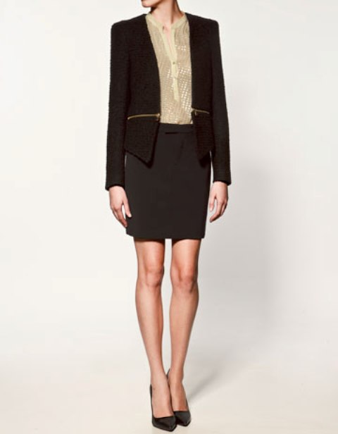 Before I really get going I was looking through the Zara site and saw a couple that caught my eye. If you want a similar cut with some colored cuffs like Zooey then click here, but if the pocket detail is what you like then look-y here. Sure, neither is blue, but whatever, I’m just trying to throw you a bone.