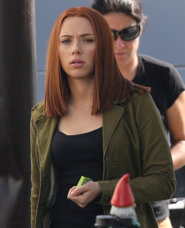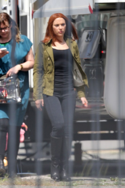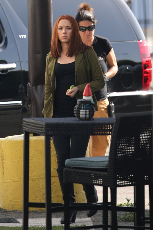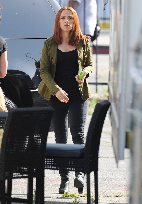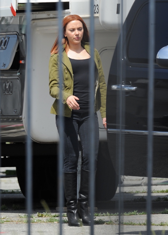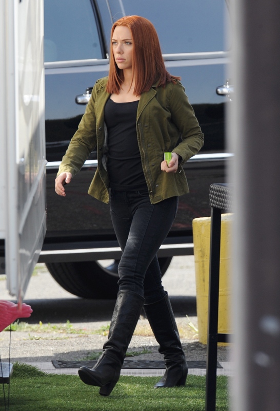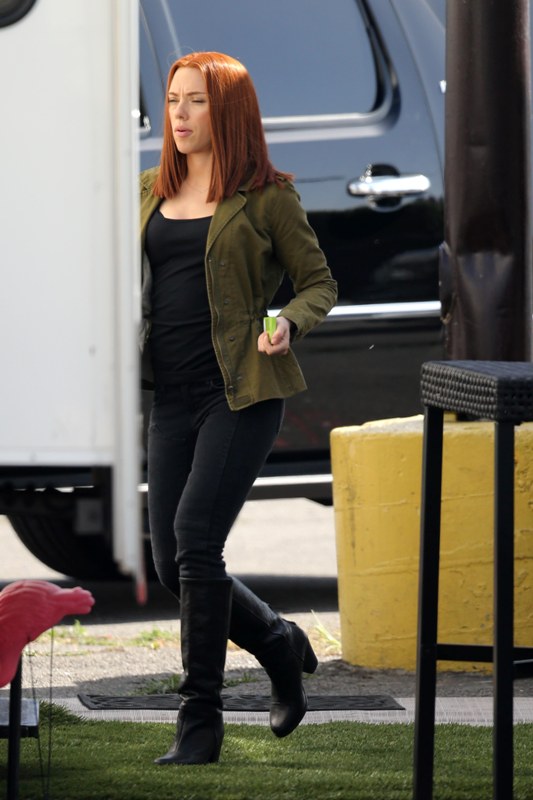 Here’s Scarlett Johansson on the set of Captain American: The Winter Soldier yesterday in LA. This will be the third time she plays Natasha Romanov, Black Widow. As Sarah wrote earlier this month, “The Winter Soldier is all tangled up in the Black Widow’s backstory” and while, unlike Sarah, I don’t speak nerd, I’m guessing it has something to do with all that “red in my ledger” she kept going on about in The Avengers.